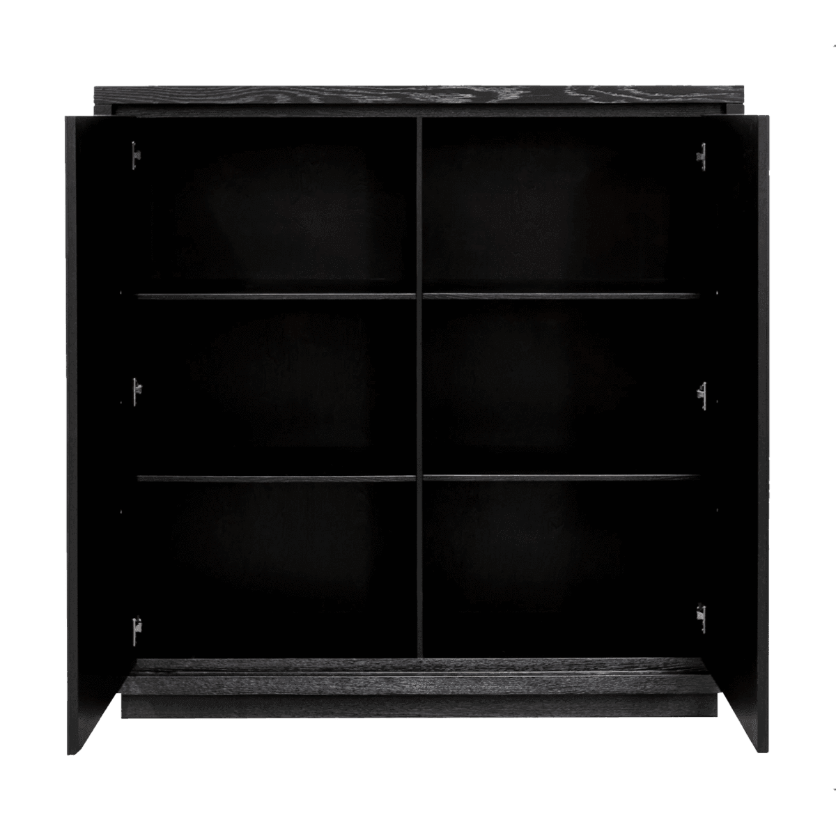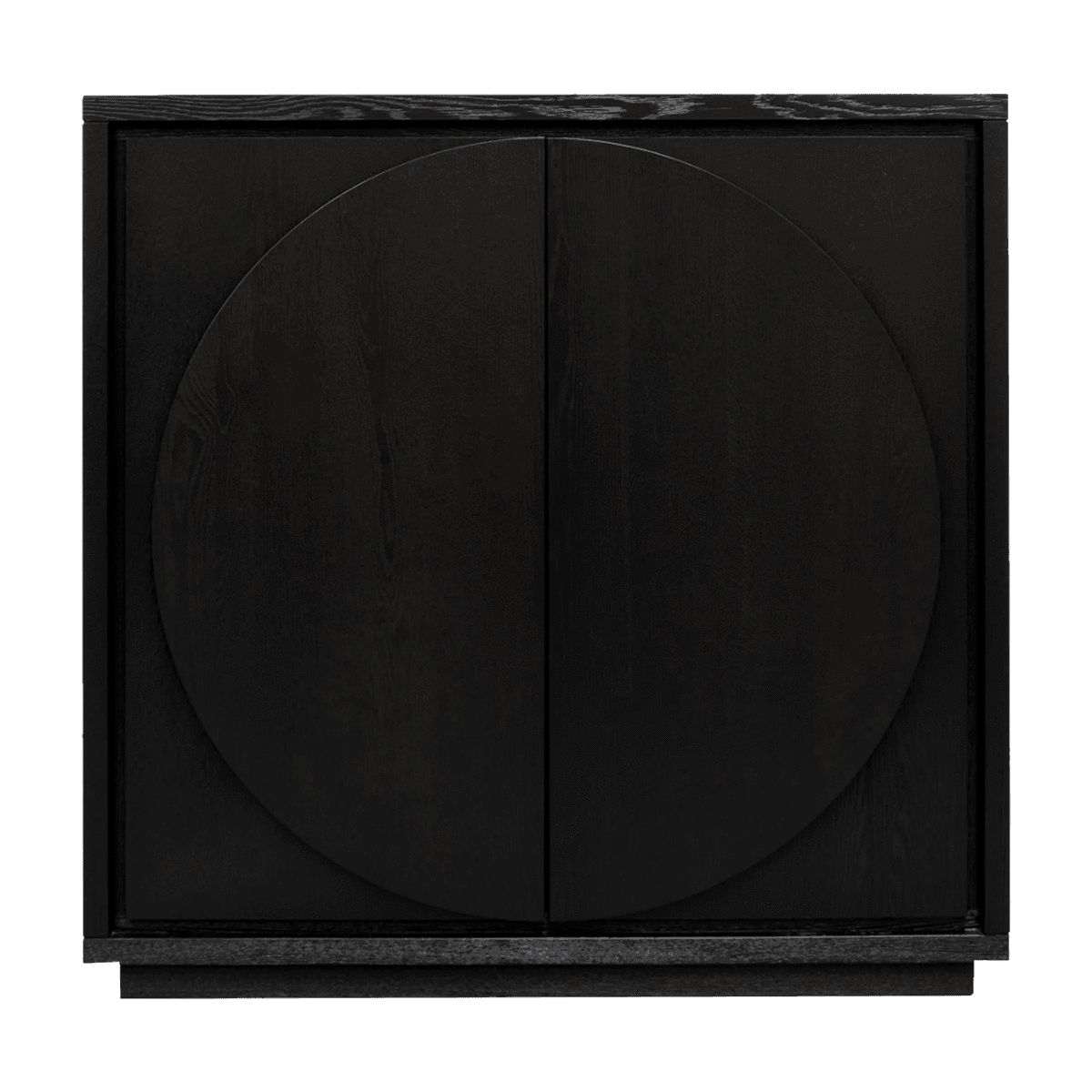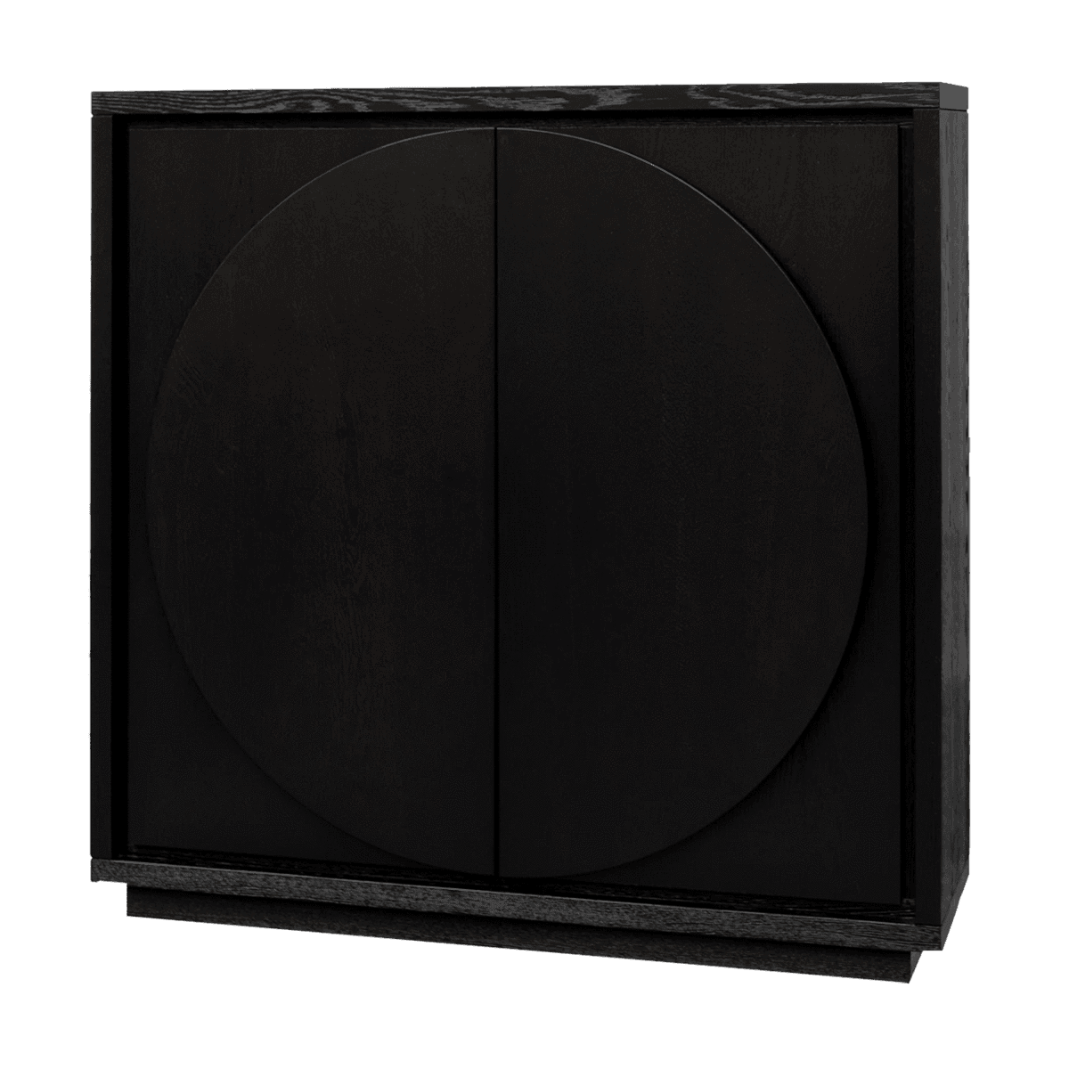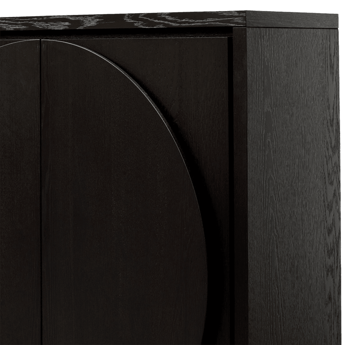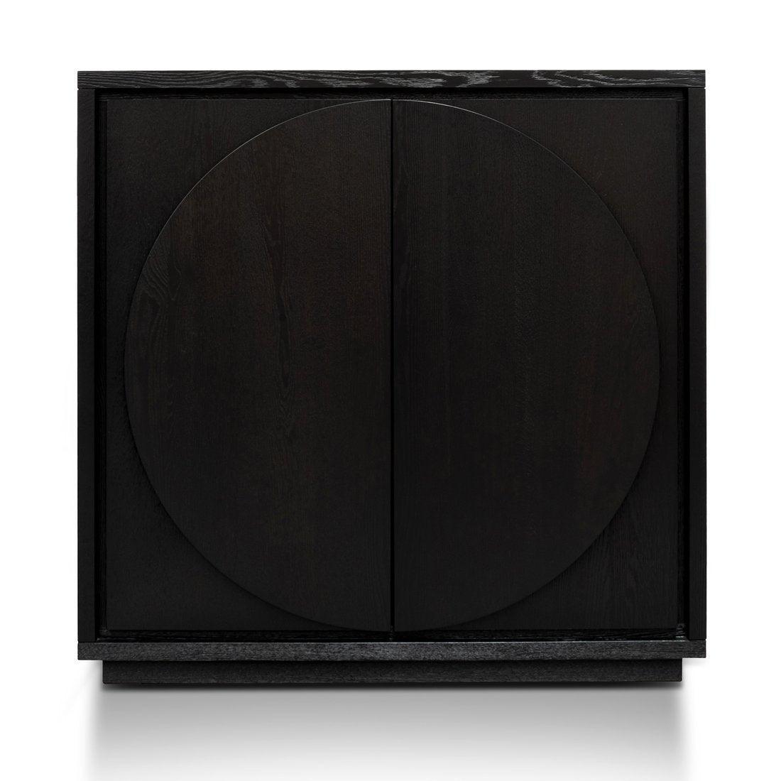 Crescent Ebony Oak Large Cabinet. Gorgeous solid oak wood cabinet featuring 2 half-moon handles and 6 fixed internal shelves in a textured ebony finish.