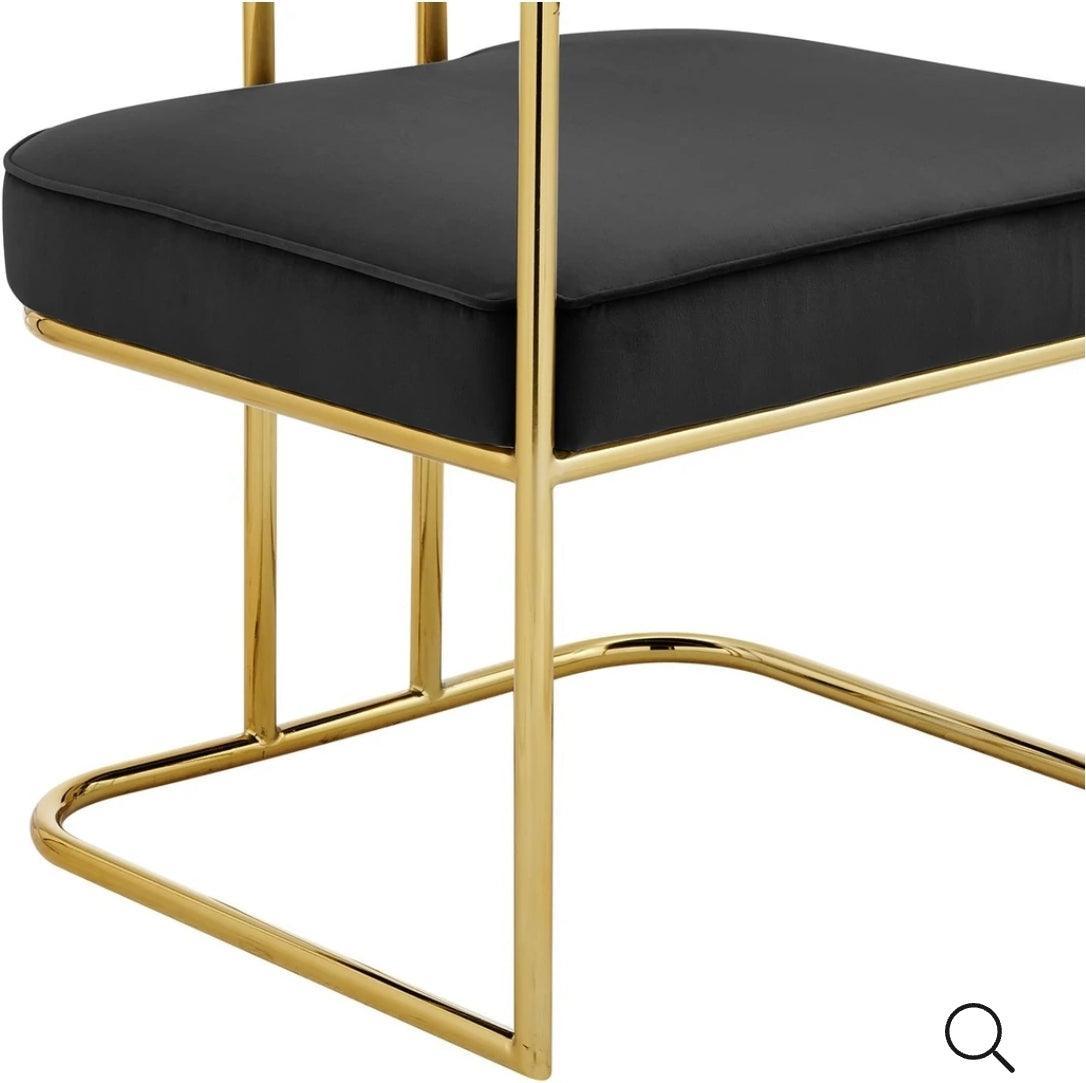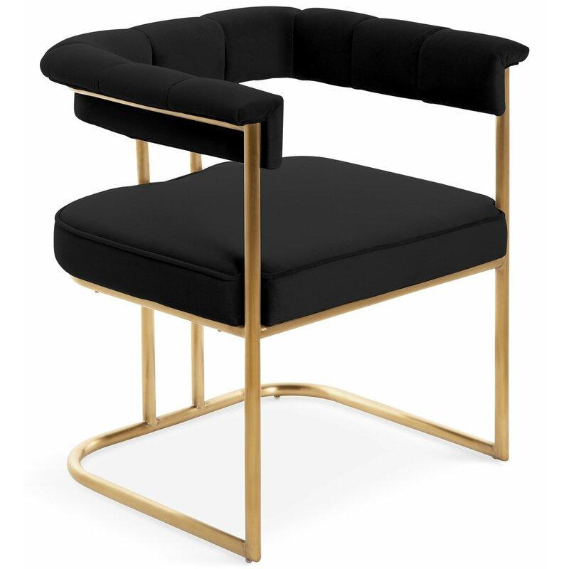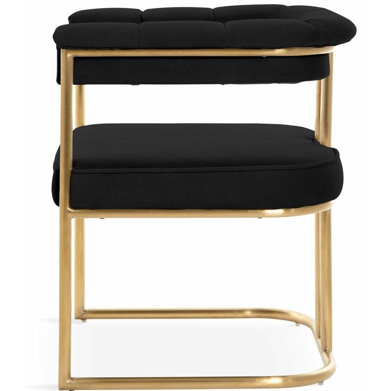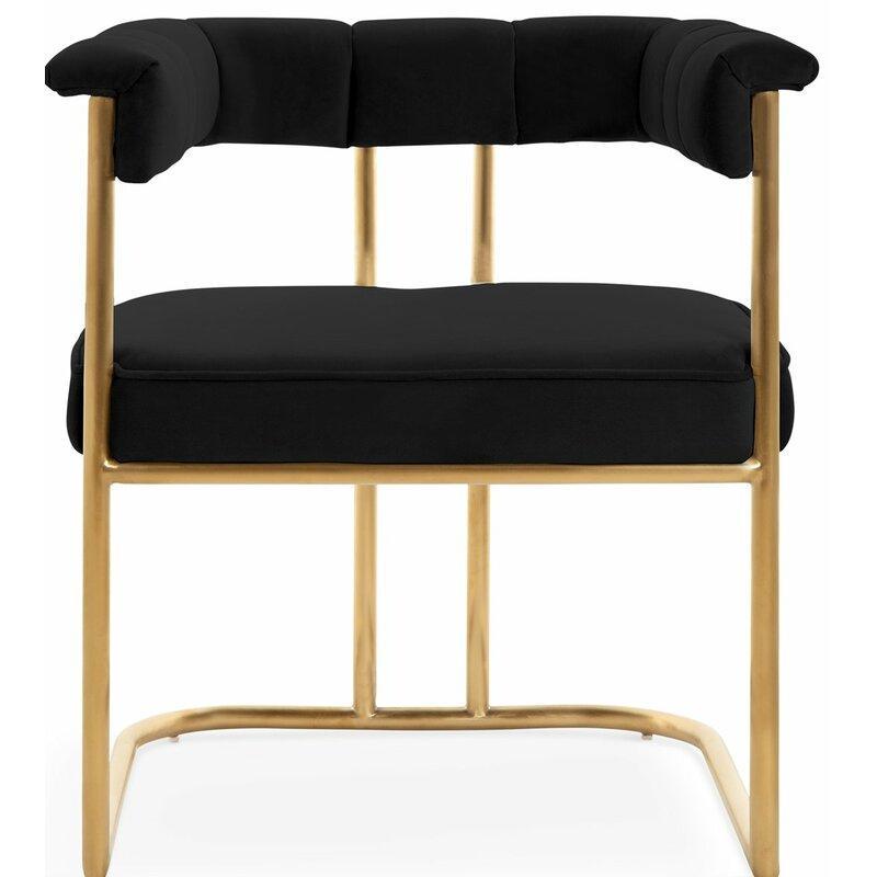 Introducing the Dahlia dining chair with a gold tone frame with open back creates a sleek and modern feel. An upholstered velvet seat and channel-tufted back that runs through the arms to maintain the comfort you need.