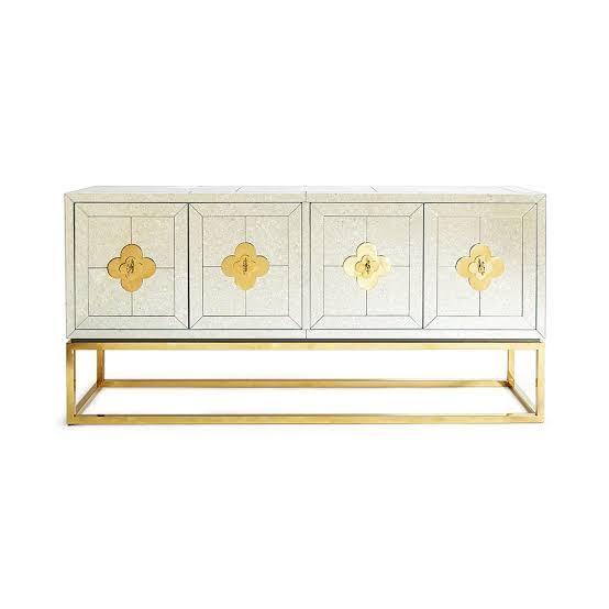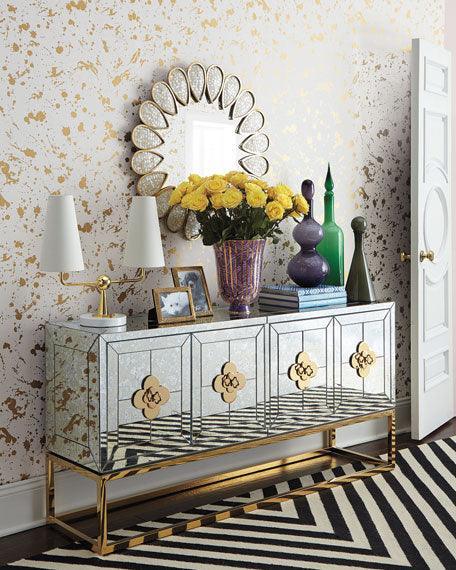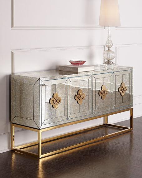 Minimalist forms meet Maximalist glamour. Antiqued mirror with a polished brass base. Two double-door compartments open to reveal a bright robin’s egg blue interior fitted with two adjustable shelves. Quatrefoil handles and escutcheons add a decorative flourish to the simple form. Use our reflective Delphi collection buffet as a storage buffet in your dining room, place it behind your sofa as a chic console, or give your foyer the gift of glamour.
