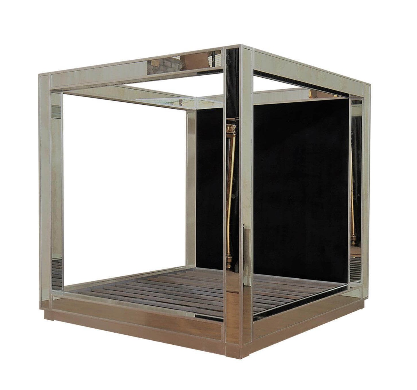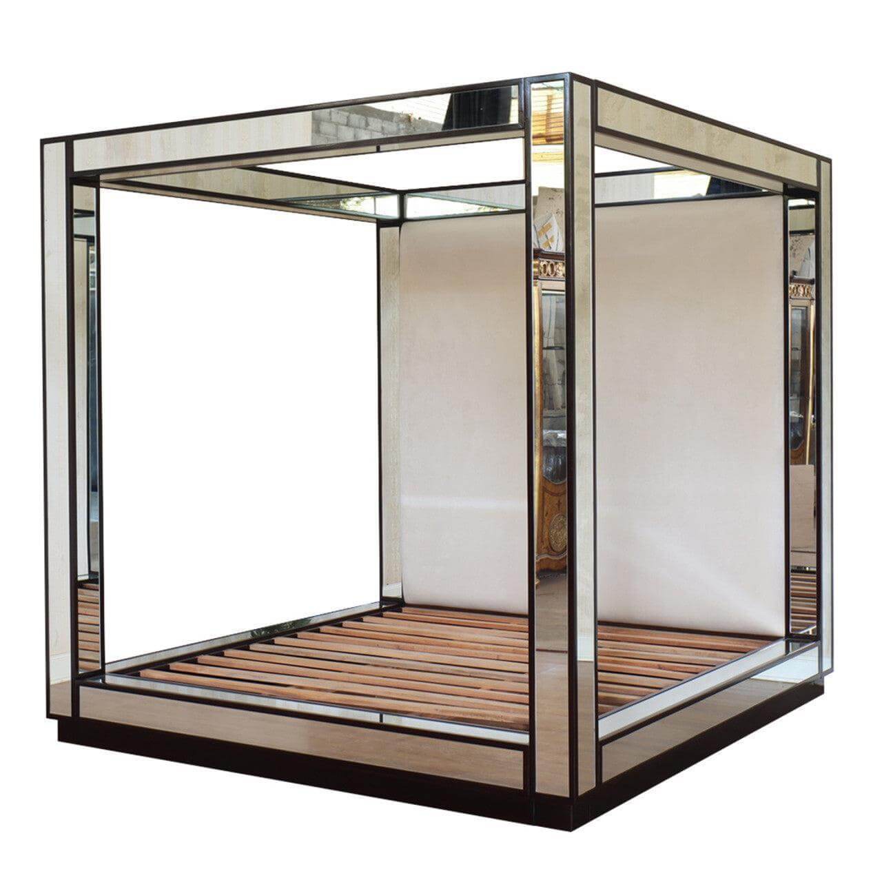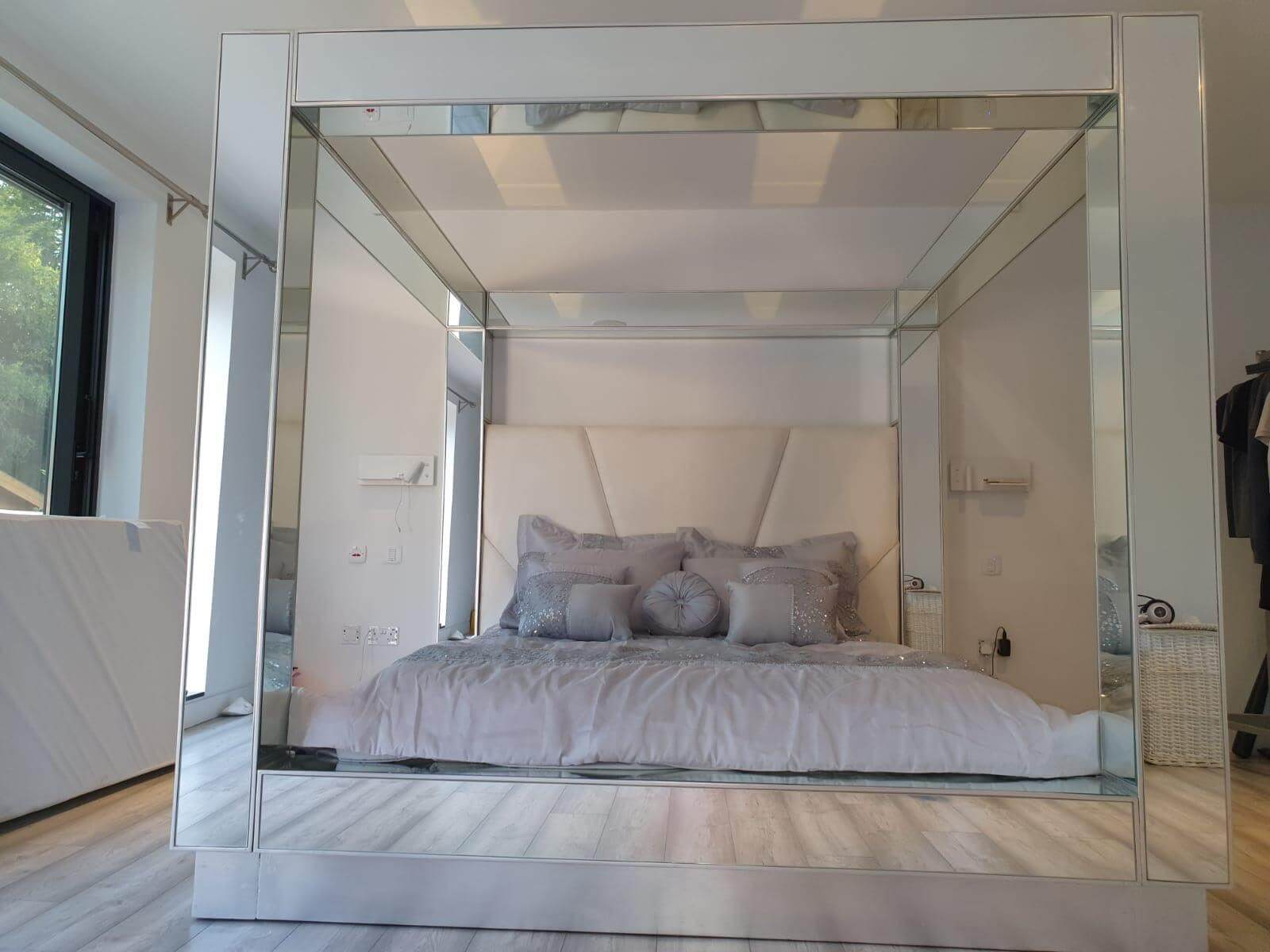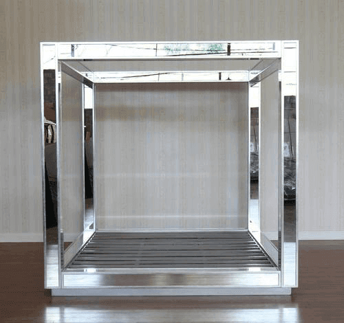 The Designer Collection Mirror Canopy Bed is a The Ultimate in designer luxury. Bespoke mirror Luxury design with Hollywood Regency Glamour. This stunning bedroom collection embodies Luxury Mirrored furniture style. The Designer Collection is handcrafted with Bespoke mirror and Handcrafted Mahogany wood. This Canopy Mirror Bed is the perfect fashion statement that can be styled with our Mirrored furniture for glamourous Hamptons, Hollywood Regency style bedroom set. The Designer Collection Canopy Bed has been featured in Top fashion publications including Vogue Home, Home and Living, Architectural Digest. Available in Clear mirror or Antique finish mirror, bevelled mirror edge (gold, silver wood trim also available)