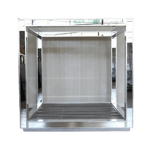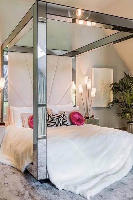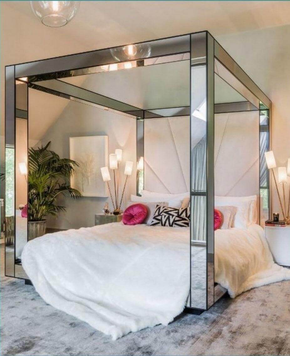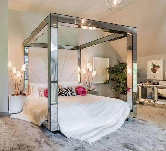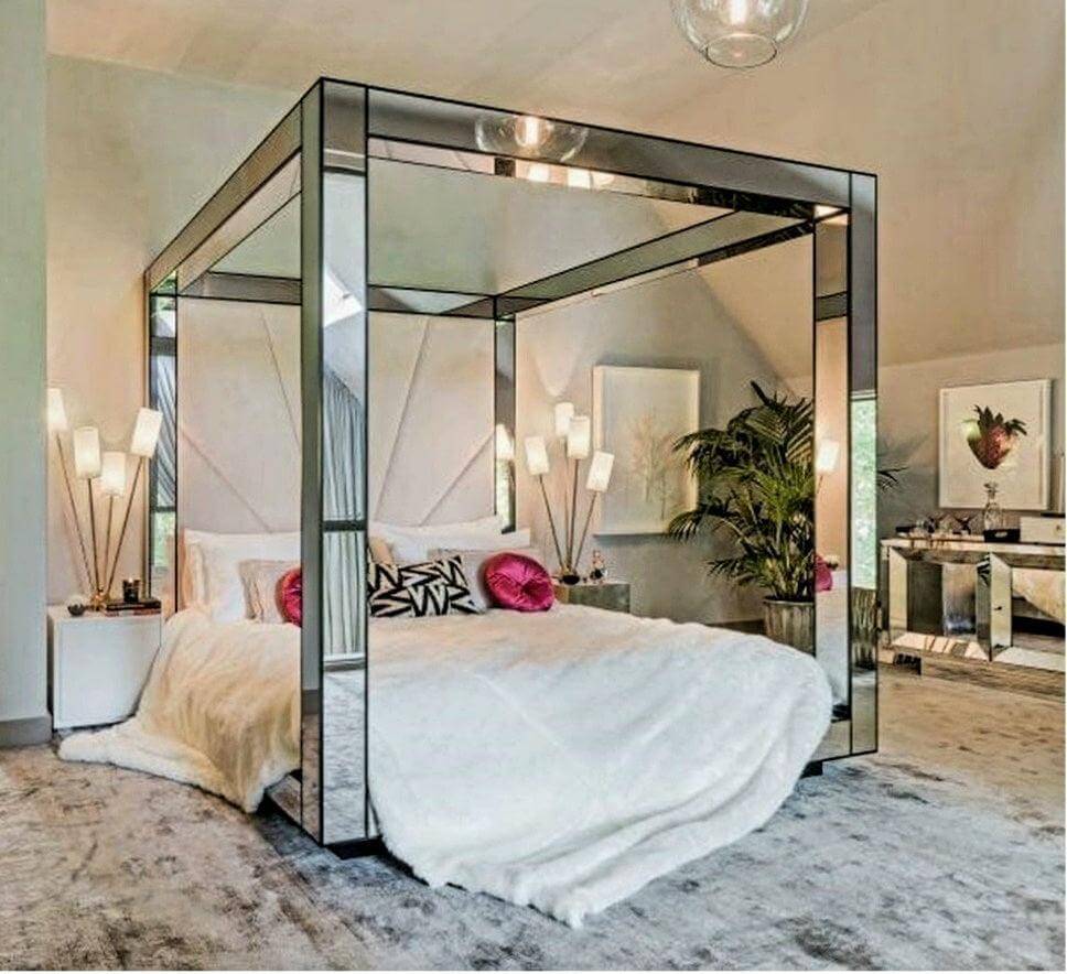 The Designer Collection Mirror Canopy Bed is a The Ultimate in designer luxury. Bespoke mirror Luxury design with Hollywood Regency Glamour. This stunning bedroom collection embodies Luxury Mirrored furniture style. The Designer Collection is handcrafted with Bespoke mirror and Handcrafted Mahogany wood. This Canopy Mirror Bed is the perfect fashion statement that can be styled with our Mirrored furniture for glamourous Hamptons, Hollywood Regency style bedroom set. The Designer Collection Canopy Bed has been featured in Top fashion publications including Vogue Home, Home and Living, Architectural Digest. Available in Clear mirror or Antique finish mirror, bevelled mirror edge (gold, silver wood trim also available)