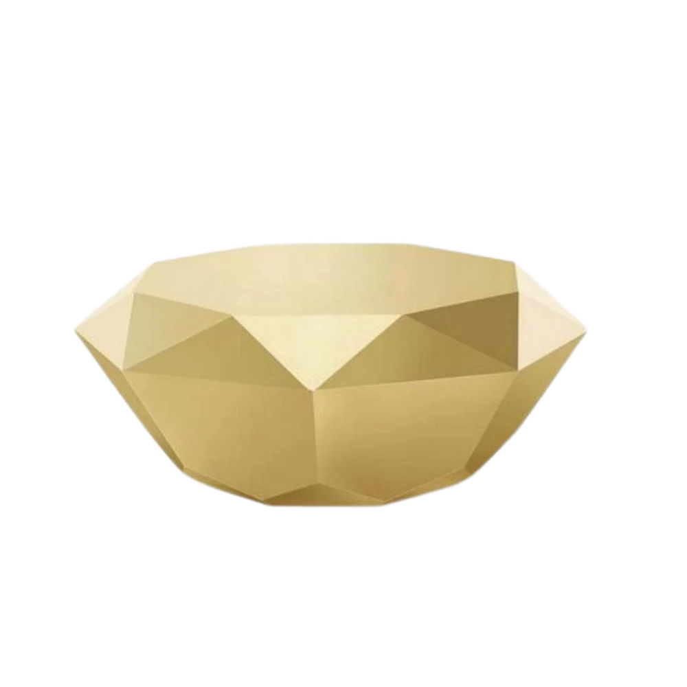 Geometric lines and an abstract diamond shape form this stunning circular coffee table. Finished in high-shine gold with a mirror-like effect. Custom metal finishes available.