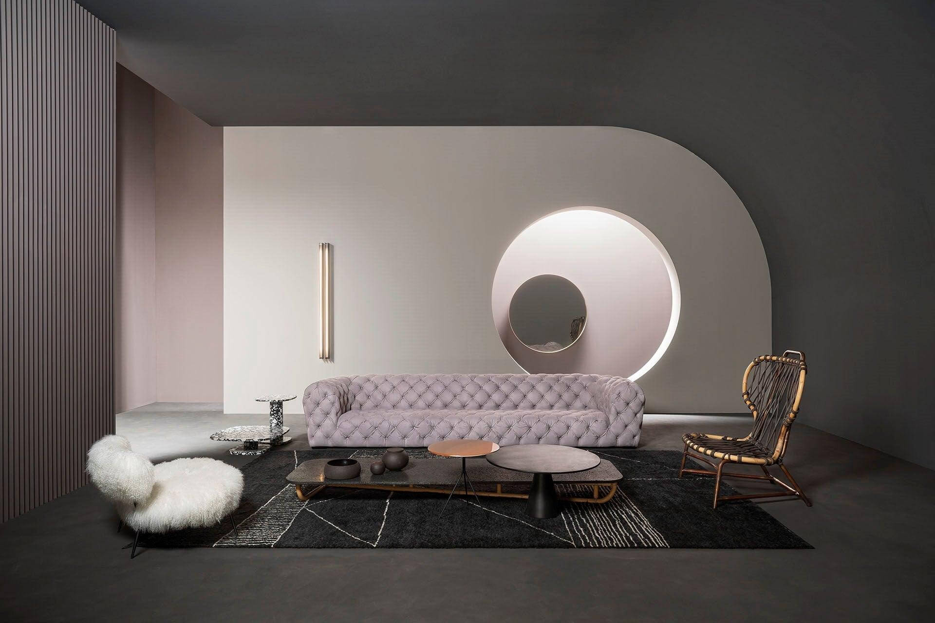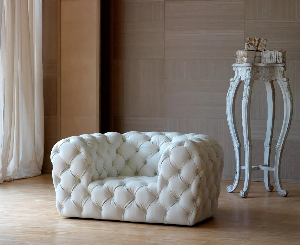 The Chesterfield Moon single sofa, on sale in our showroom, is a timeless beauty piece of furniture, modern and elegant at the same time. It has an unmistakable shape, characterized by the inimitable quality of rich velvet. Custom fabrics options available.