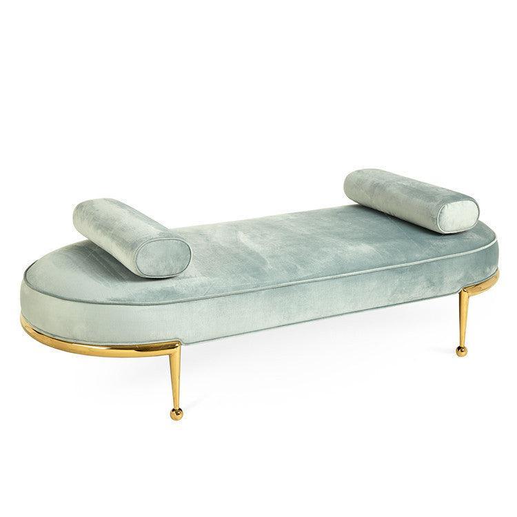 • Dolce Light Teal Velvet Gold Sofa Bench Ottoman