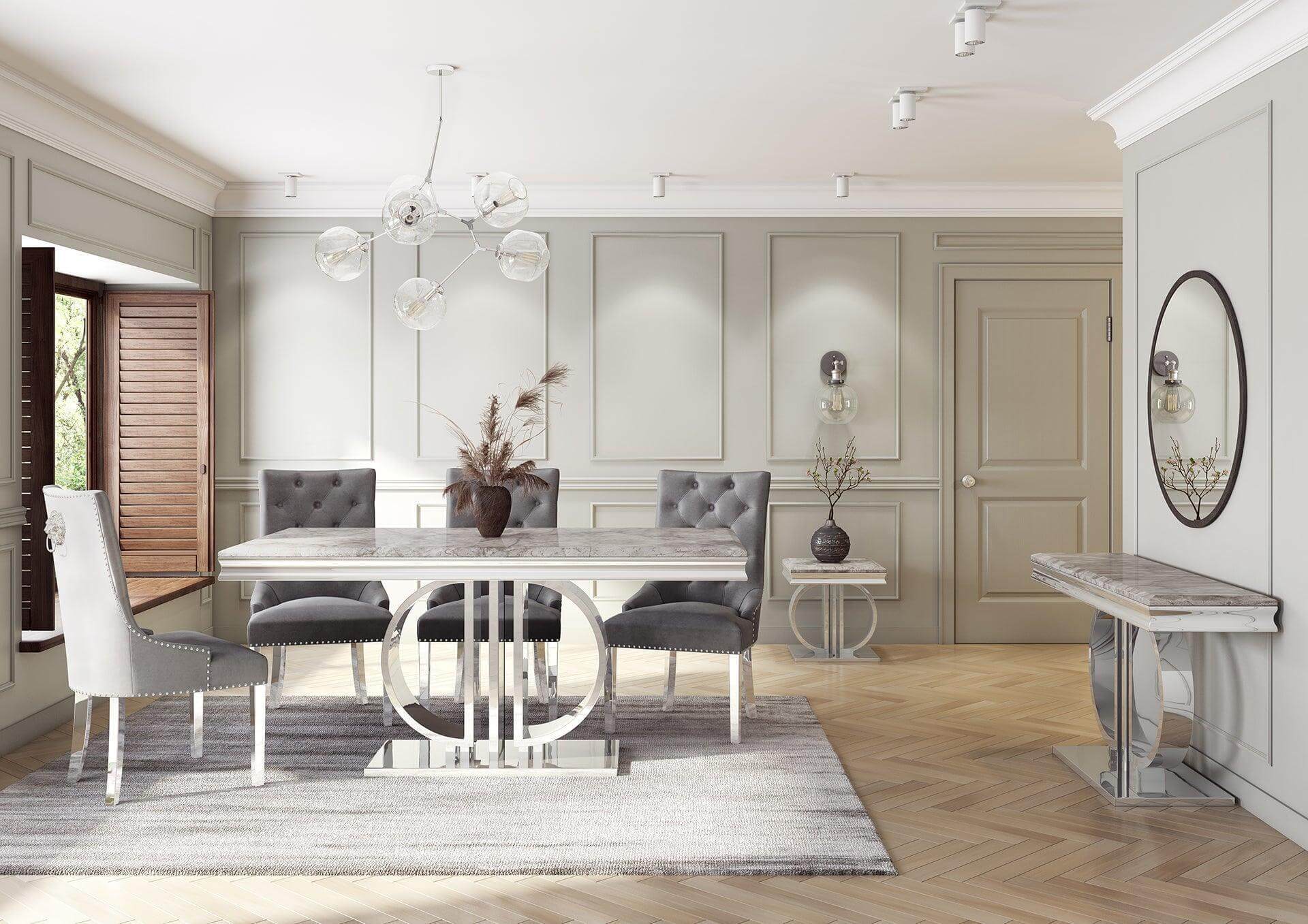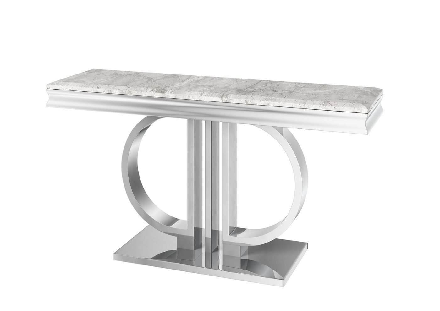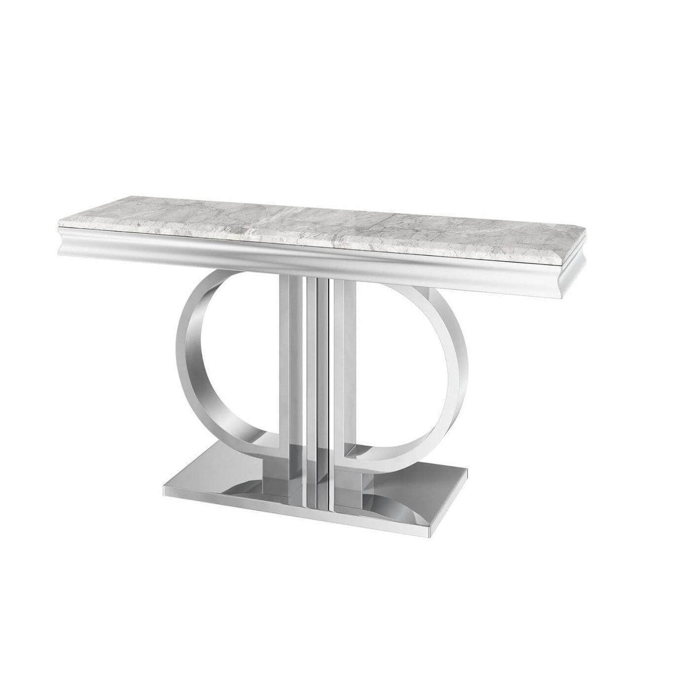The Donatella range consists Thick Swooping Polished Stainless Steel Legs And Grey Marble Top. Fabulous Complimentary design with Marble top and Stainless Steel. Matching designs available including dining table, coffee table, console table and side table Donatello Console Table