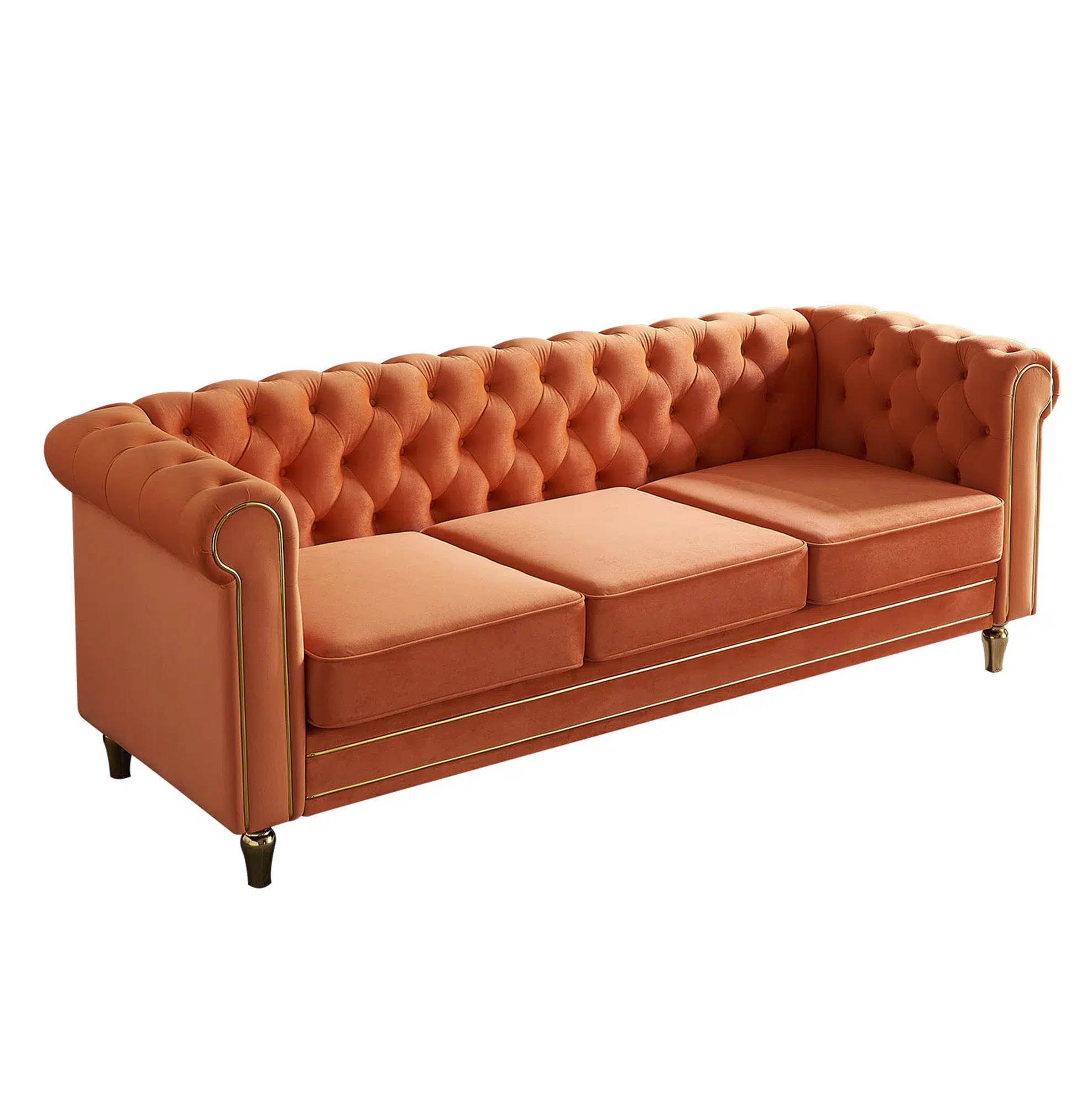 Elevate your living room with timeless elegance and modern glamor through our 84.65″ Rolled Arm Chesterfield Sofa. Designed as more than just seating, this iconic silhouette brings luxurious charm and sophistication to any space. Featuring rolled arms adorned with gold strip trim, deep button-tufting, and gold electroplated metal legs