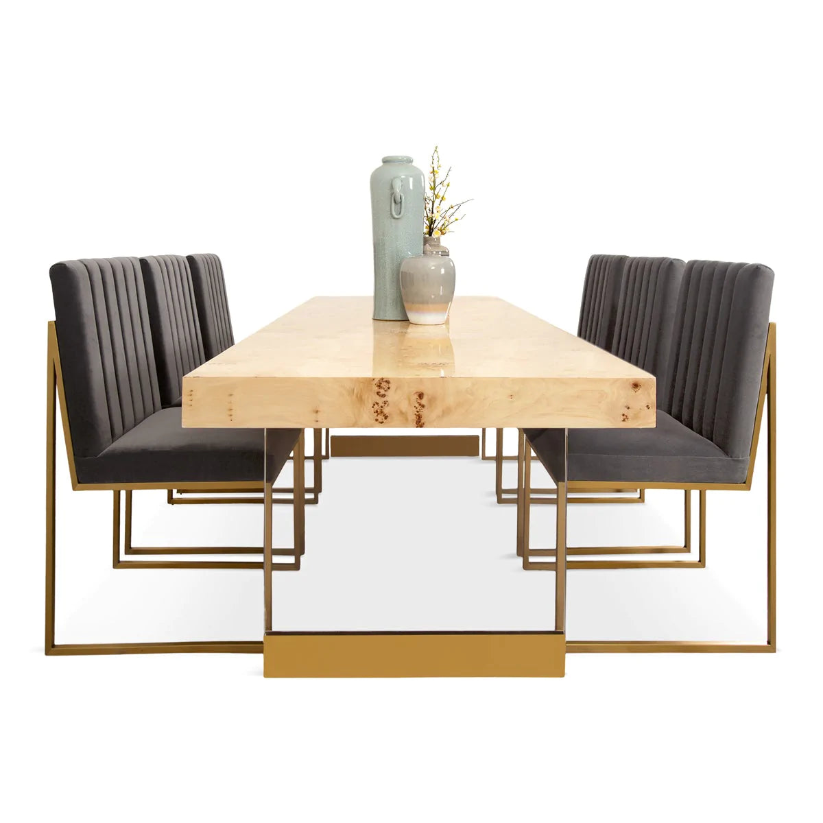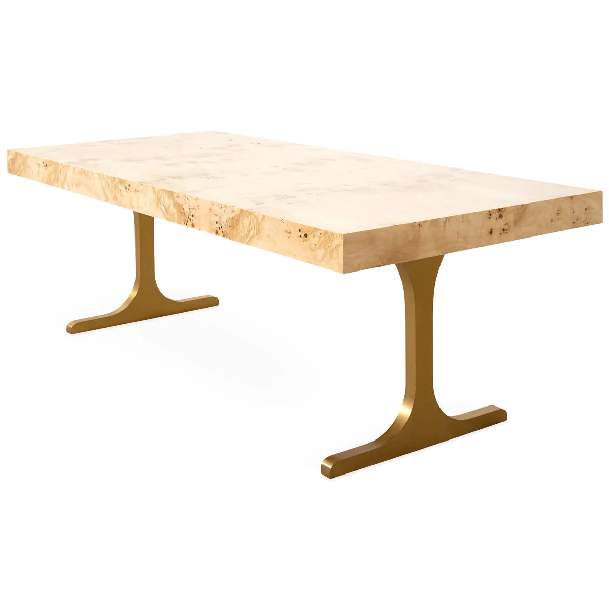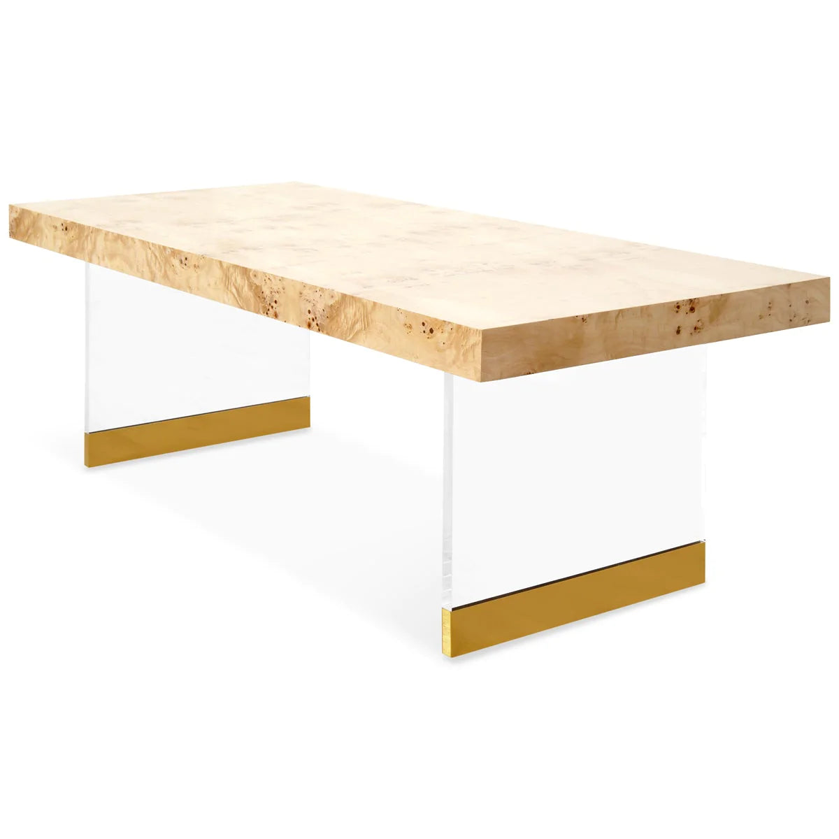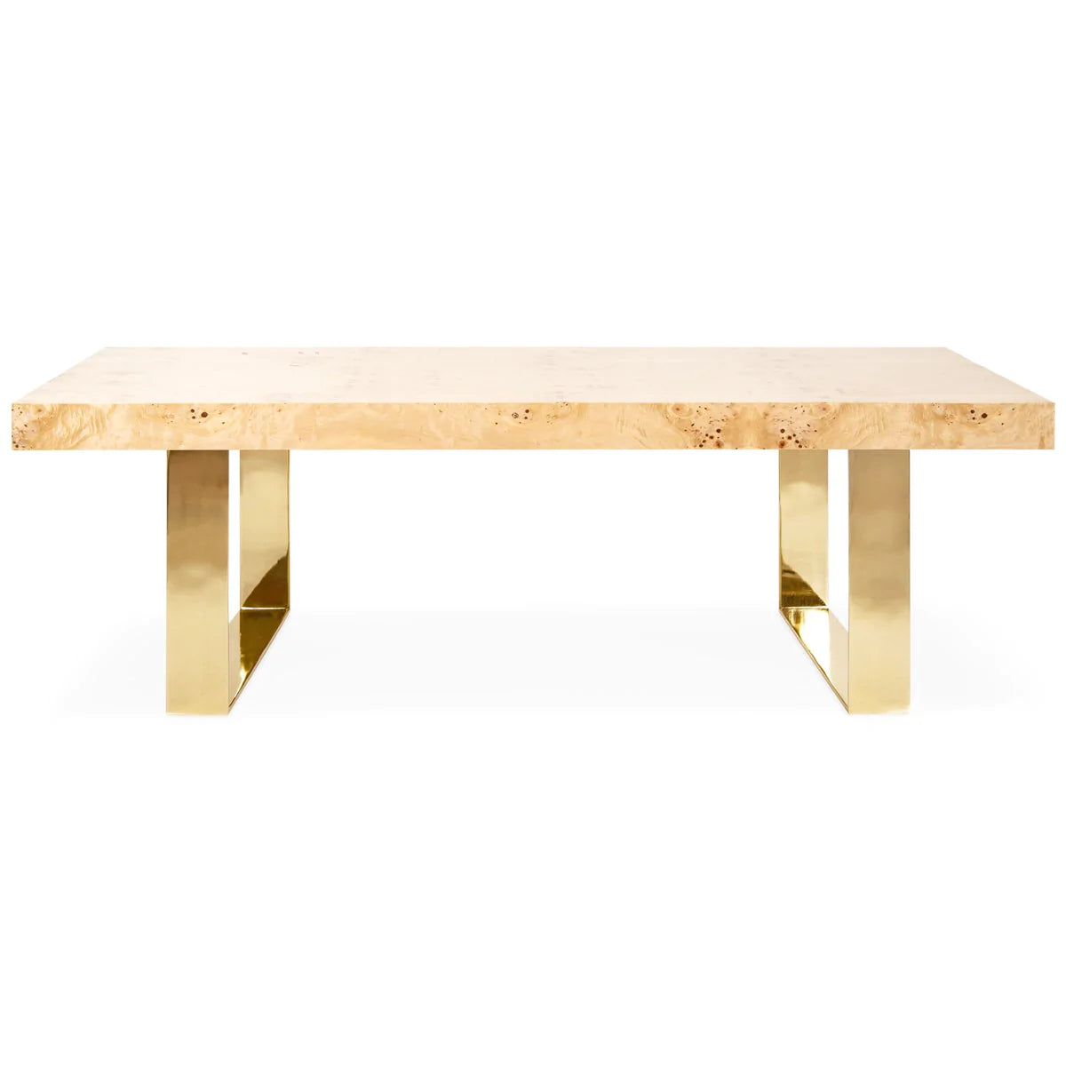 This collection combines a simple Art-Deco inspired silhouette with the mesmerizing swirling pattern of natural burl-wood veneer. Adorned with brushed-brass accents, this beautifully detailed collection exudes an elevation of richness.