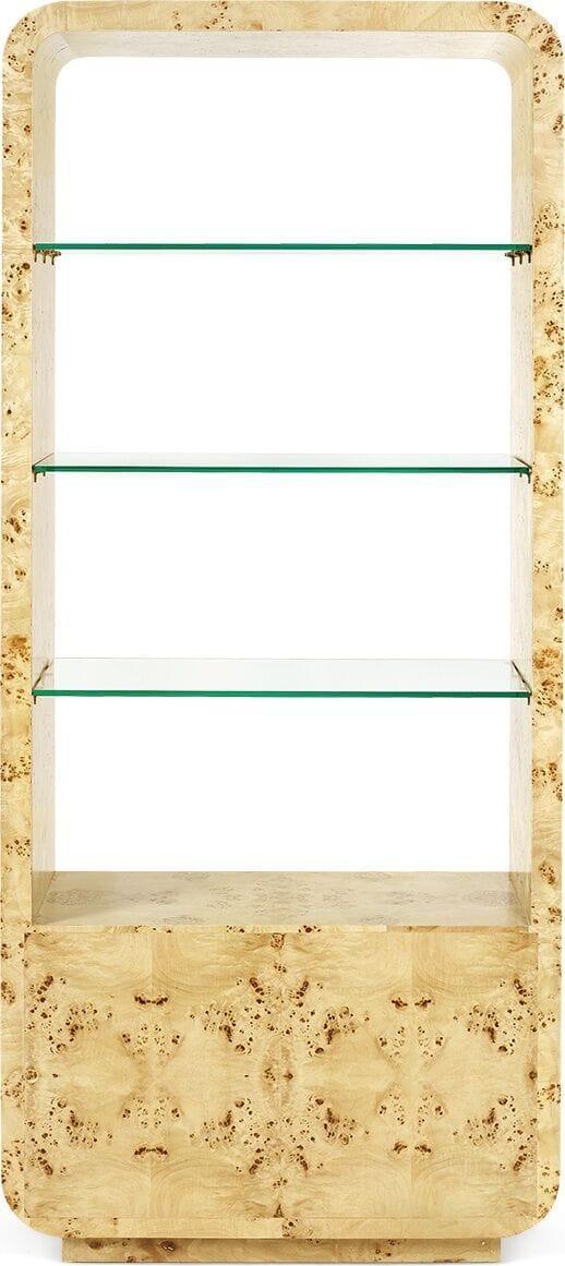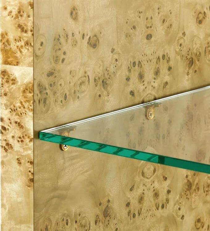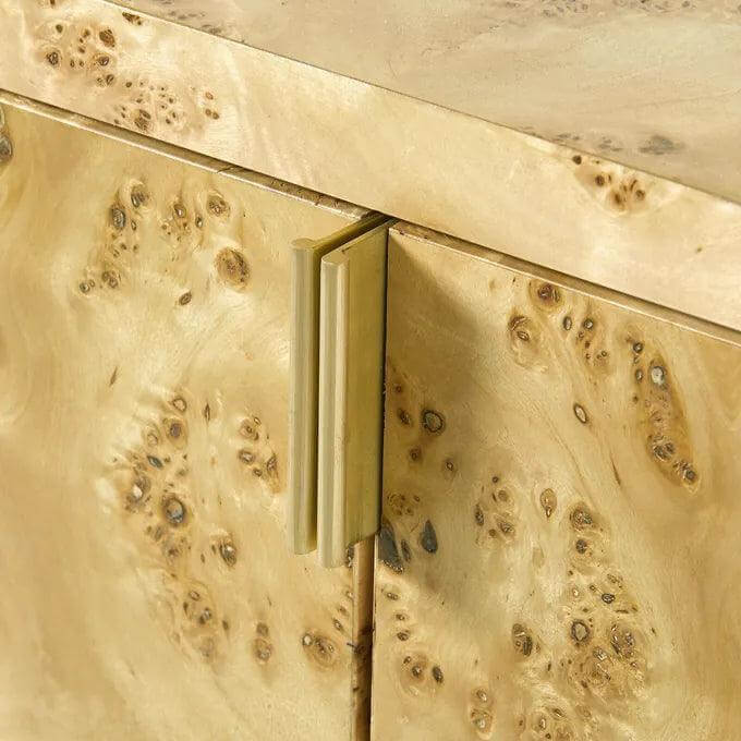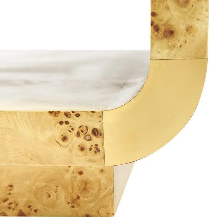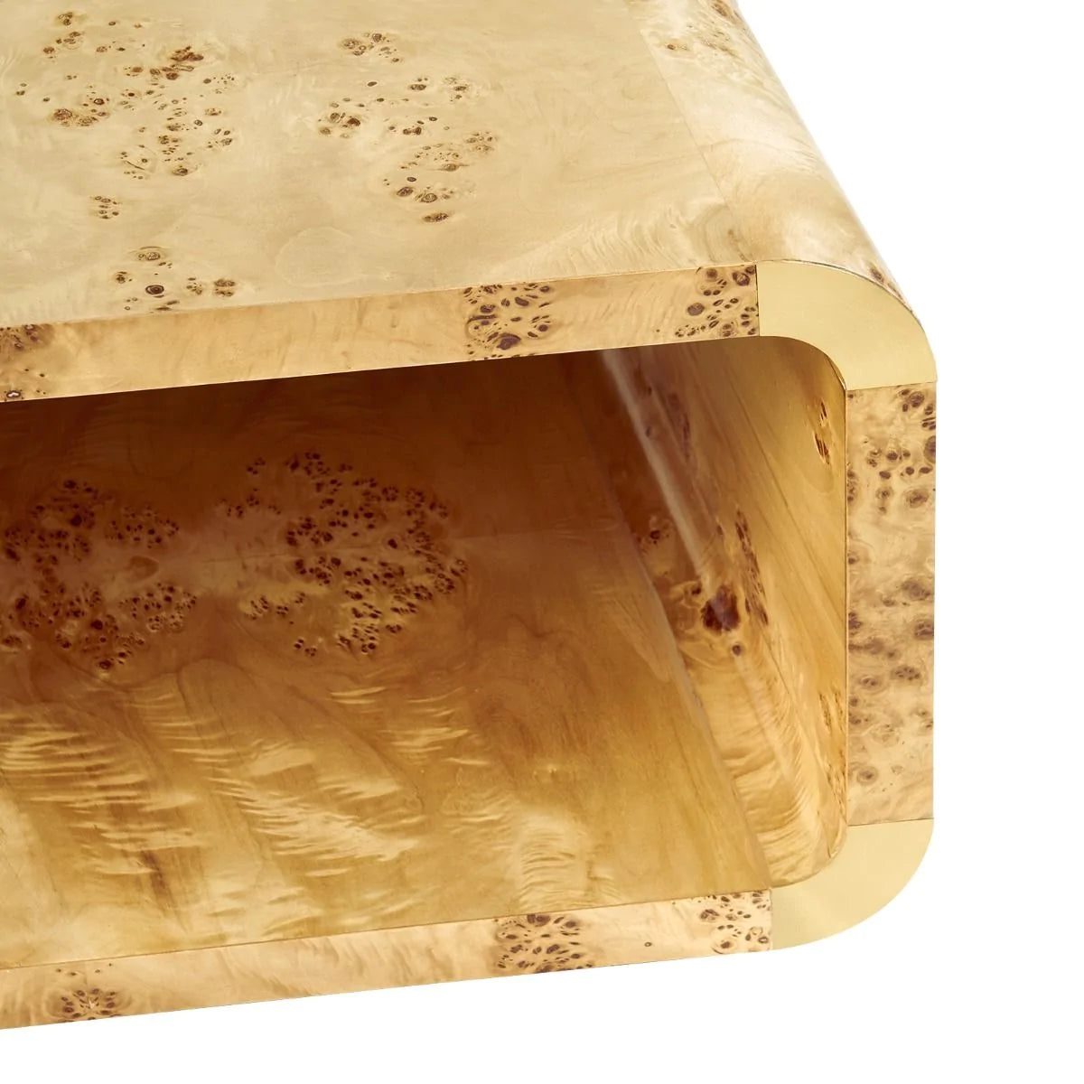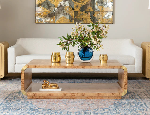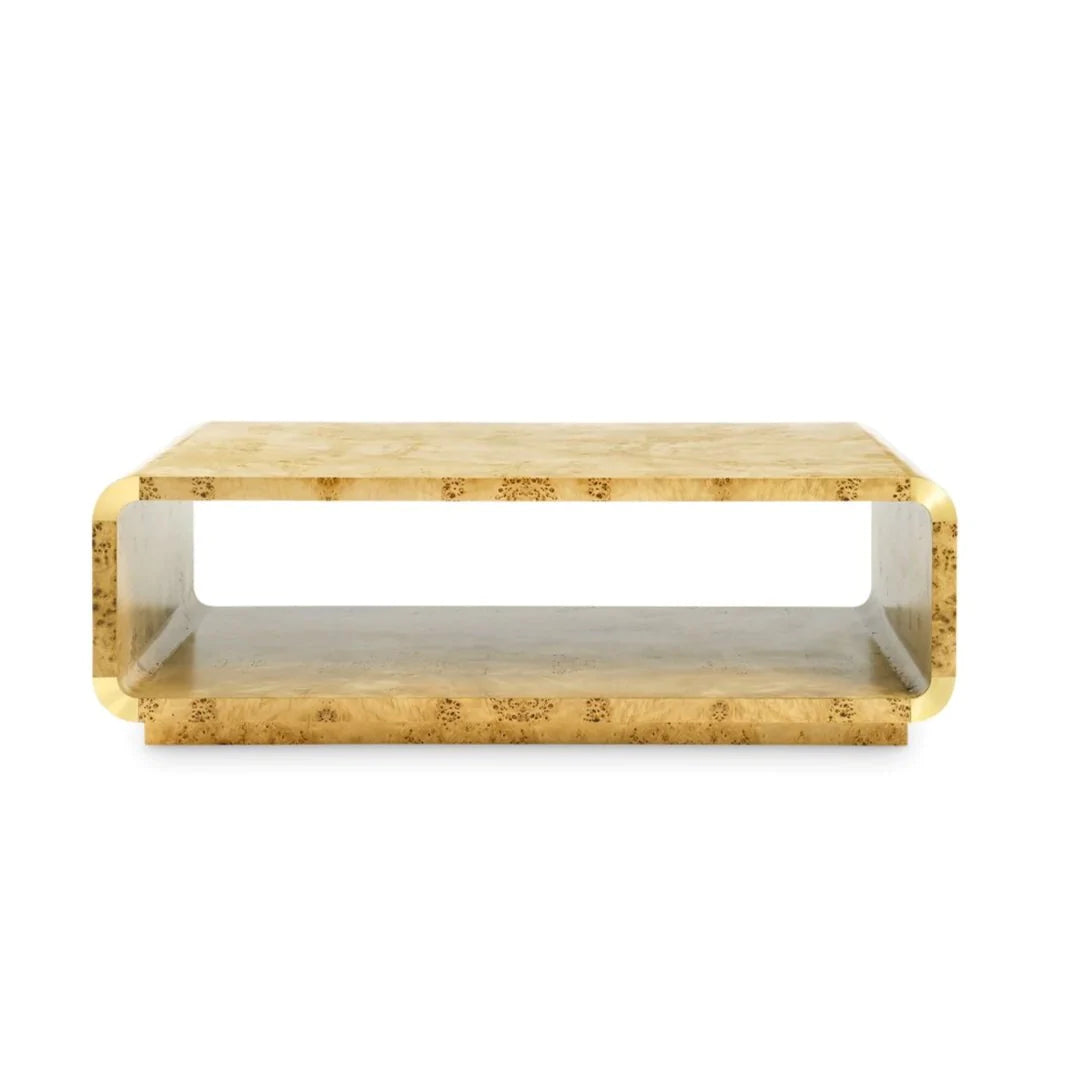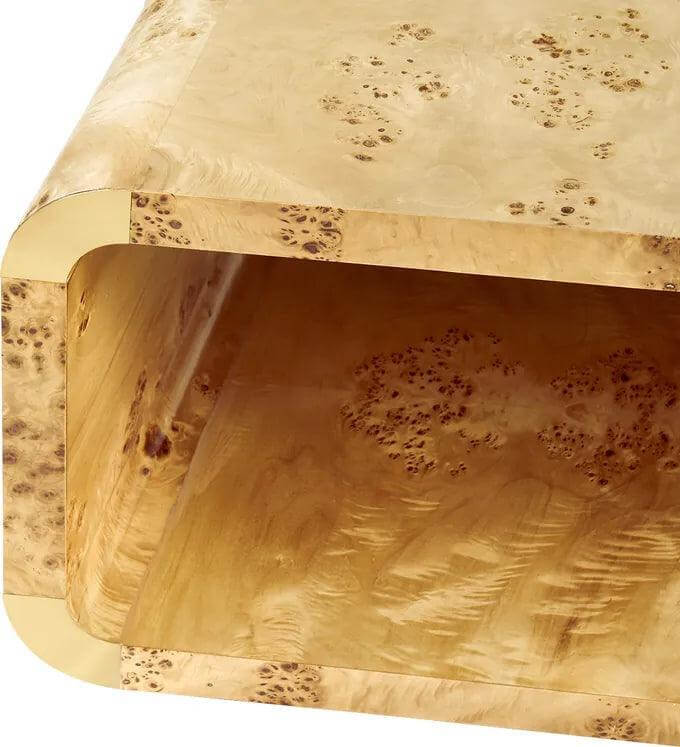 This coffee table features an Art-Deco inspired silhouette with mesmerizing swirling pattern of natural burl-wood veneer. Adorned with brushed-brass accents, this truly is a beautifully detailed piece.