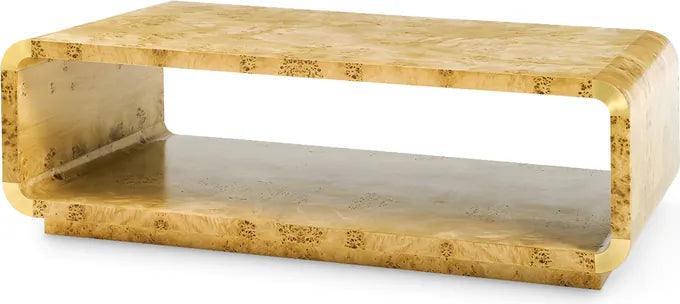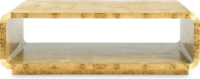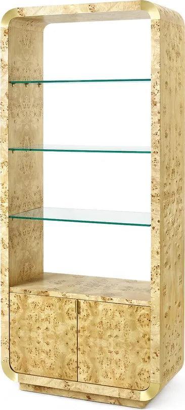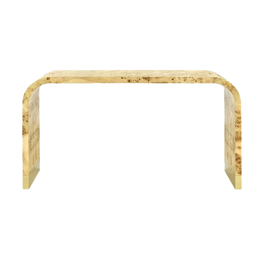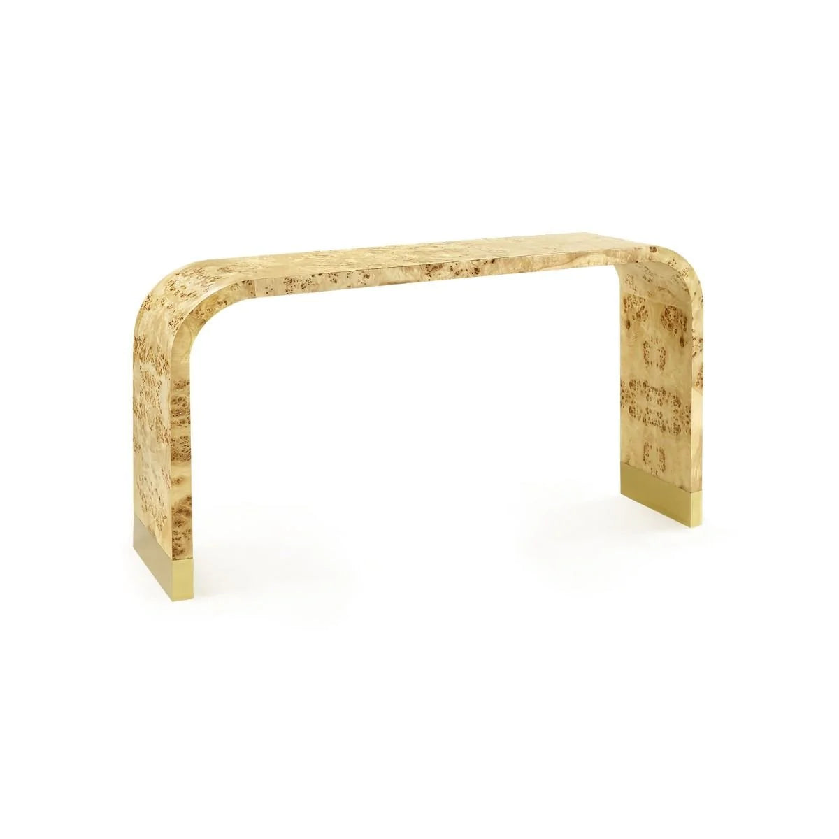 We love our Emilio Collection for its embrace of retro silhouettes and cosmopolitan style. The naturally vibrant patterns found in burl wood have a distinctively 1970s feel—all kaleidoscopic swirls with a bold sense of cool. Our Emilio Console is the classic embodiment of the beloved vintage waterfall table, with an inherent softness stemming from its seamless, curved design. The sheen of its lacquered finish is matched by the brushed brass accents of its elongated sabots. The Emilio Console can be paired with a plush bench or chair to create a sitting area in a foyer or living room, or simply used a showcase for decorative art, vases, candles, and more. The Emilio Collection exudes elevated richness.