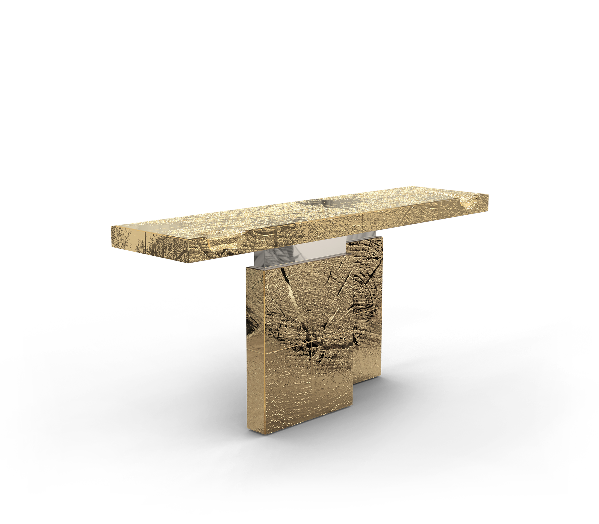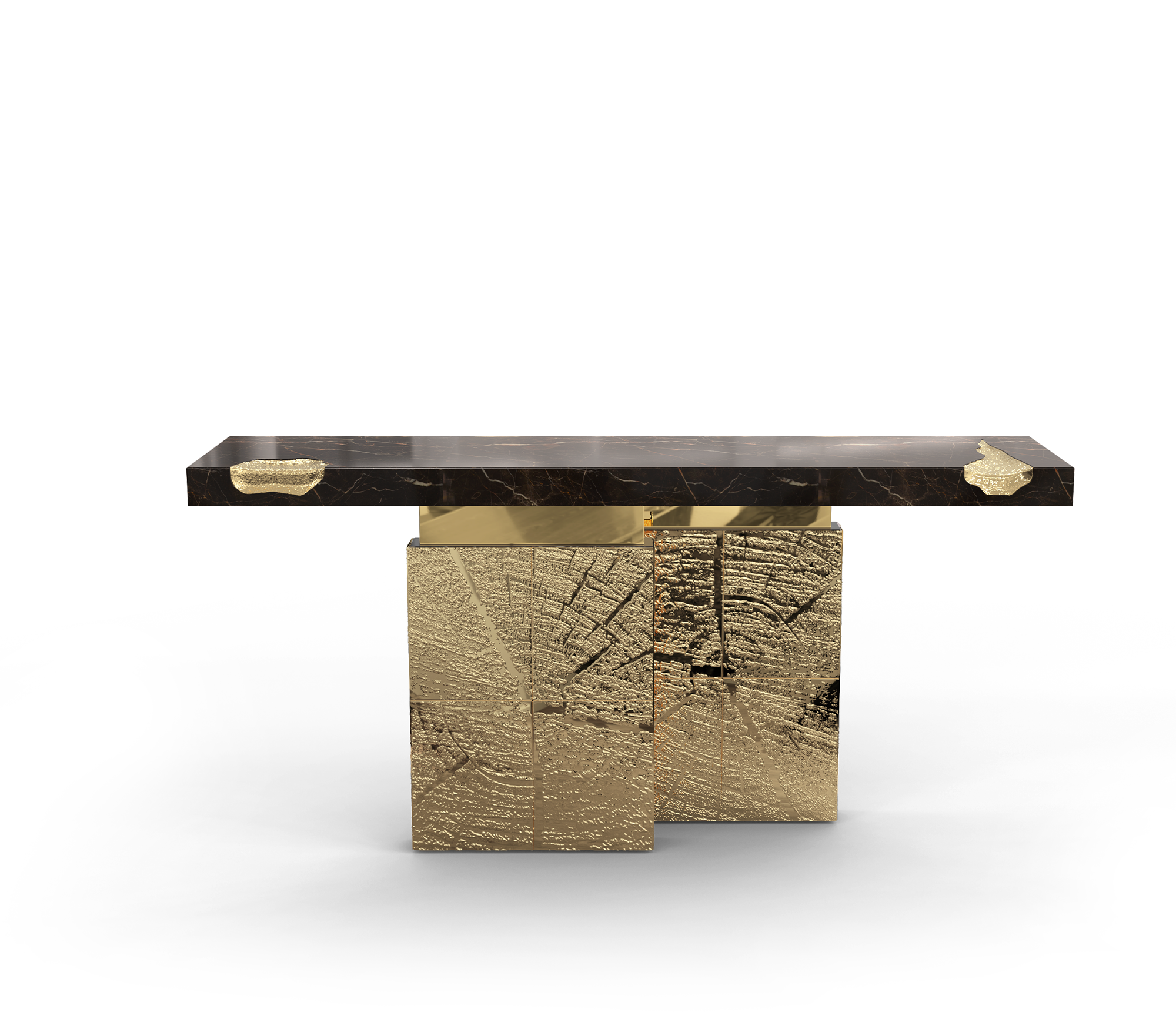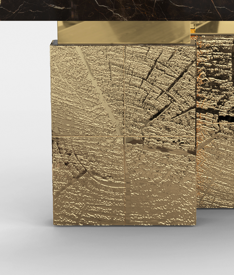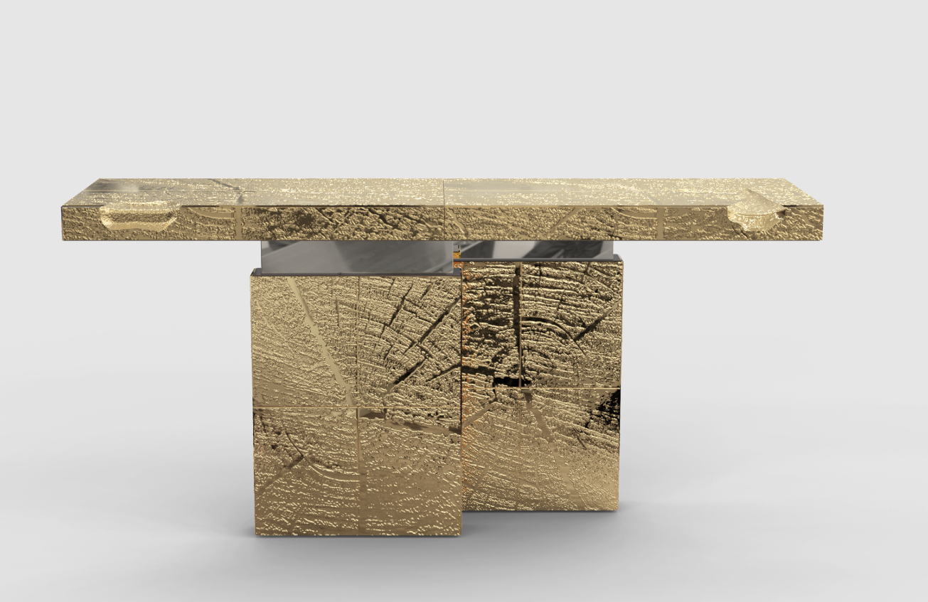The Emperor is a sublime console built polished brass with marble. Its cracks are hand-carved and inserted through polished brass sheets, which are hand-hammered for a unique finish. Designed to make an impression, this unique console is a unique masterpiece that will fit perfectly in exclusive entryways or hallways and empowering spaces. A refined statement piece made for those with refined minds and taste.
