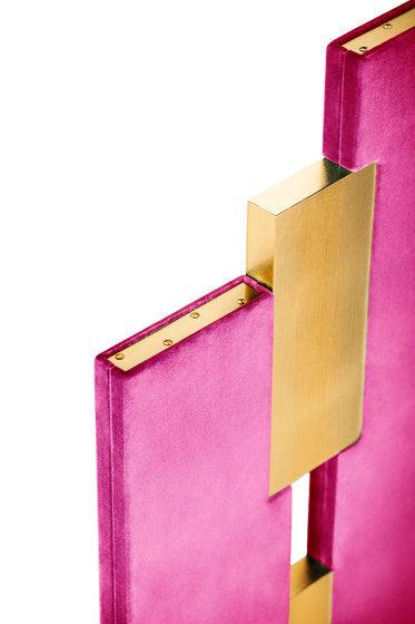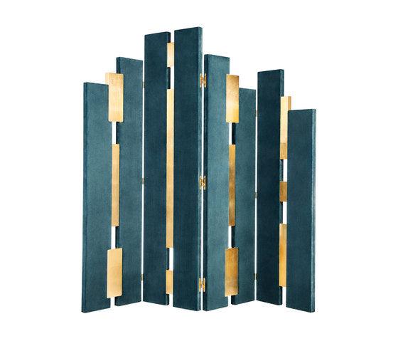 Drawing inspiration from Art Deco and early twentieth century architecture, the Empire’s patterns created by the gold leaf and the sumptuous upholstery texture fashion a dazzling tridimensional sculpture, a visual metaphor for a cityscape. More than a folding screen, a state of mind.