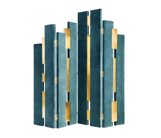 Drawing inspiration from Art Deco and early twentieth century architecture, the Empire’s patterns created by the gold leaf and the sumptuous upholstery texture fashion a dazzling tridimensional sculpture, a visual metaphor for a cityscape. More than a folding screen, a state of mind.