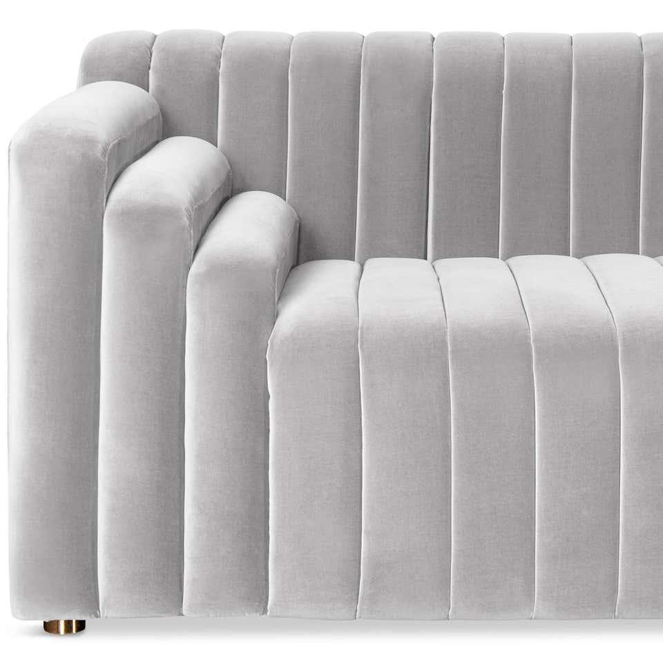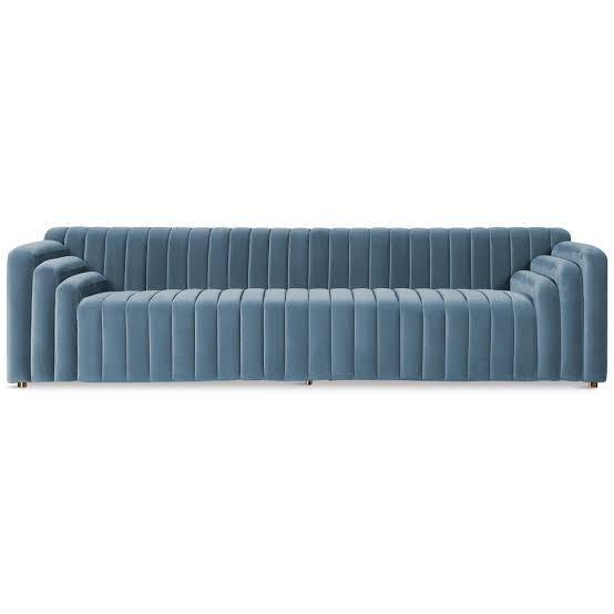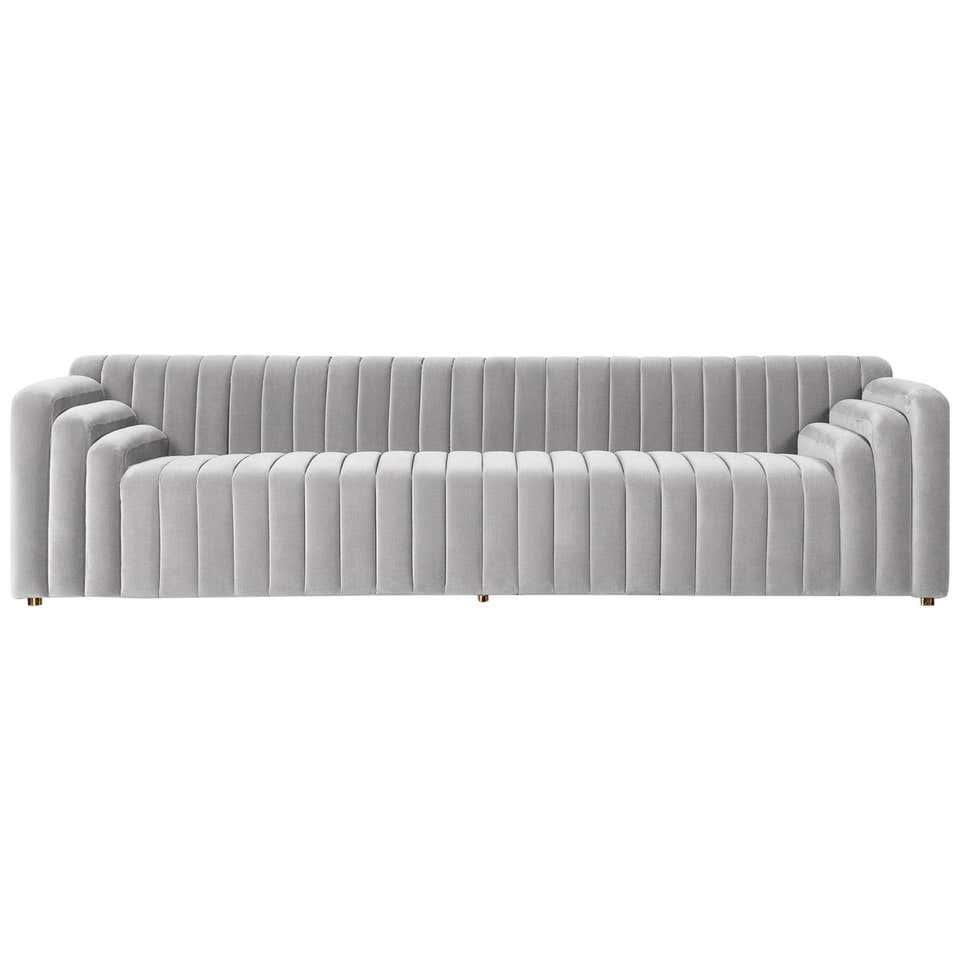 This Art Deco-inspired “Empire” sofa is a stunning tribute to the eponymous building and the city it calls home. Vertical channel tufting creates strong, bold lines; the stepped arms make this sofa a head-turner. Available in customizable velvet, so you can find the perfect color for your space.