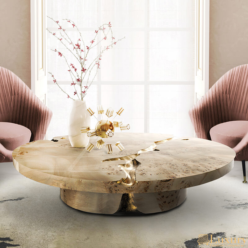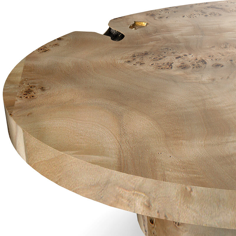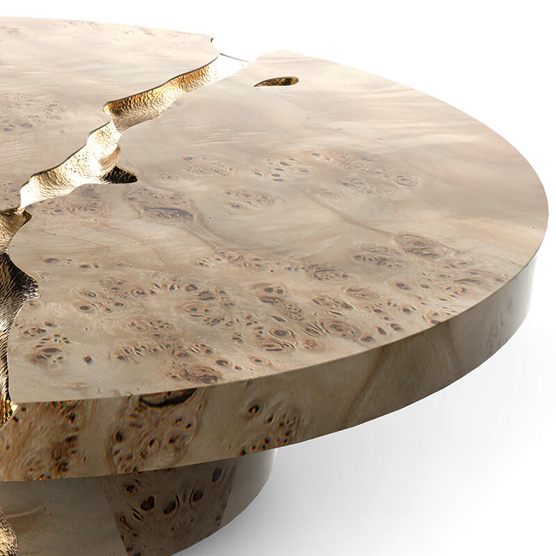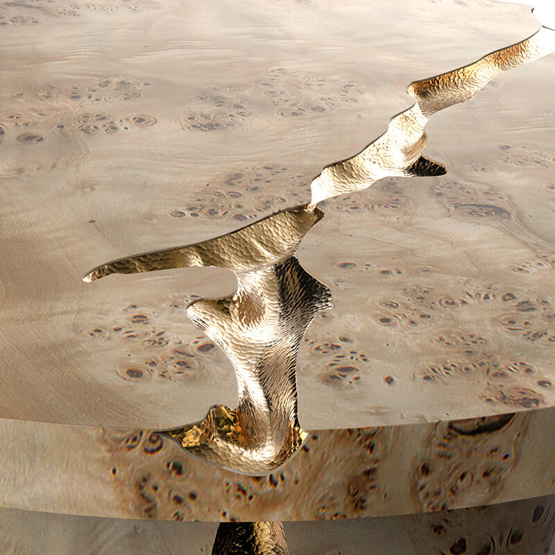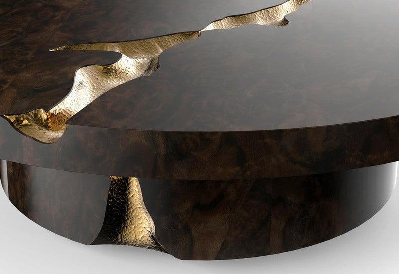 Introducing the Empire centre table which is built and designed to make a bold statement. This centre table is constructed from high grade solid mahogany wood and features a stunning light walnut root veneer finish. The coffee table consists of cracks which have been hand carved. These cracks are then filled with polished brass plates which are hammered by hand giving this exclusive coffee table a majestic touch. Also available are custom options where you can order this piece in any size of your choice. The Empire center table is built from mahogany wood, and features a polished brass surface. It’s cracks are hand carved, and inserted with polished brass sheets, which are hand hammered for a unique and organic finish. This item is also available in a dark walnut root finish.