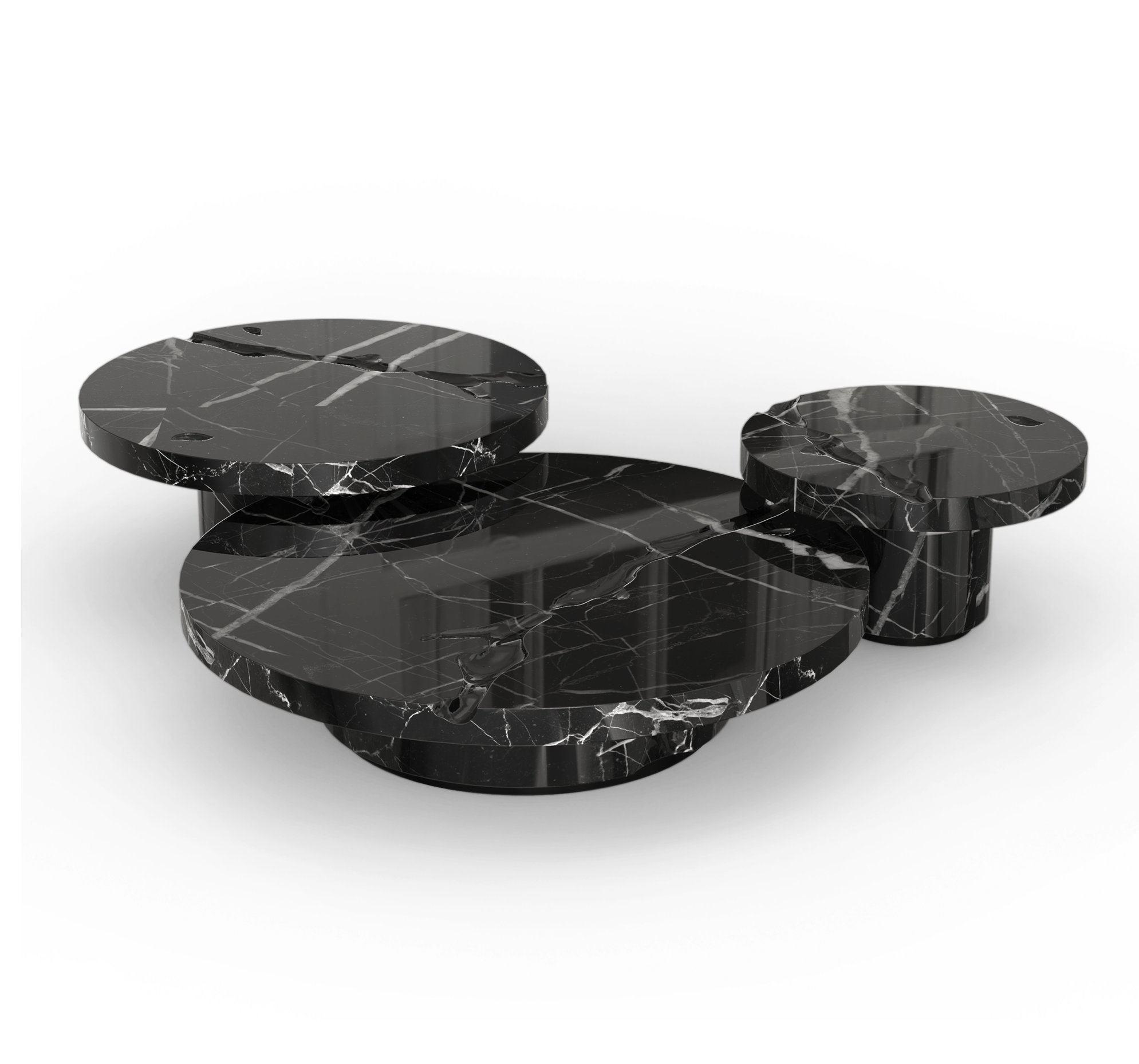 The Empire center table set is produced in Nero Marquina with a black matte lacquered metal finish.