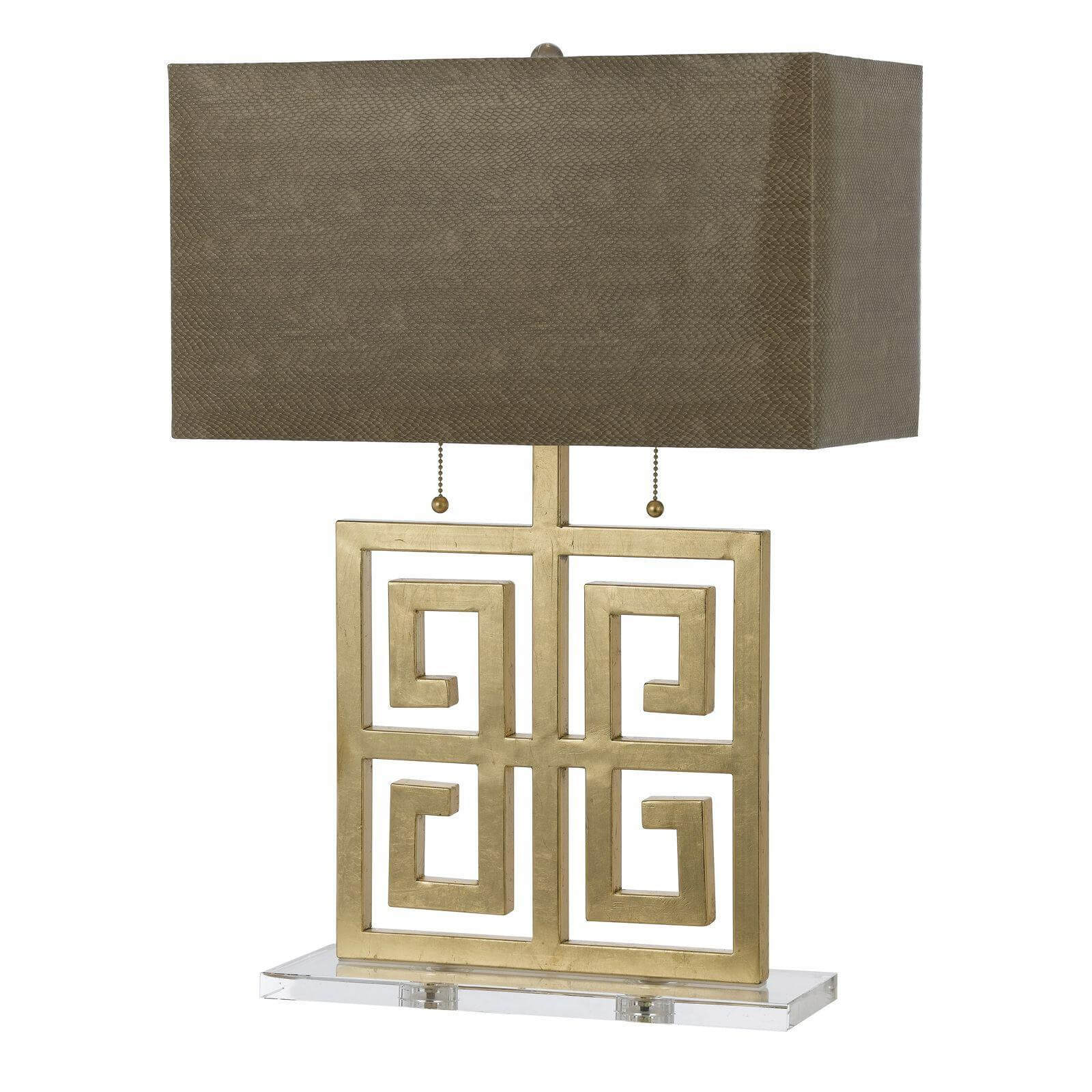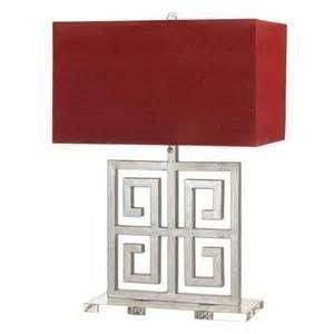 Greek Silver leaf metal lamp with Lucite acrylic base and luxe rectangle Rouge linen lamp shade. Illuminate your interior décor with the addition of this beautiful table lamp in any room. The Art deco Lighting Eros Table Lamp features a classic Greek design in gold foil on a crystal base. Topped with a Black Linen, and due to hand-crafting, no two are alike. This Transitional style table lamp features two 60 Watt Edison bases and an on/off pull chain. Light bulbs are not included with this light fixture.