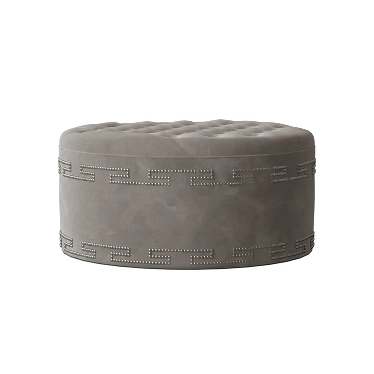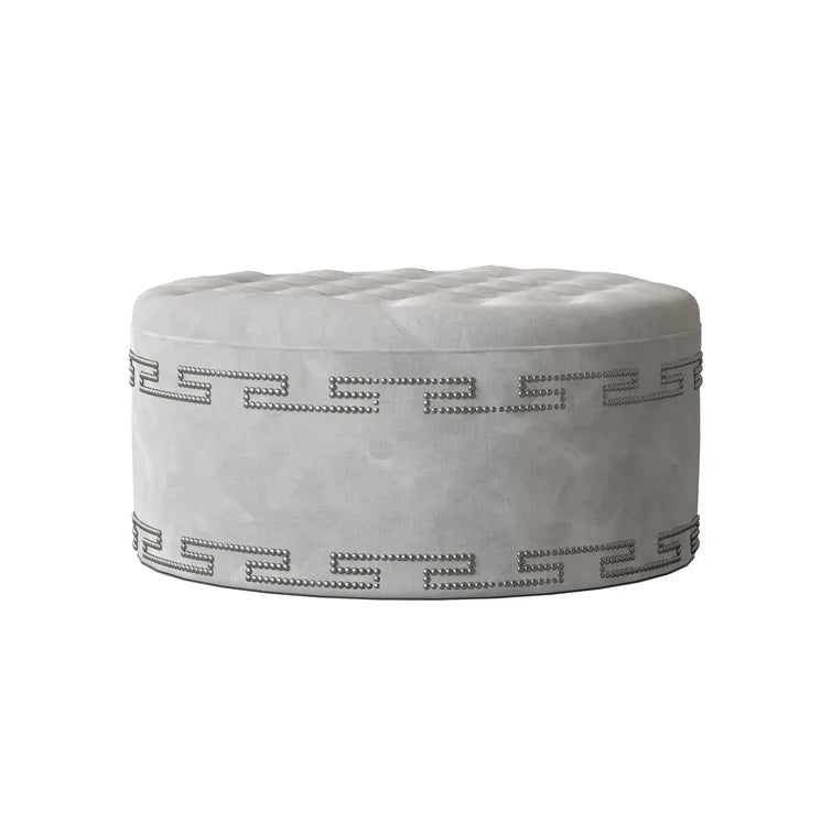 Practical yet posh, the ottoman is a beautiful piece that adds function without effort. The round ottoman with Greek-key-inspired nailhead detailing provides extra seating and can also double as a coffee table.