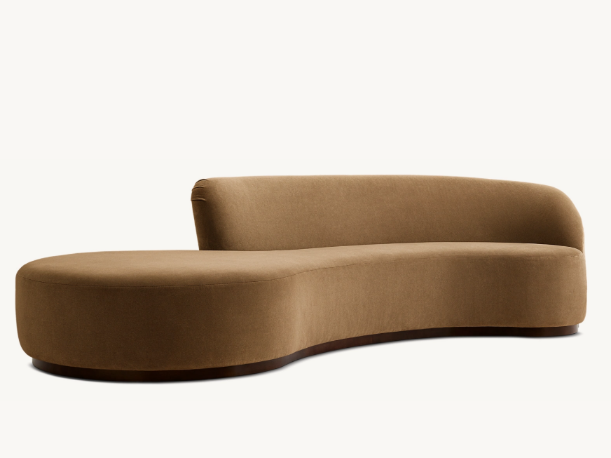 The Escada sofa is fluid and sculptural, combining organic minimalism with sumptuous comfort. Appearing to float atop a wooden plinth base, its low serpentine form captures a sense of movement while its sheltering backrest offers an embrace. The generously upholstered silhouette is at once relaxed and refined.