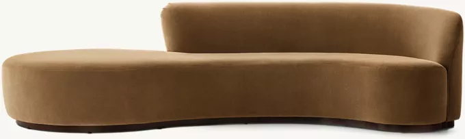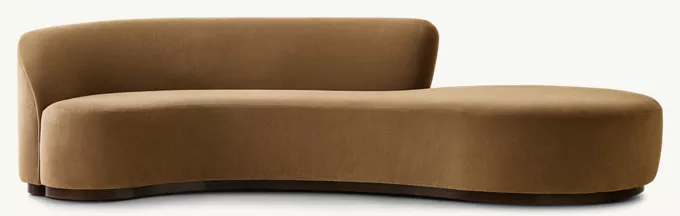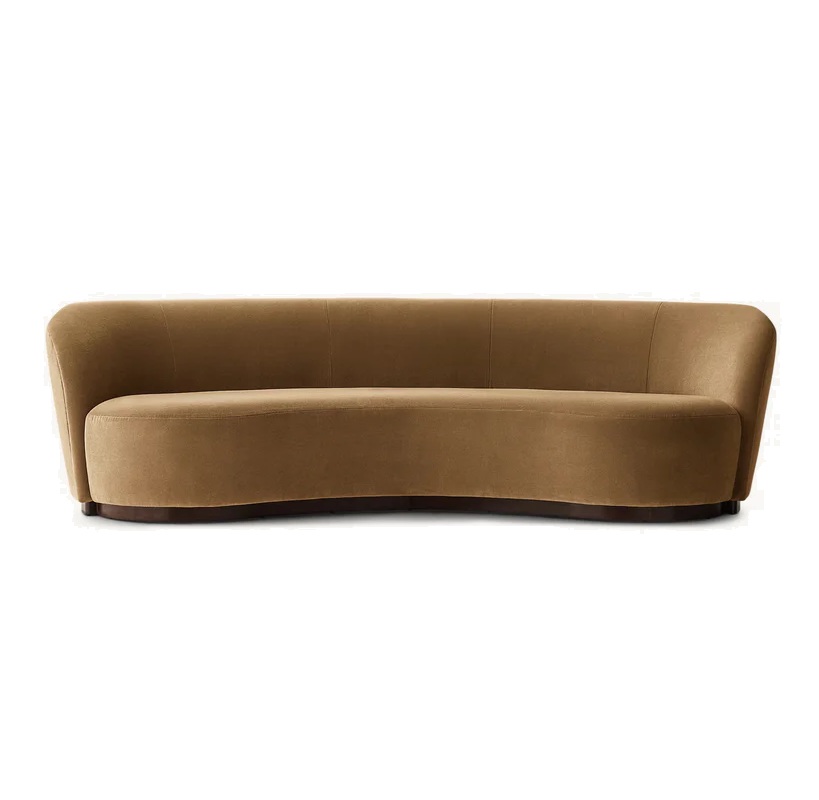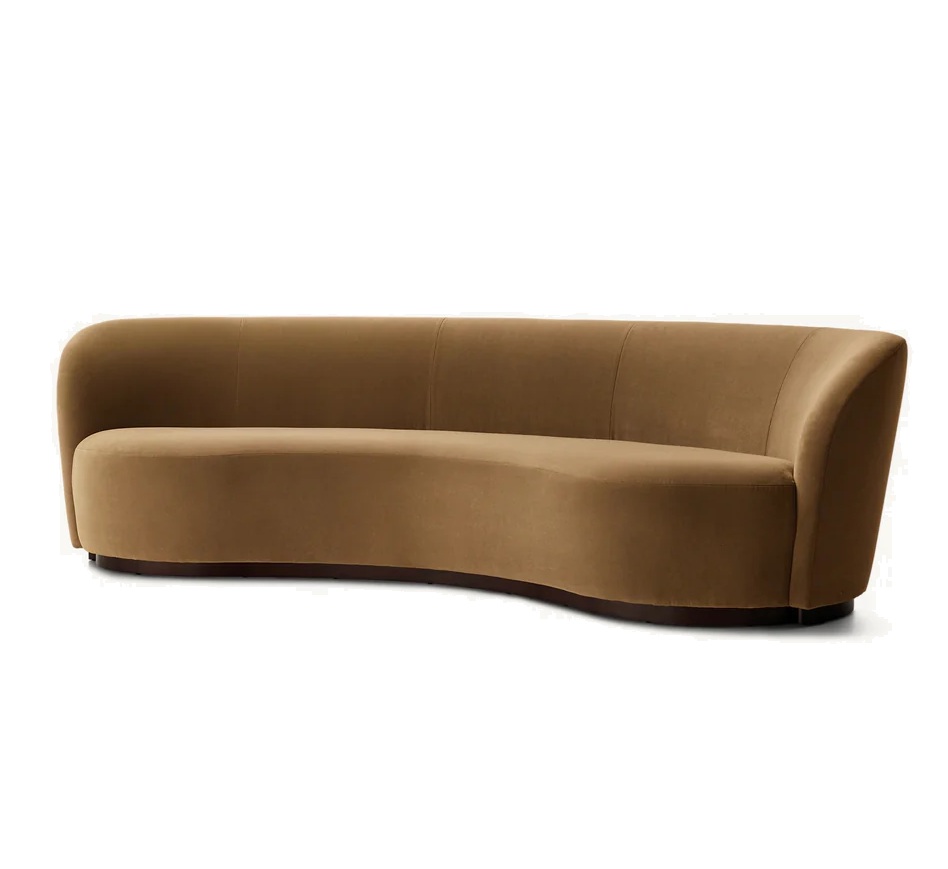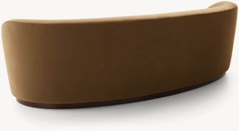 The Escada sofa is fluid and sculptural, combining organic minimalism with sumptuous comfort. Appearing to float atop a wooden plinth base, its low serpentine form captures a sense of movement while its sheltering backrest offers an embrace. The generously upholstered silhouette is at once relaxed and refined.