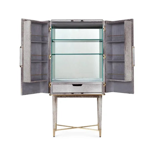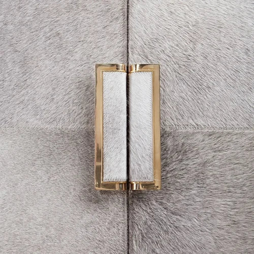 Home entertaining has never looked so fabulous. The Florian Tall Bar Cabinet is an essential piece for every host with the most, boasting a glamorous exterior and stunning reveals. A luxurious upgrade of Art Deco design, the cabinet is draped in plush genuine cowhide grey hair-on-hide with polished brass accents throughout, from its pulls to its crossbar and sabots. The wow factor continues upon opening, where a swanky interior space boasts a rich micro-suede, glass shelving, and a glittering mirrored back. With two center shelves, six fixed-door shelves, and an additional hair-on-hide drawer within, the Florian provides plenty of storage for all your home bar needs. An upscale pick for any home, and especially useful in smaller spaces in need of compact storage.