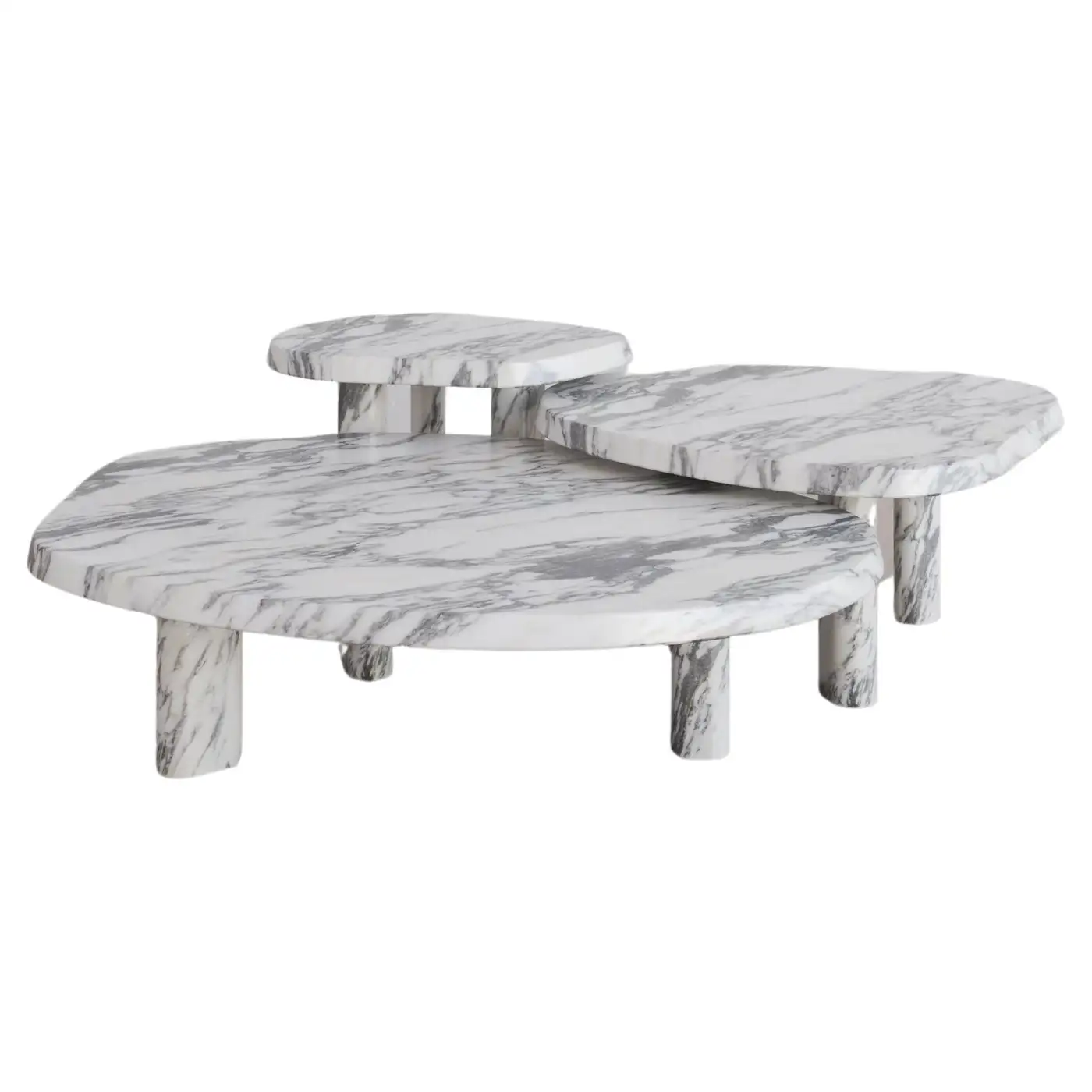 Forma Viola Marble Coffee Tables in Arabescato Marble. The Forma Coffee Table is sculpted from noble materials; its subtly organic contours echo Australia’s white-sand shoreline. Three interlocking elements can nest as one or be arranged separately.The form is defined by planar surfaces, softened with a angled edges.. Available in different material options.
