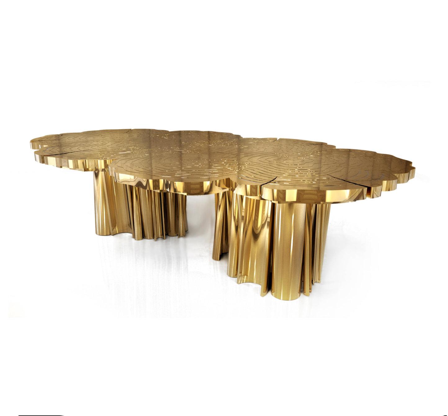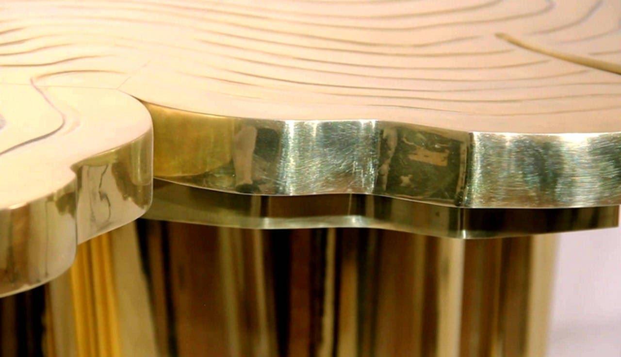 Limited edition design The Fortuna collection embodies the epitome of Luxury and Hollywood Regency design. This exquisite design dining or conference table in polished Brass. Stunning free-form dining table executed in high polish solid brass, the shape and finish of this table really exemplifies the way water creates waves and the rings in the tree trunks that tells us how long a tree takes to mature becoming a source of life and refuge.