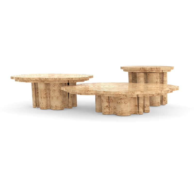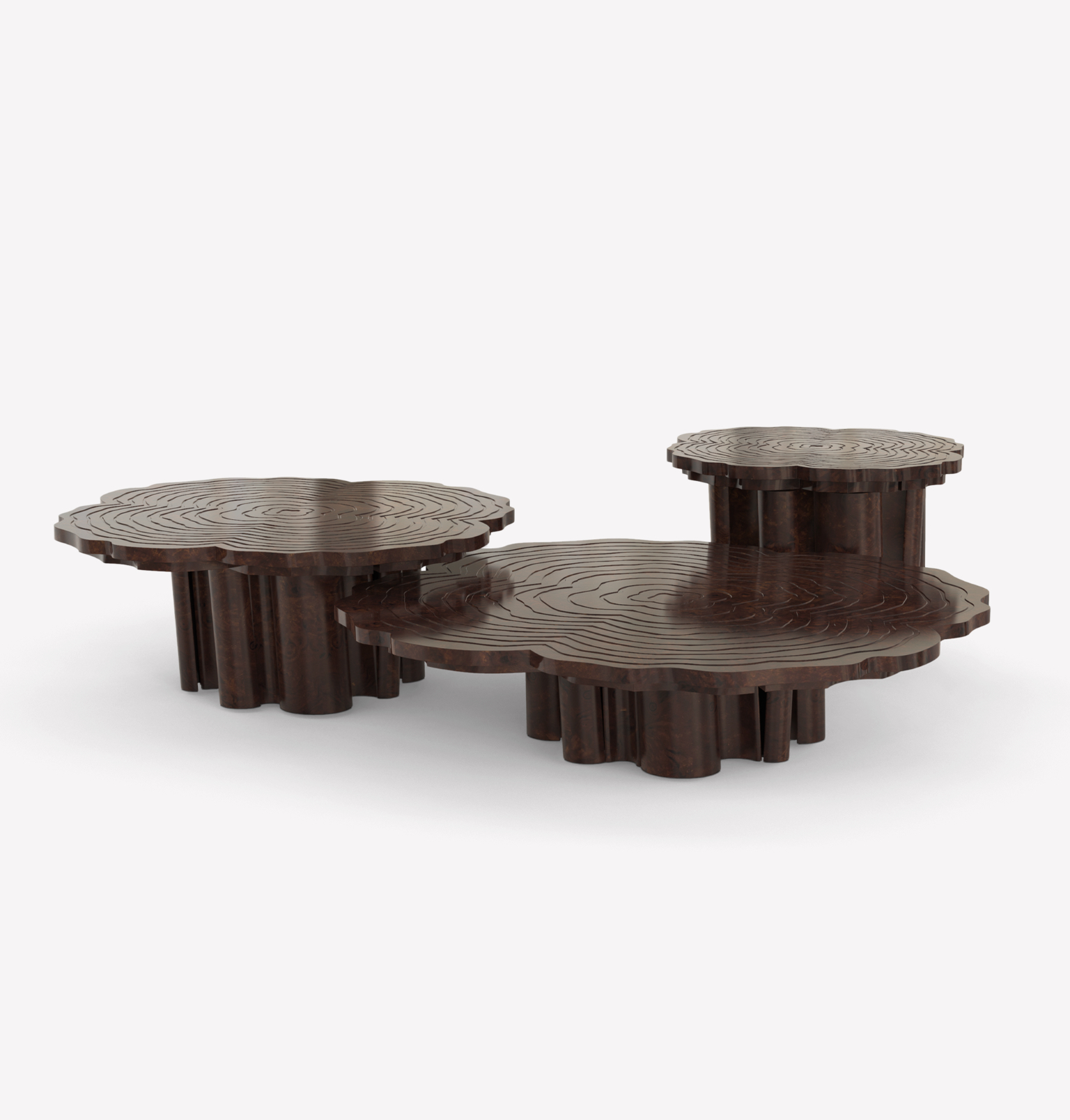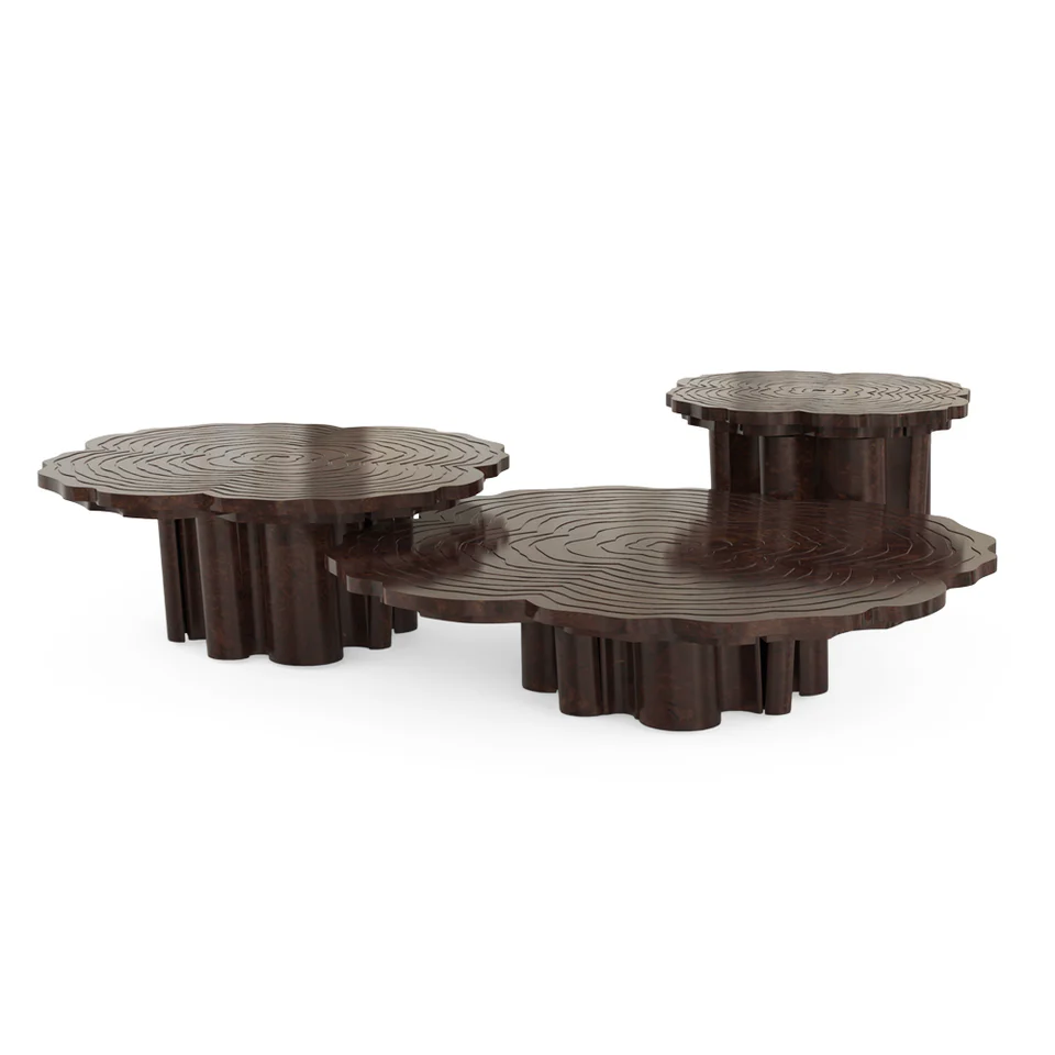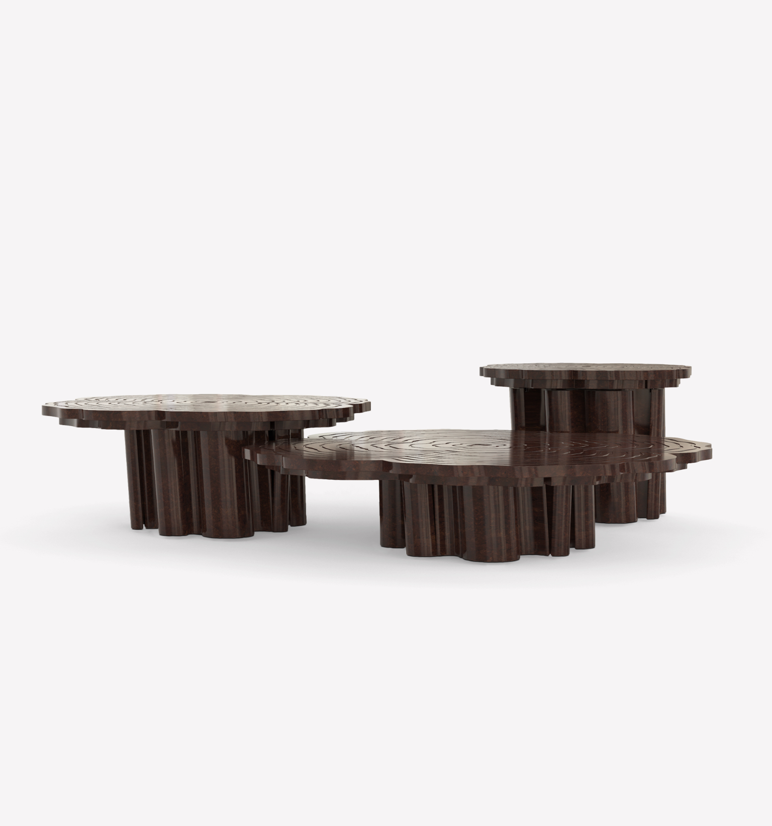 Fortuna Coffee table in Dark walnut finish set of 3 with all structure of each table in walnut wood . Also available in gold, chrome, antique brass finish.