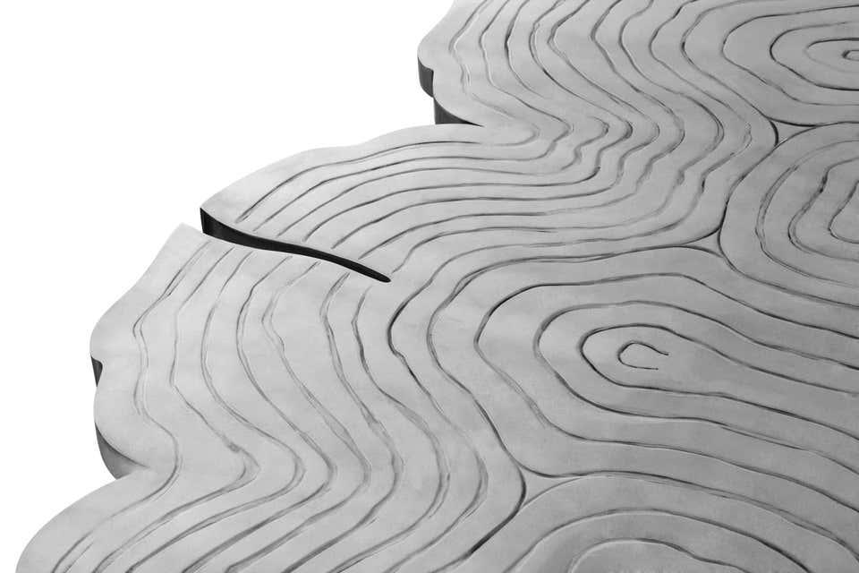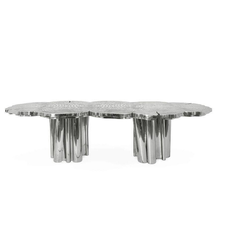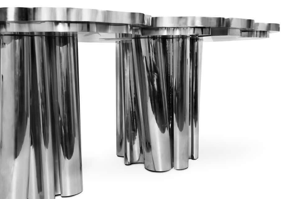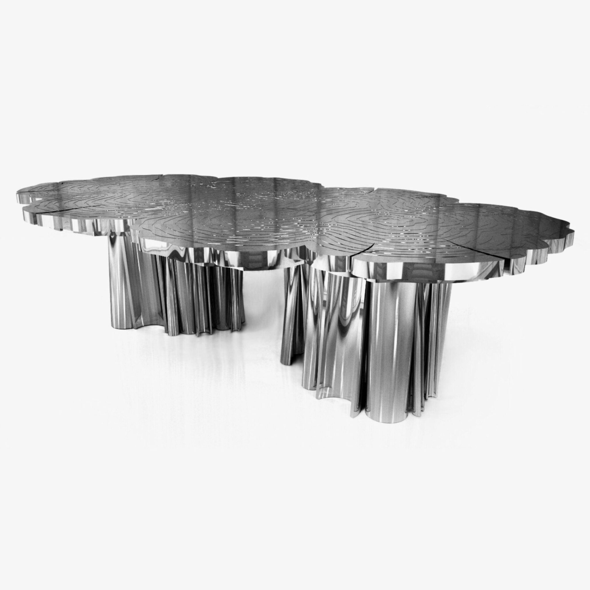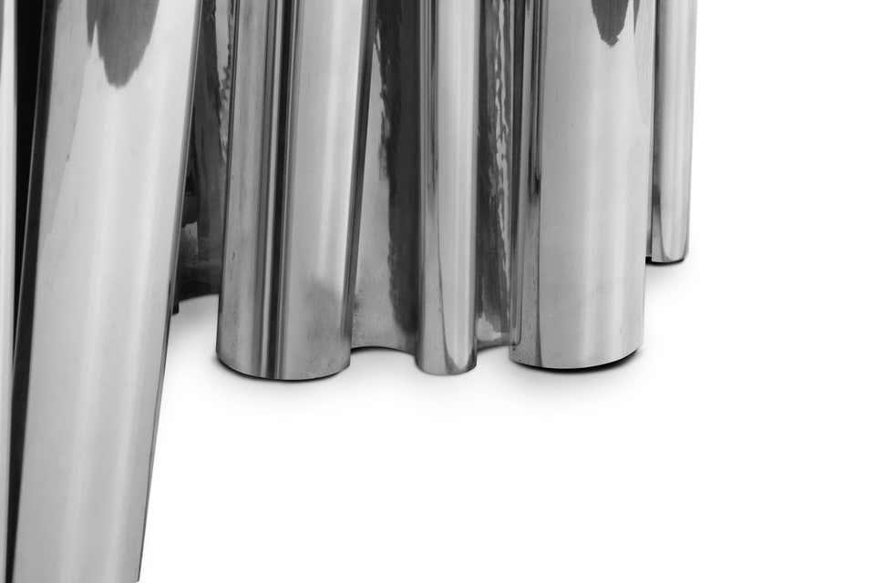One-of-a-kind design aesthetic Fortuna features an exclusive polished nickel, brass or gold surface for ground-breaking dining rooms. Made in solid wood and polished nickel, this upscale dining table incorporates richest nature-inspired design, industrious welding techniques and a manually engraved top that emulates the outlines of log rings, reminding the timeline of a tree. 12 seat dining table top is an elegant composition of two scaled organic chrome tubes. Fortuna is a unique dining table that embodies the fearless state mind.