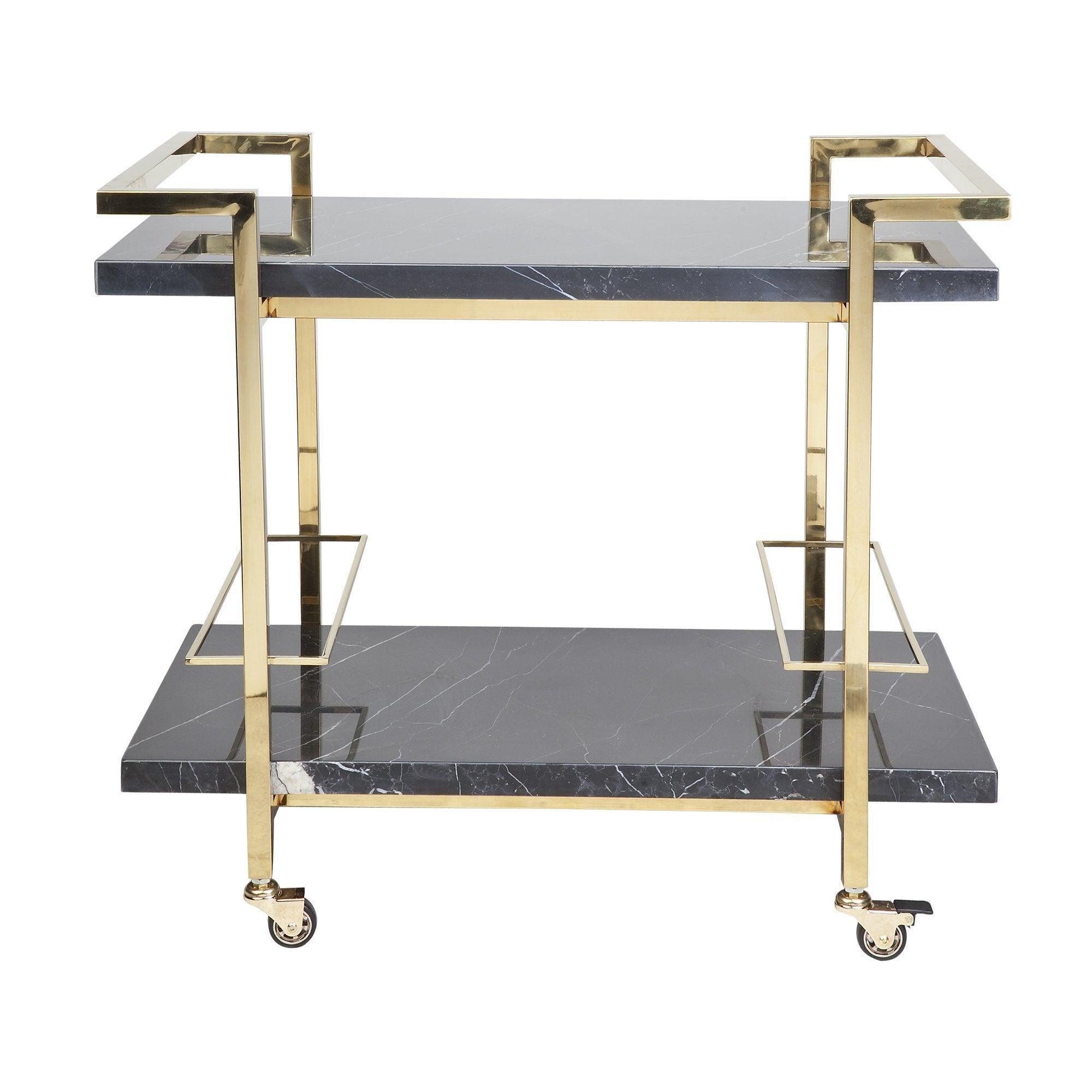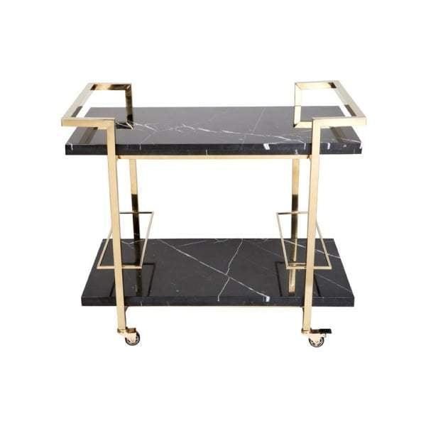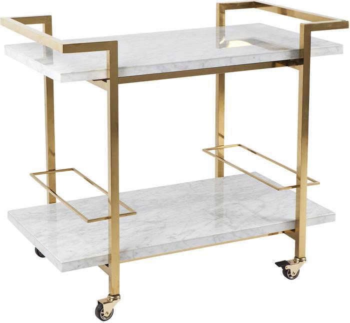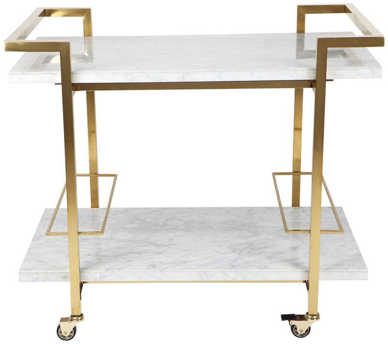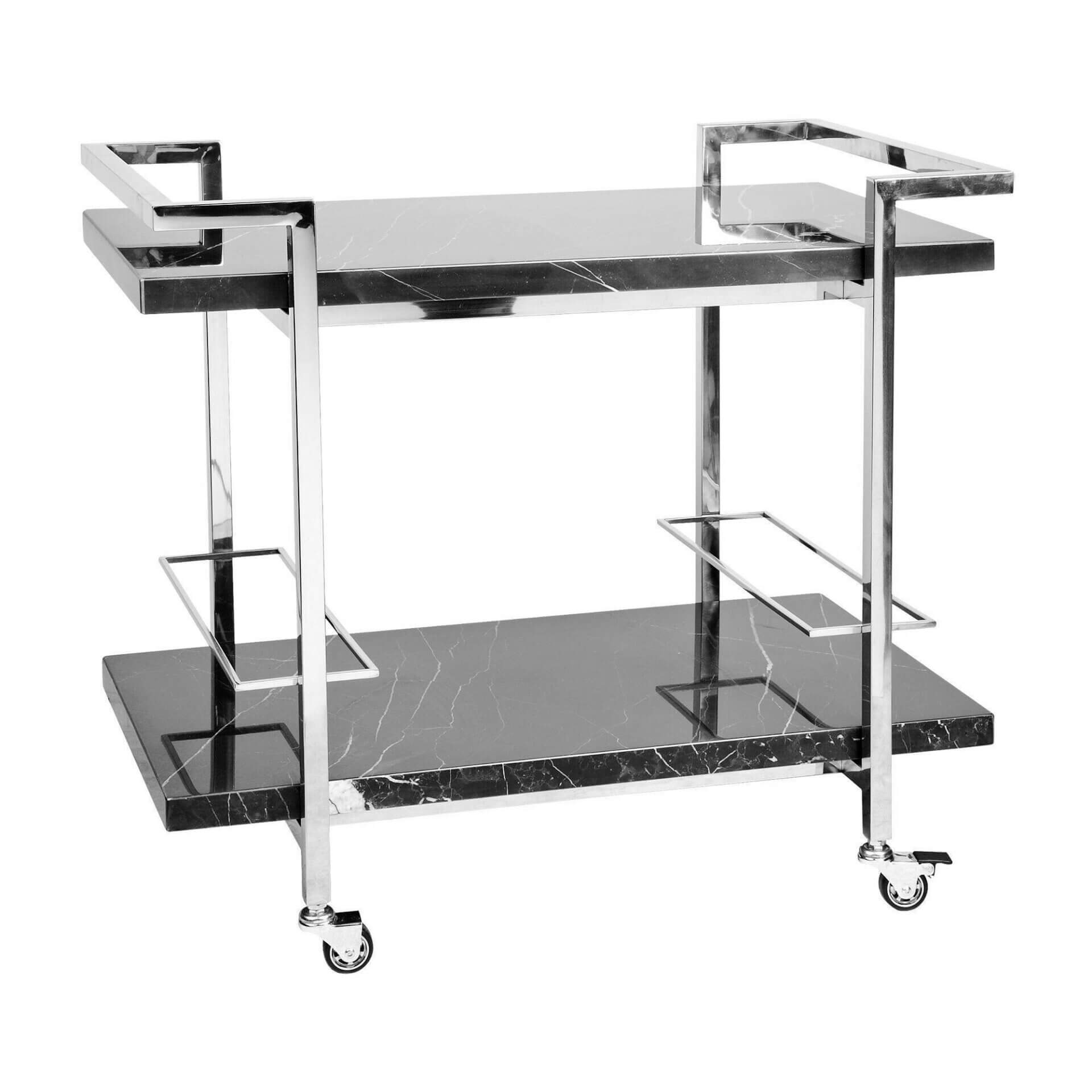 Chrome finish stainless steel frame with a white marble top and bottom shelf. Complete with stainless steel lockable castors. Note that this item contains natural stone. Therefore colours finishes may vary and no two items are alike.