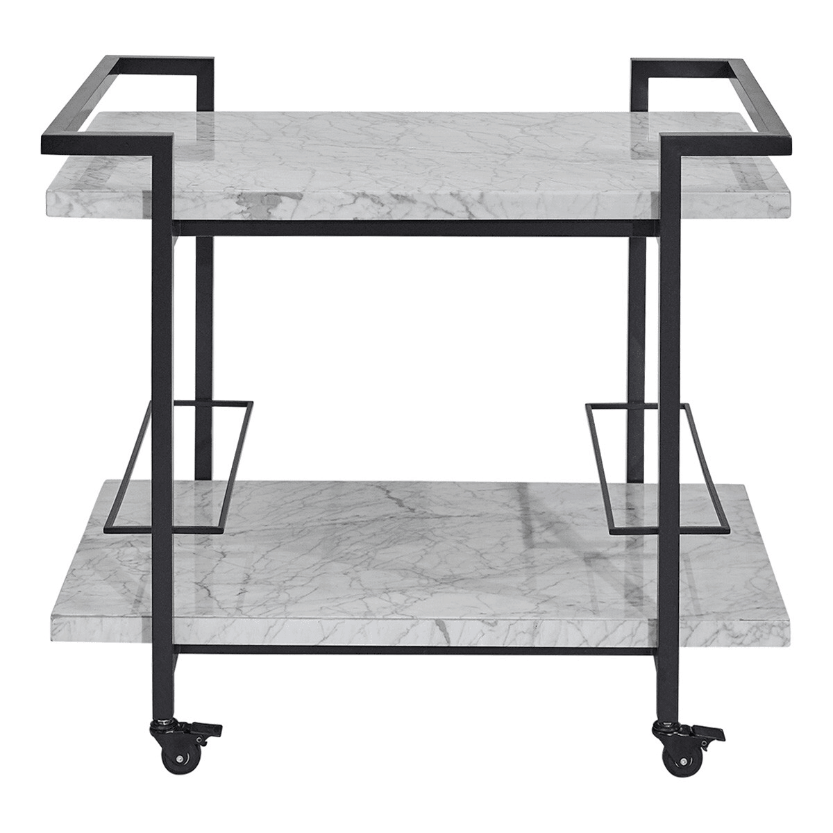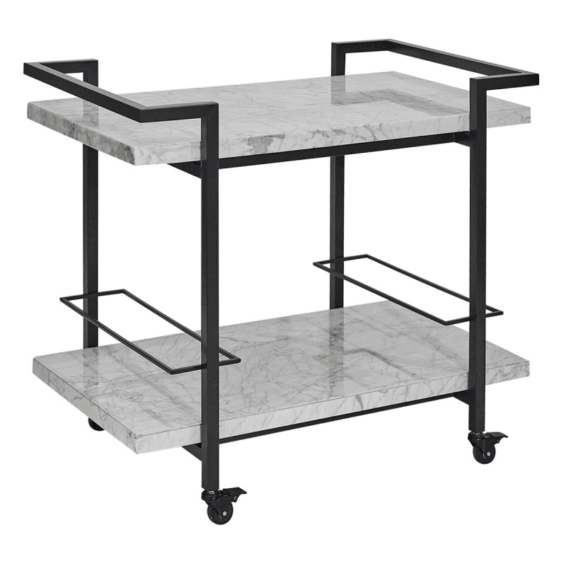 Serve your guests without forgoing function or style. The Franklin marble drinks trolley takes minimalism to the next level, featuring a stainless steel frame in a black powder coated finish and inlaid white and grey marble shelves. This multi-tiered drinks trolley is as fashionable as it is functional. Complete with black finished stainless steel lockable castors. The natural marble element of this product means your item will always be uniquely yours as colours and finishes between items will always vary.
