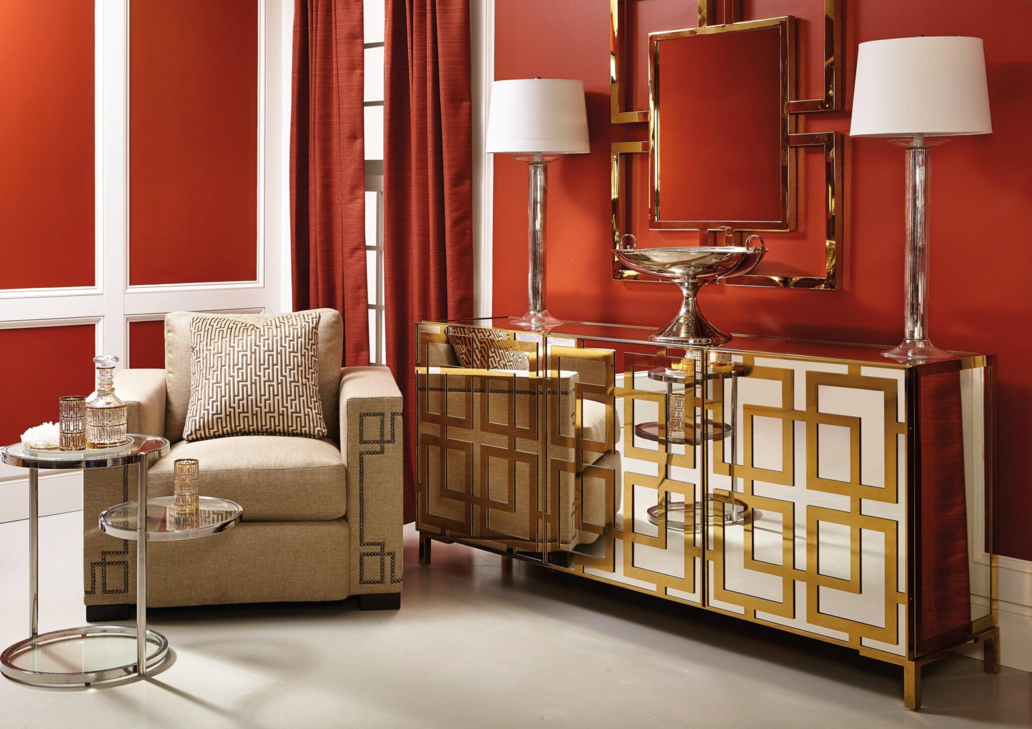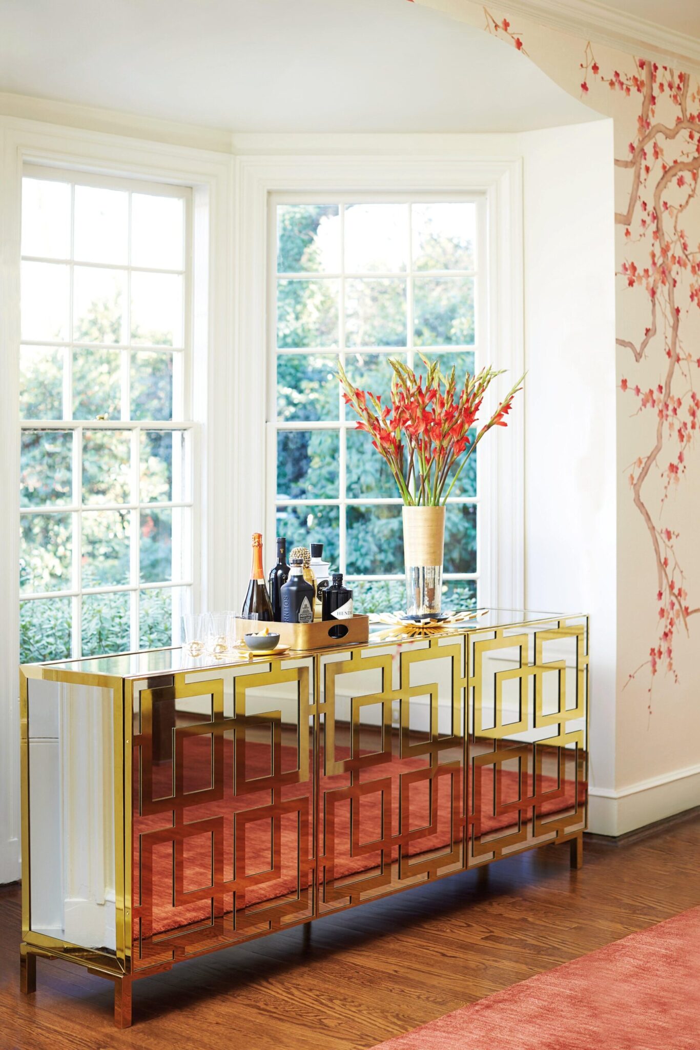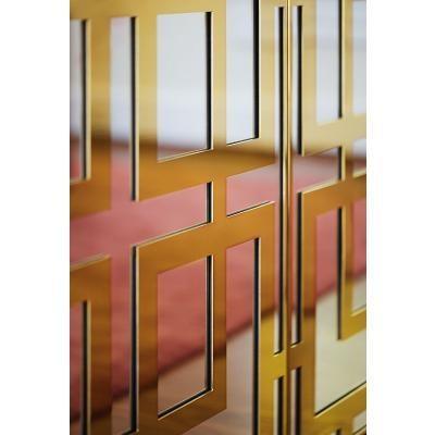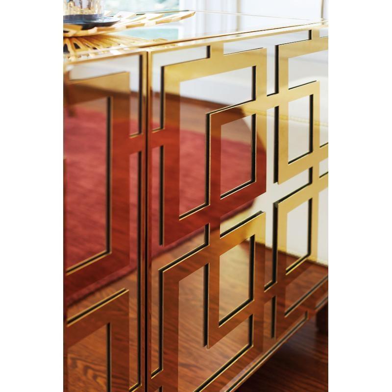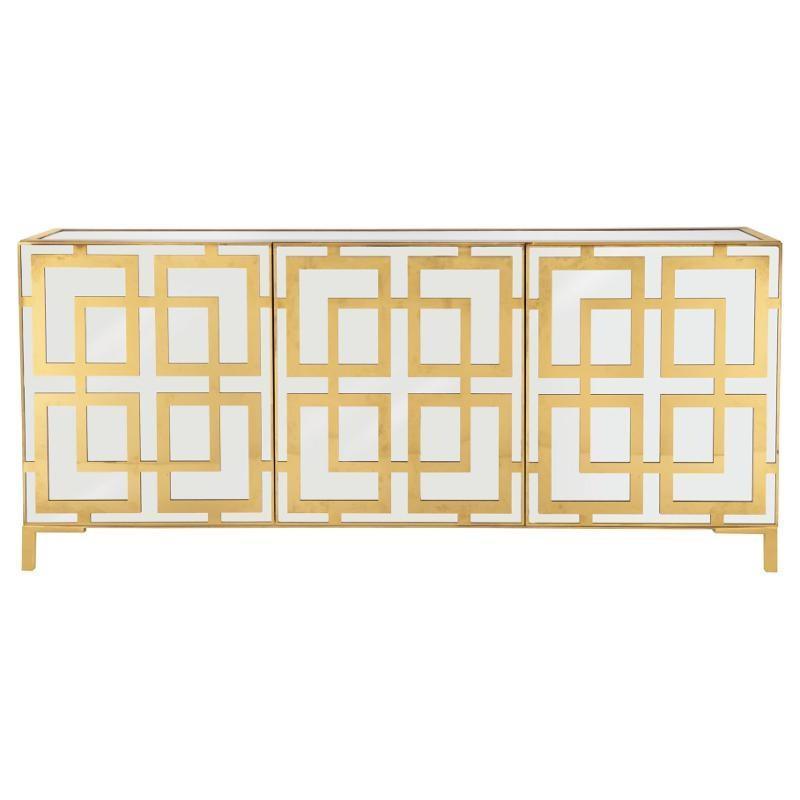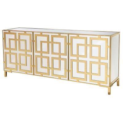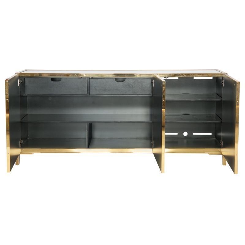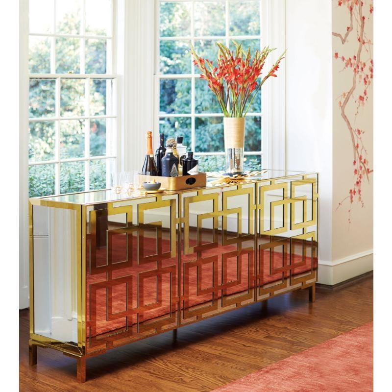 The Fretwork mirror buffet sideboard will make a gorgeous, statement piece for your dining room. It features a stainless steel frame in polished brass finish, inset mirrored glass top and end panels, three doors with inset mirrored glass front and metal grille with touch latch and black interior. Behind the left and center doors are two drawers with hand cut-outs, one removable shelf with bottom attached partition and two open compartments. The left drawer has wrapped pad, the right drawer has silverware insert and behind the right door are two adjustable, removable, shelves.