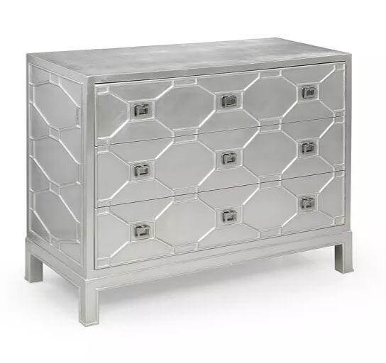 The Fretwork Chest is a nickel metal clad wooden chest drawer with a three dimensional lattice design. The oversized chest has three enormous hardwood drawers with full extension metal glides making this chest as functional as it is beautiful. Made of hardwood the exterior is totally covered in sheets of nickel metal. Each drawer has three handsome nickel plated solid nickel pulls.