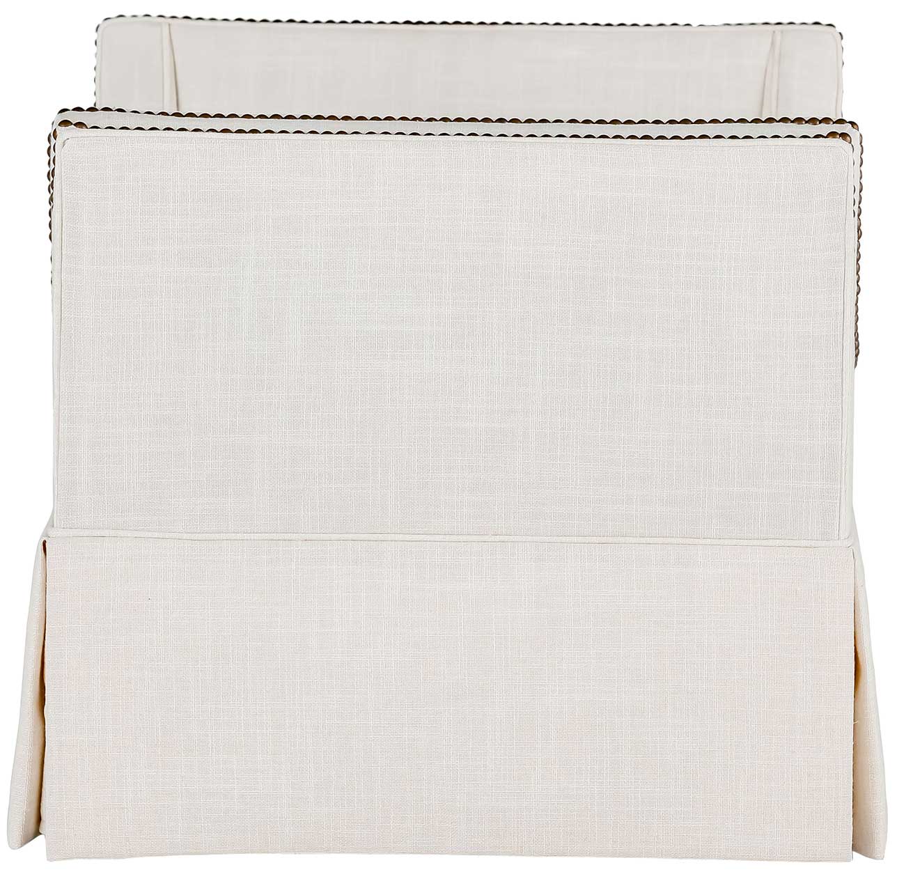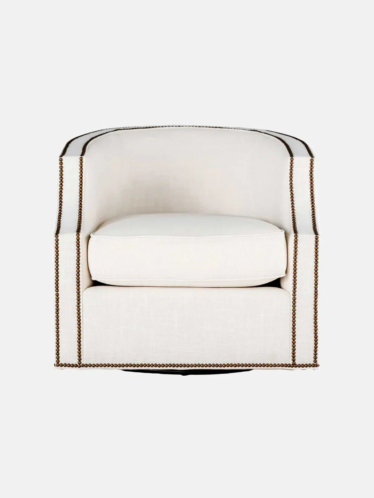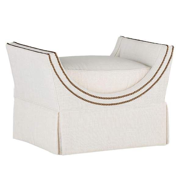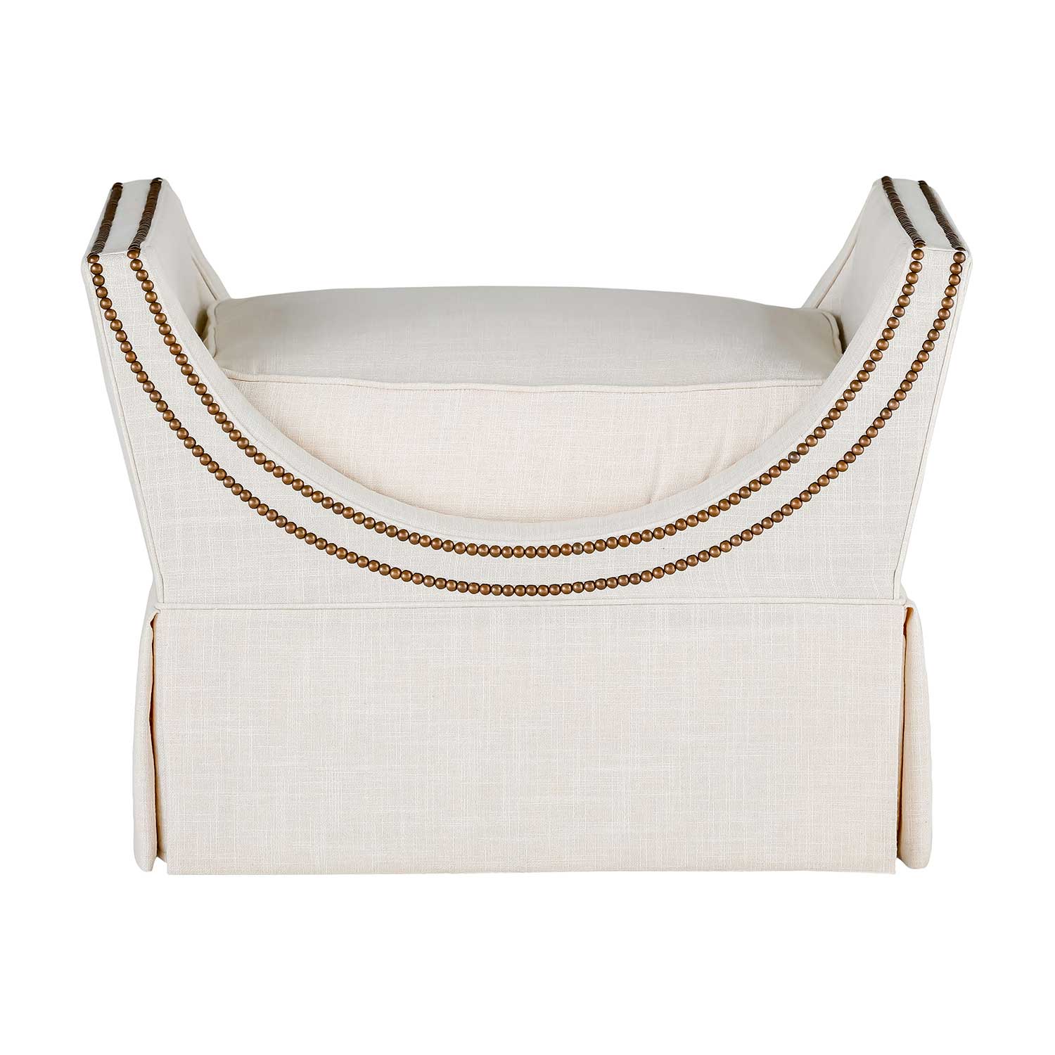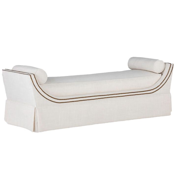 The Gabrielle Bench is a fully upholstered backless bench which features a kick pleat skirt, elegantly curved frame, and two rows of antique brass nailhead trim. Finished with two bolster pillows, this bench adds a rich helping of Hollywood glam to the bedroom.
