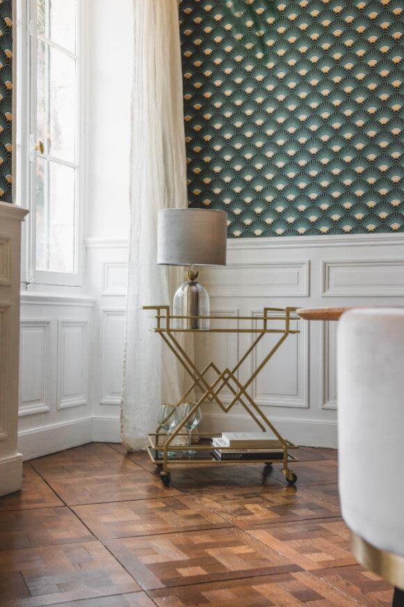 Gatsby Antique Gold leaf finish bar cart with 2 shelves. A beautiful bar table inspired by the Art Deco style. Also useful as an extra side table in the kitchen or in the dining room.