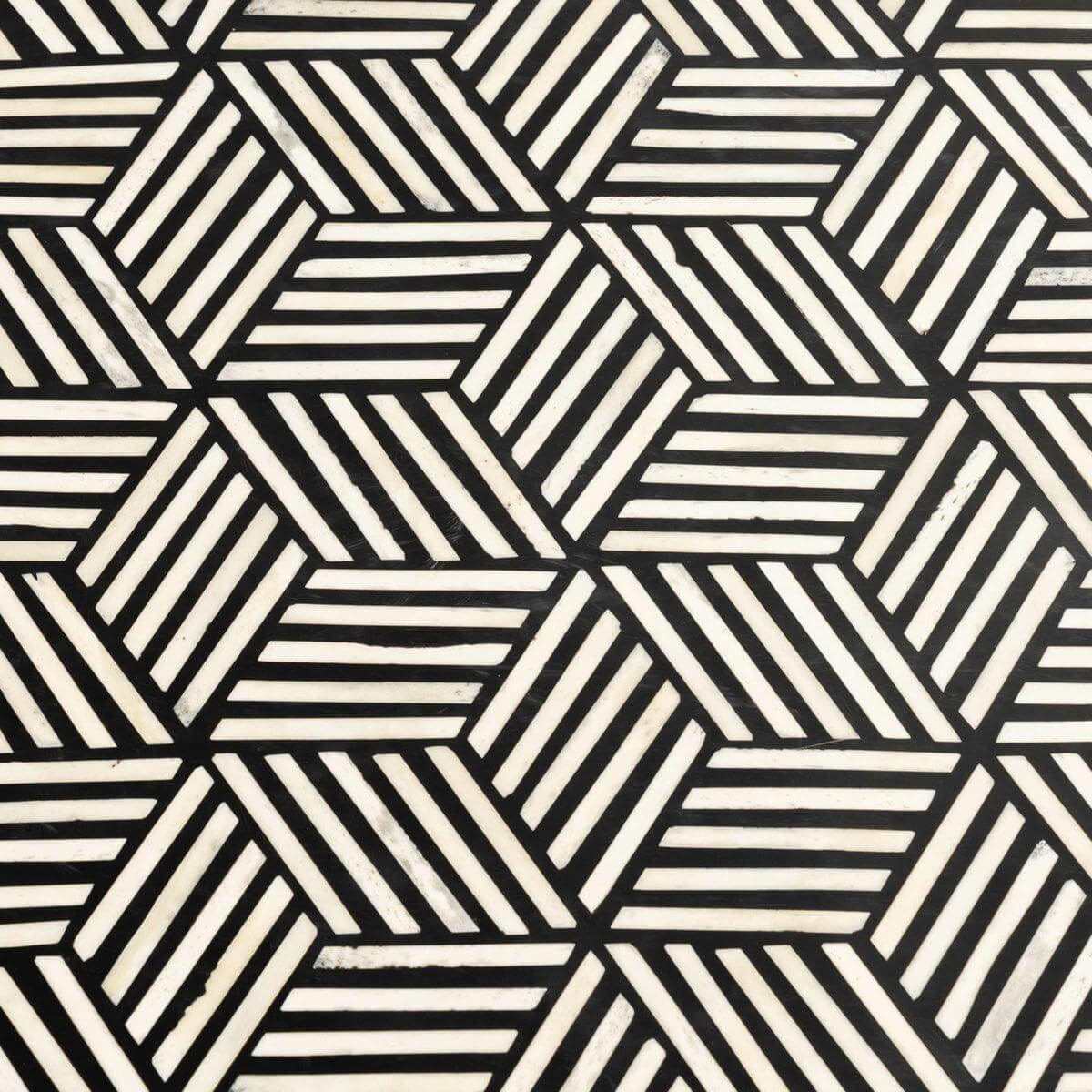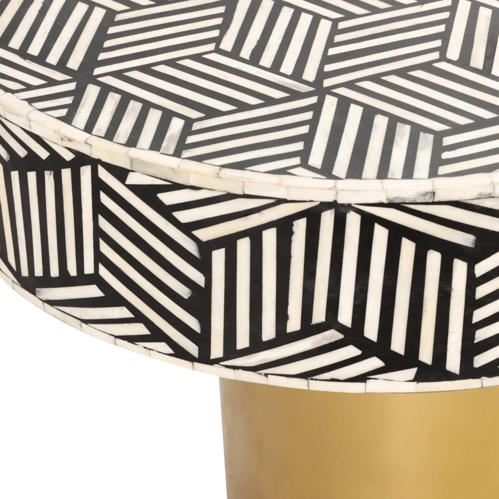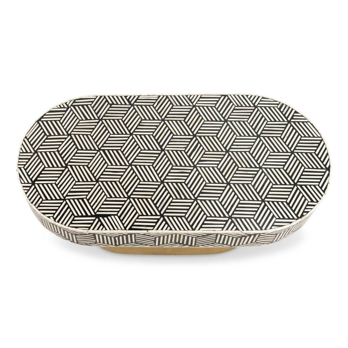 Eclectic and eye-catching, the Geo exquisite Coffee table shows off a functional and artful design. The optically intriguing bone inlay pattern provides a perfect contrast to the warm brushed brass base to ultimately add a spark to your home.