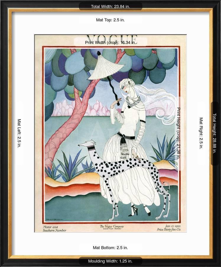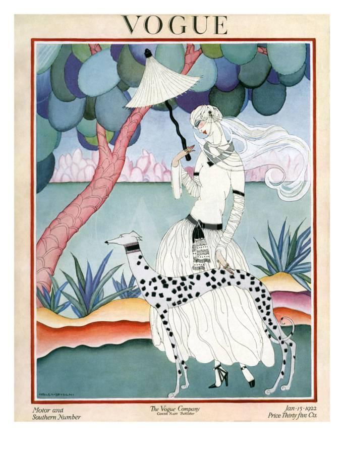 Published January 15, 1922The unusual color palettes used by Helen Dryden in her fashion illustrations made for eye-catching covers of vintage Vogue magazines. For the January 15, 1922, Vogue cover, Dryden used an unworldy coral, teal, and periwinkle scheme to highlight the black and white fashions of a vieled woman strolling with her black and white dog. The issue announced the Motor and Southern Number.Photo licensed from the Condé Nast Collection, home of The New Yorker, Vogue, Vanity Fair and other popular brands. Find this and other artwork at the Condé Nast Collection.