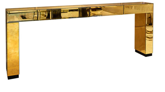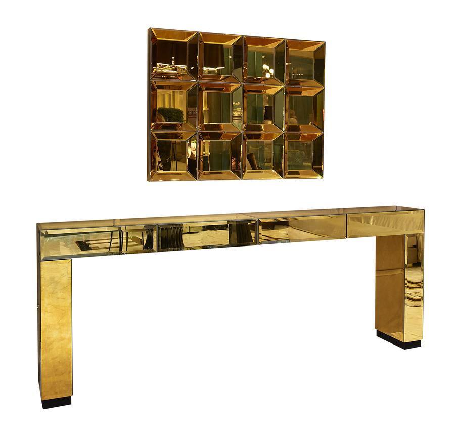The Giancarlo Modern Italian Gold Mirrored Console Table With 4 Drawers offers the ultimate in contemporary style statements. As comfortable in a dining room, bedroom or study as it is as a welcome in an entrance hallway. Hand crafted in mirror and created for the most discerning of modern interiors. Shown here with in a 4 mm Italian beveled mirrored glass finish, completed by a versatile hidden drawer. Paired here perfectly with the Gold Mirror, also available and creating a striking set which showcases how this console could also be used as a striking desk .