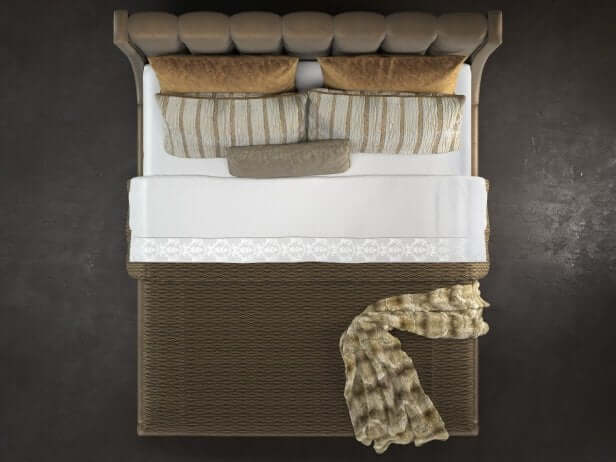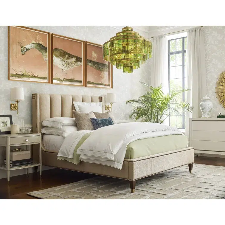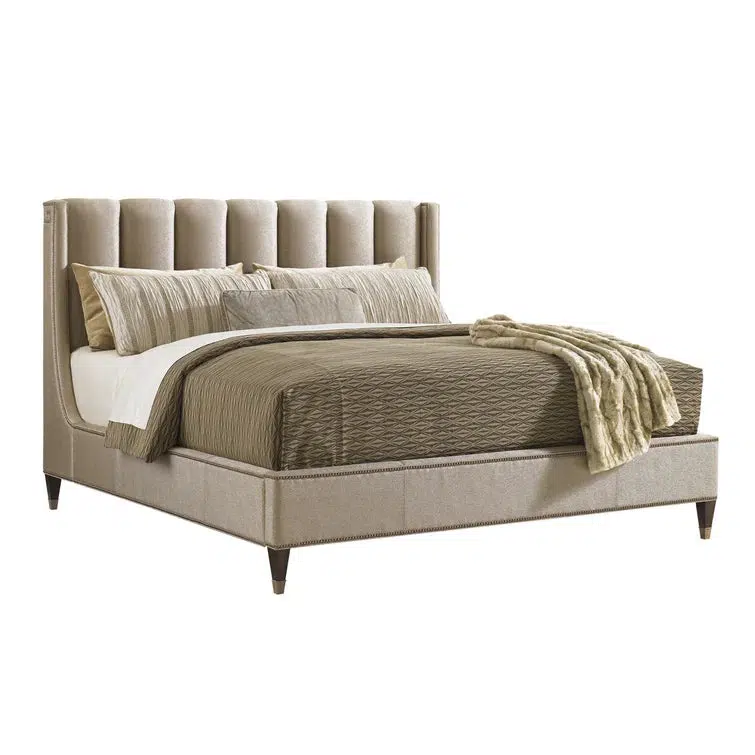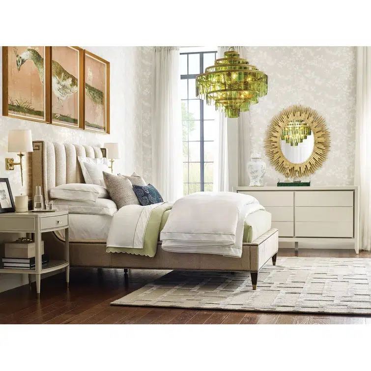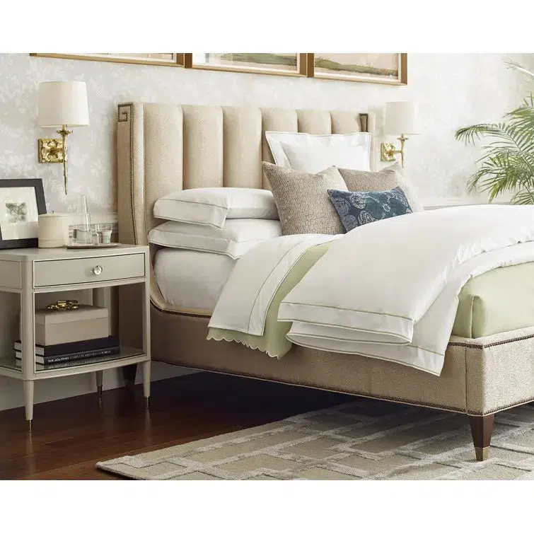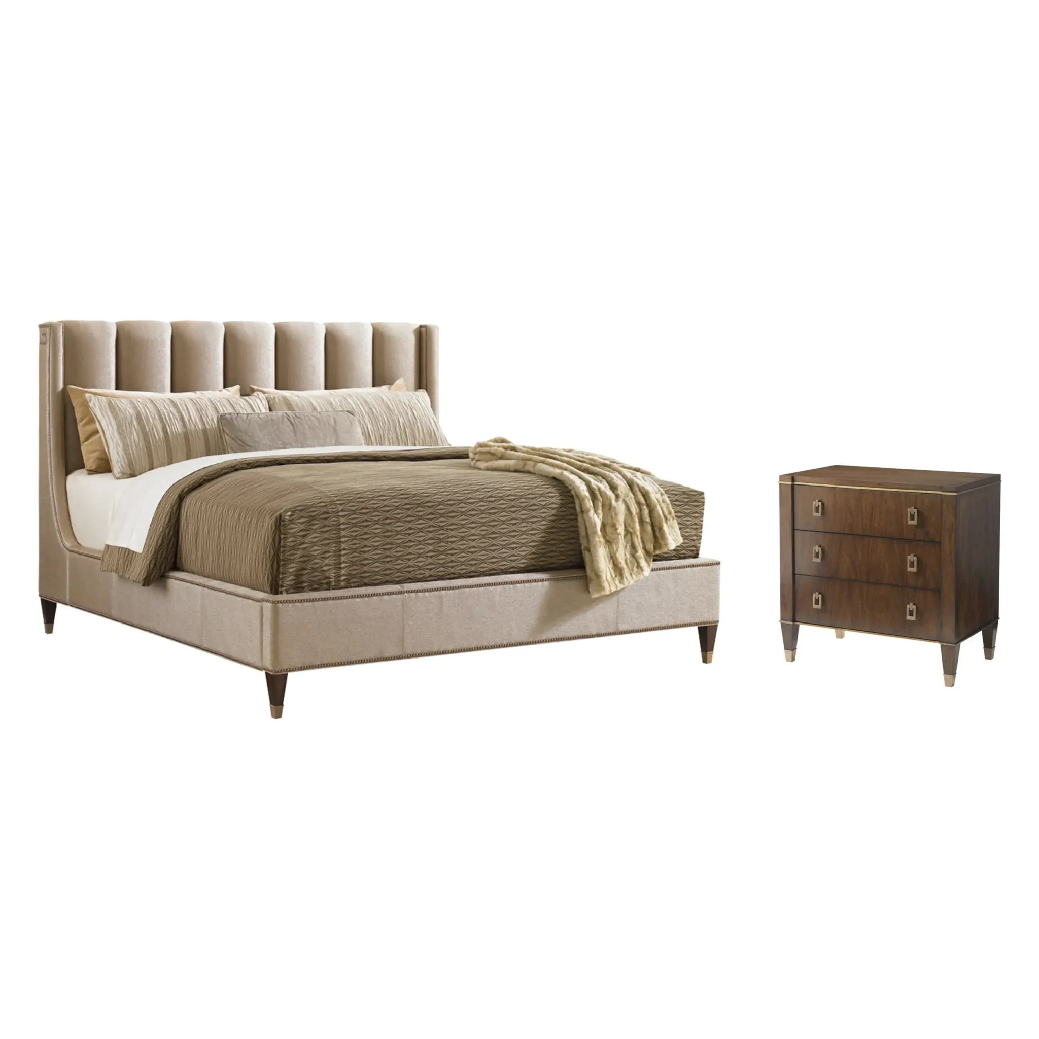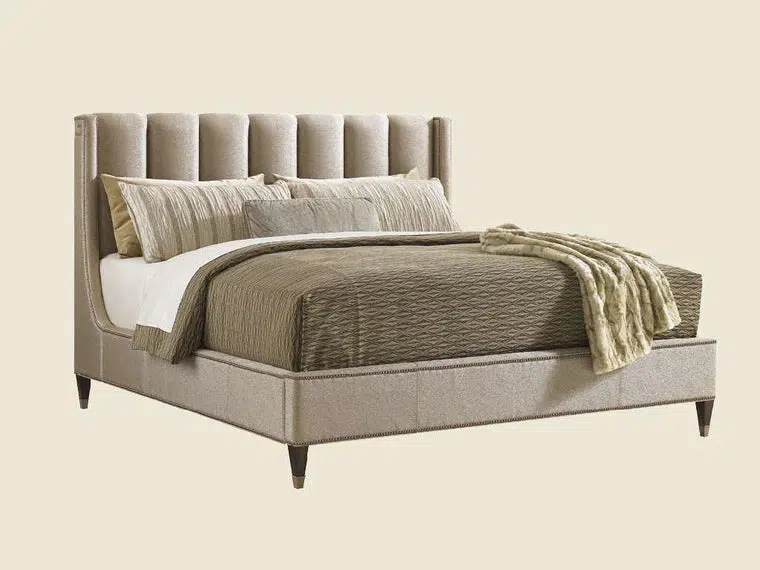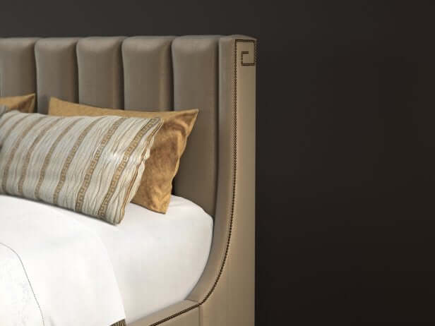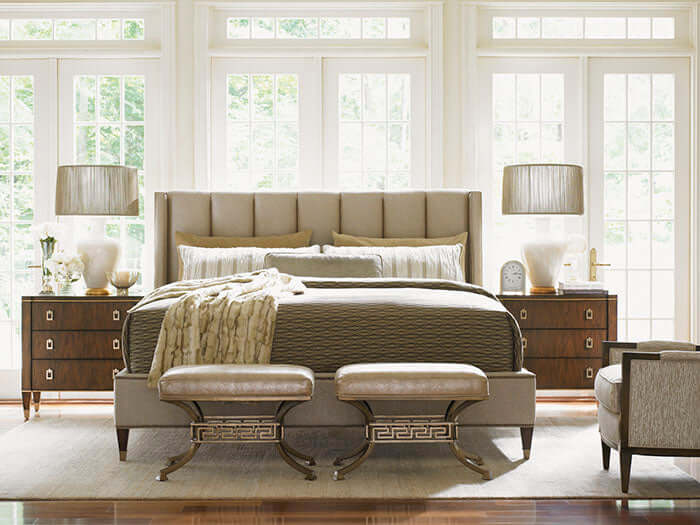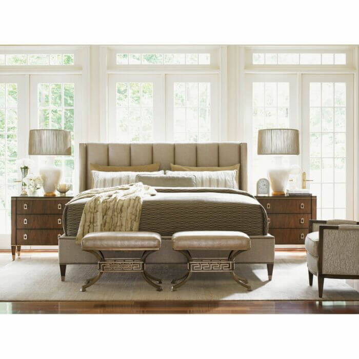 The fully upholstered channel back headboard and side rails are adorned with nailhead trim in a Greek key design. The sophisticated textured fabric, a contemporary cobblestone pattern with a soft luster, graces both the headboard and footboard and is complemented by brushed brass finished ferrules. The elegant penthouse look reflects a modern view of luxury living. Designs feature clean architectural lines and a seductive mix of Cathedral Walnut veneers, brushed brass hardware and an alluring assortment of upholstered silhouettes. Today’s contemporary aesthetic is best described as luxe transitional, with styling that softens the edge, textures that soften the touch and designs that draw inspiration from classic details like the iconic Greek key. The look is understated and approachable, while retaining the sophistication of a luxury lifestyle.