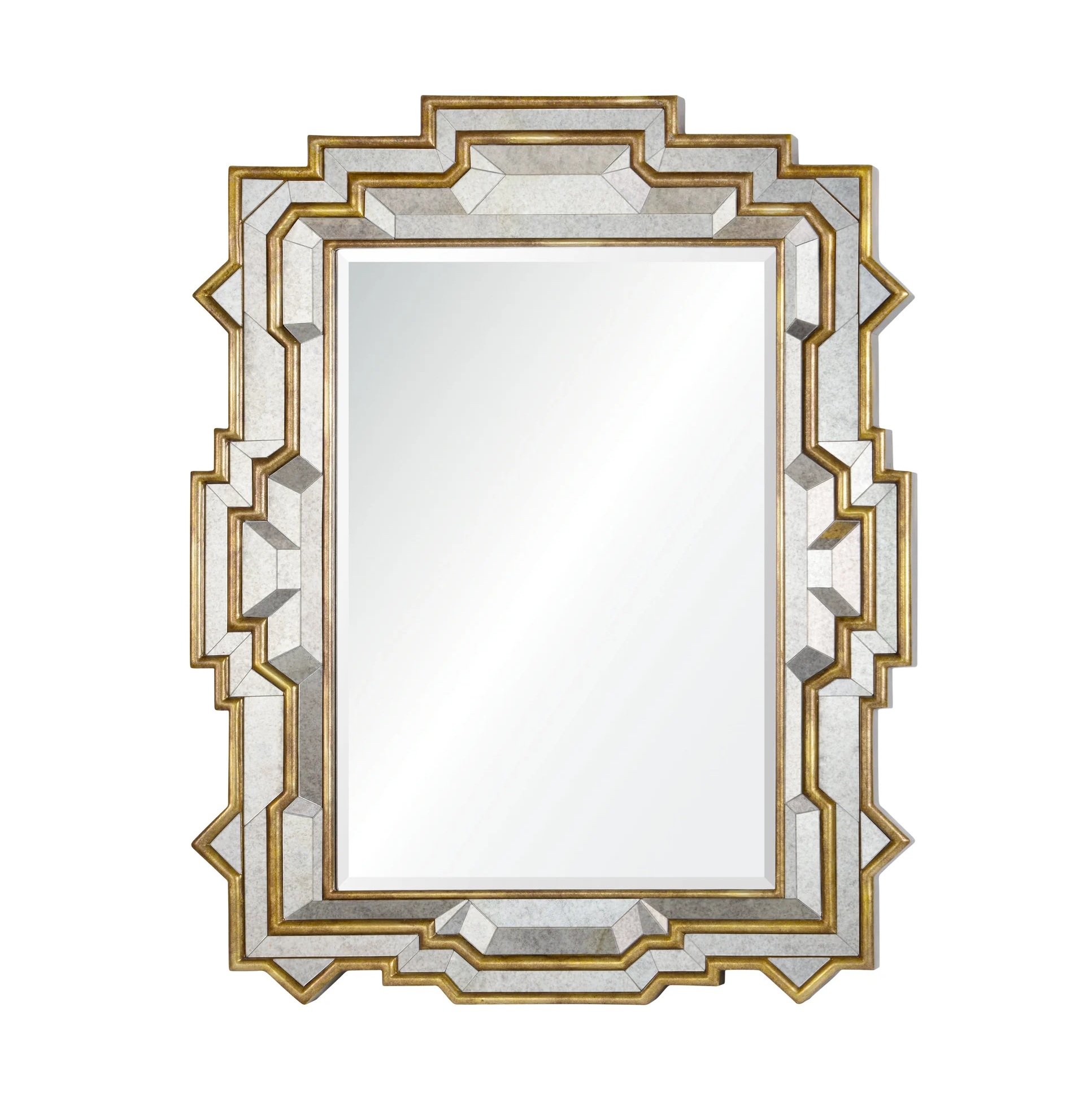 Gilded Antique Brass metal Art Deco Antique Mirror. Beveled center mirror surrounded by hand cut antiqued mirror. Antique brass metal framing detail. Cleat hanging hardware provided. Beveled Center Mirror surrounded by handcrafted Antiqued Mirror.