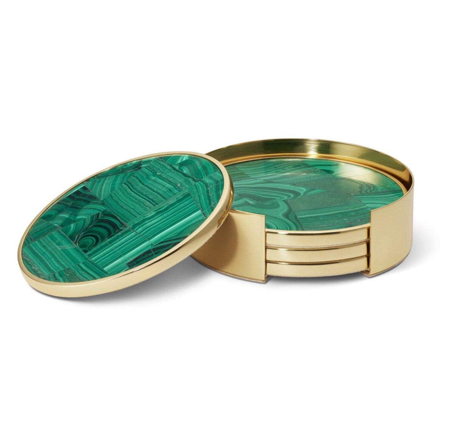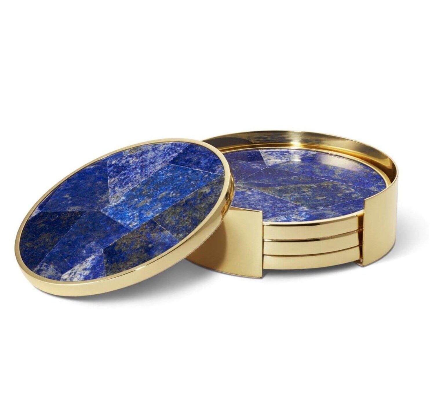 This set of four coasters adds a sophisticated touch to entertaining. Topped with semi-precious blue stone arranged in a traditional mosaic design, and edged in warm gold, the four coasters can be stored in an attractive circular gold case. The Lapis coasters were inspired by the rich colors of European mosaic stone and tilework.