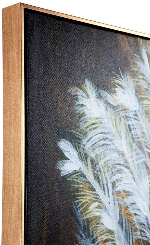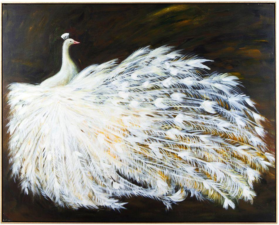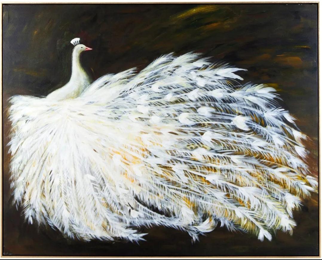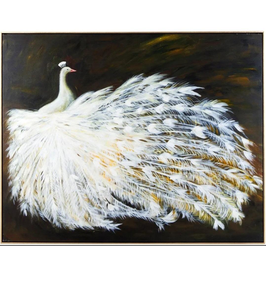 Grand Peacock Framed Canvas, Black base with gold glimmer and white peacock oil painting on canvas in Antique gold frame. Each work of art is unique and individually hand painted by international artists, slight variances may occur in colour and texture.