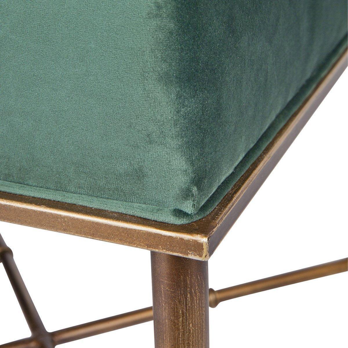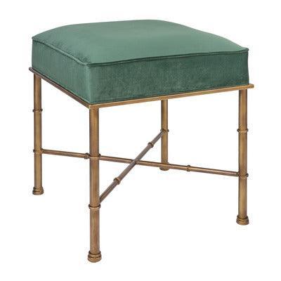 Add a touch of Hollywood Regency to your boudoir or living space with the Hacienda Stool, a rich combination of antique gold and luxurious Roche Green velvet upholstery.