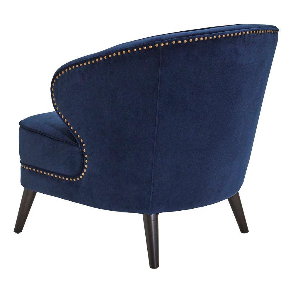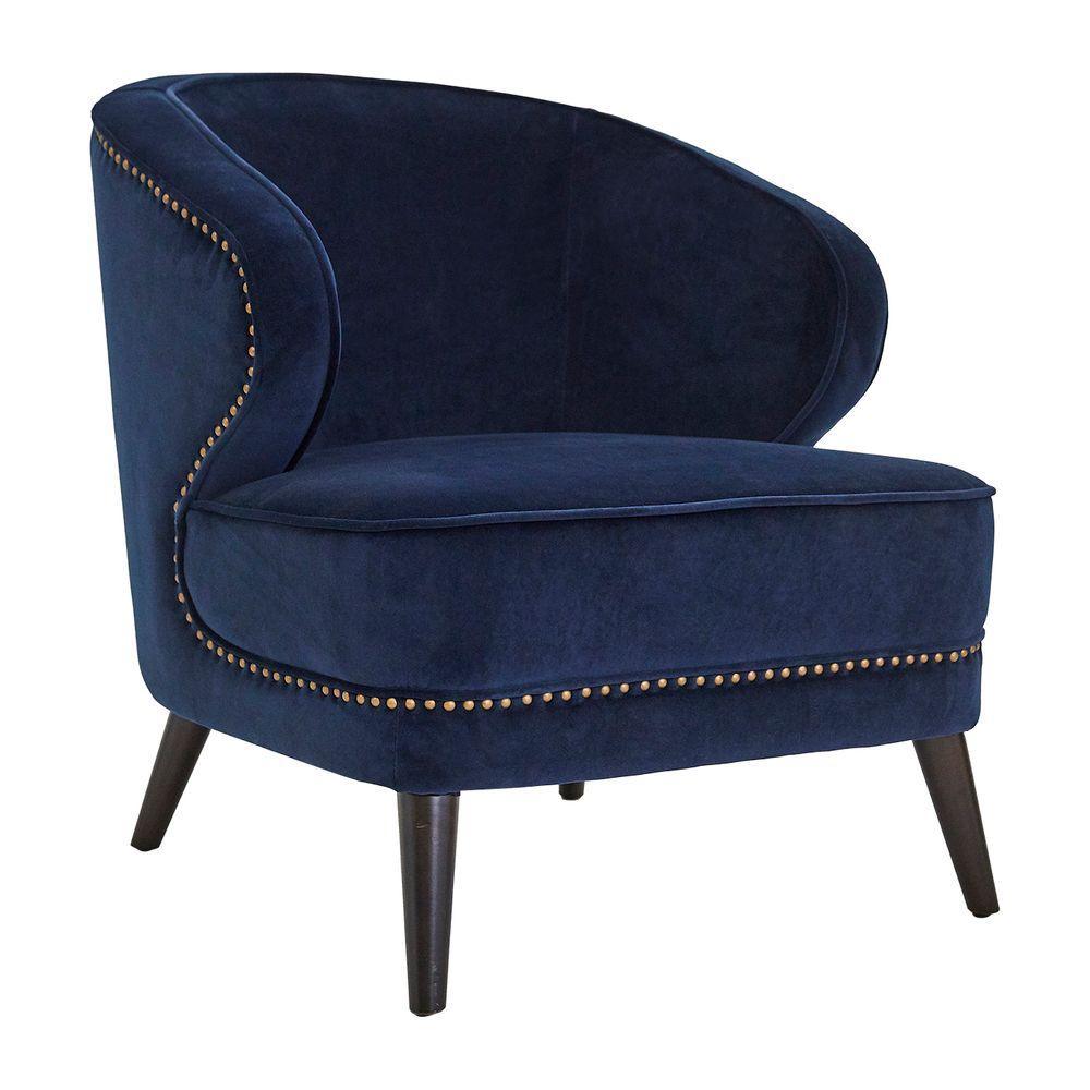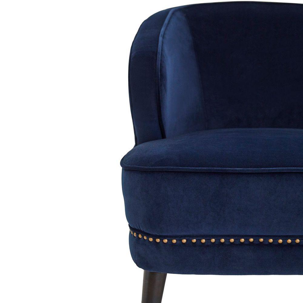 Navy velvet upholstered arm chair with detailed bronze studs and piping with black timber legs.