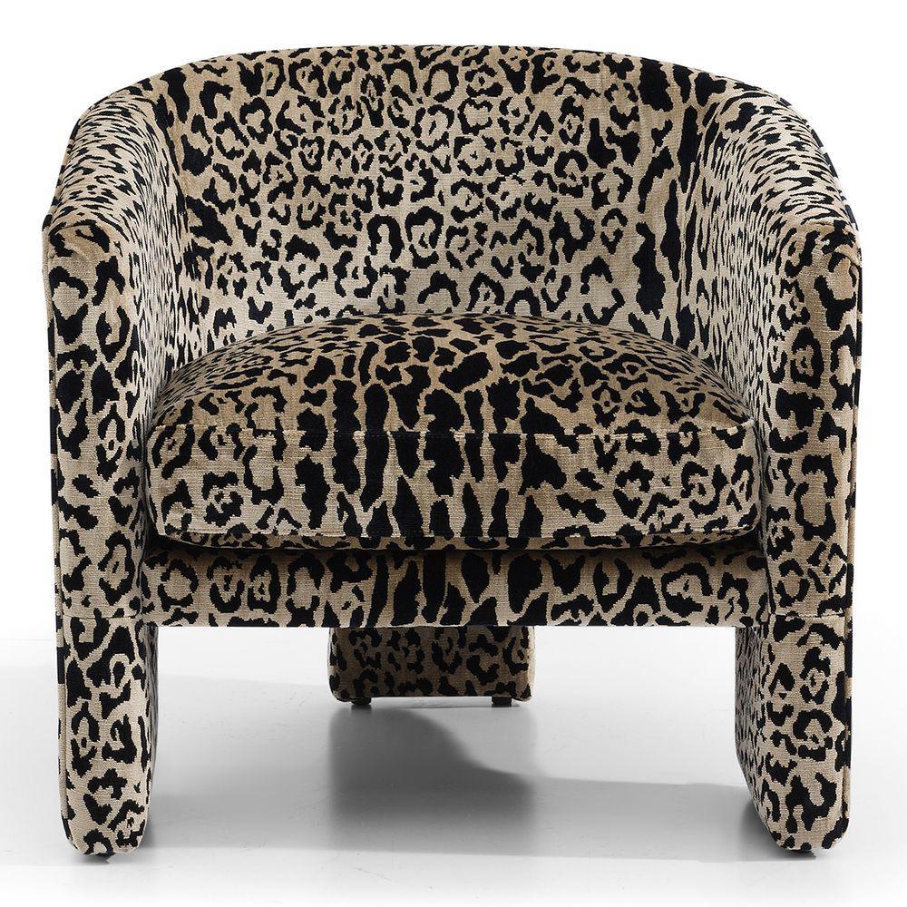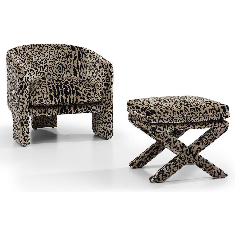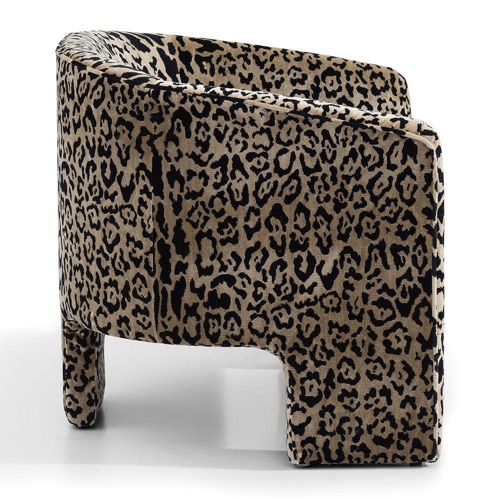 Leopard chenille velvet upholstered occasional arm chair, curve style with tripod fully upholstered legs with detailed piping around the sides and back of the chair. Matching ottoman also available.