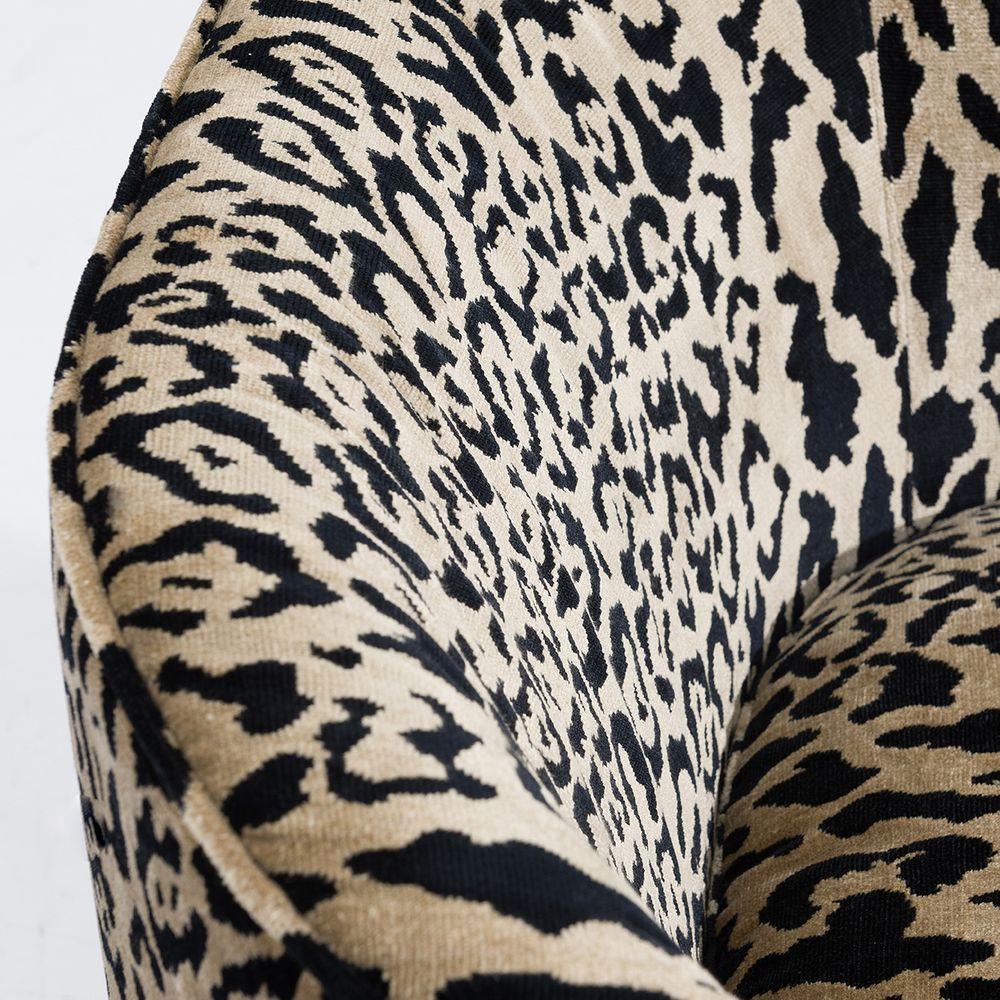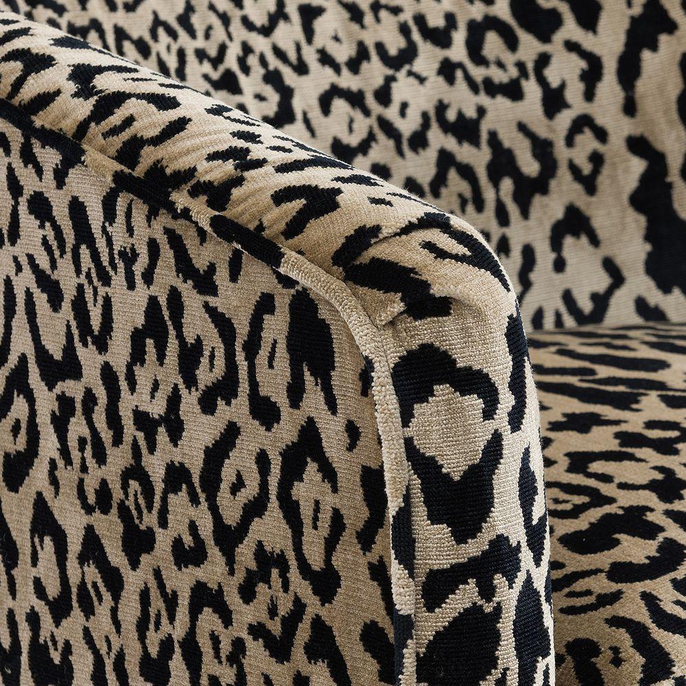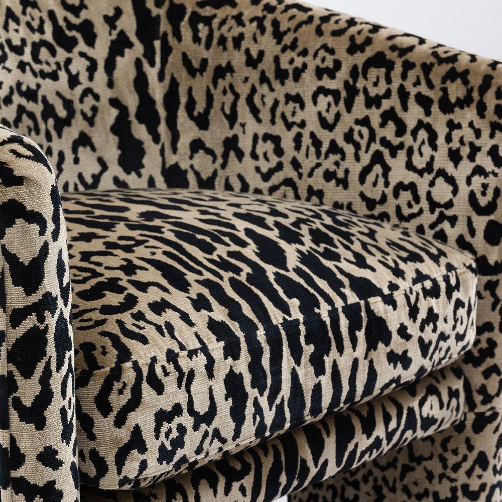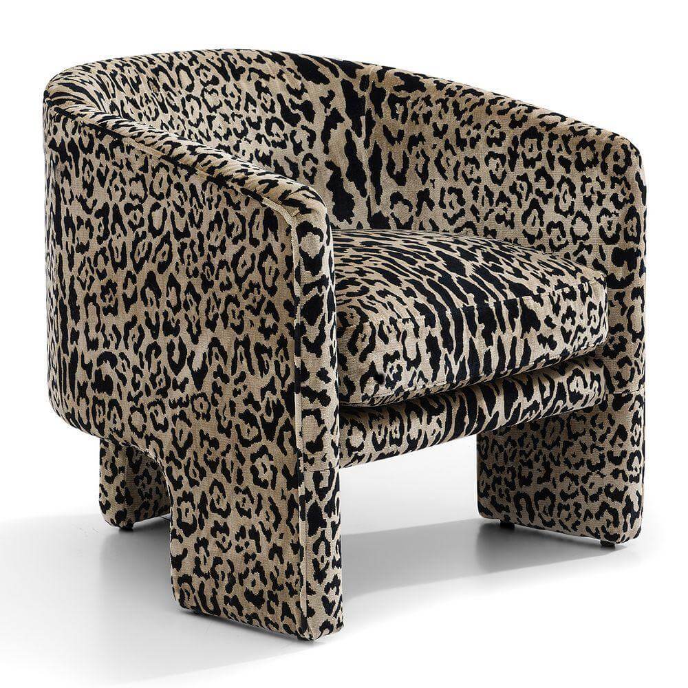 Leopard chenille velvet upholstered occasional arm chair, curve style with tripod fully upholstered legs with detailed piping around the sides and back of the chair. Matching ottoman also available.