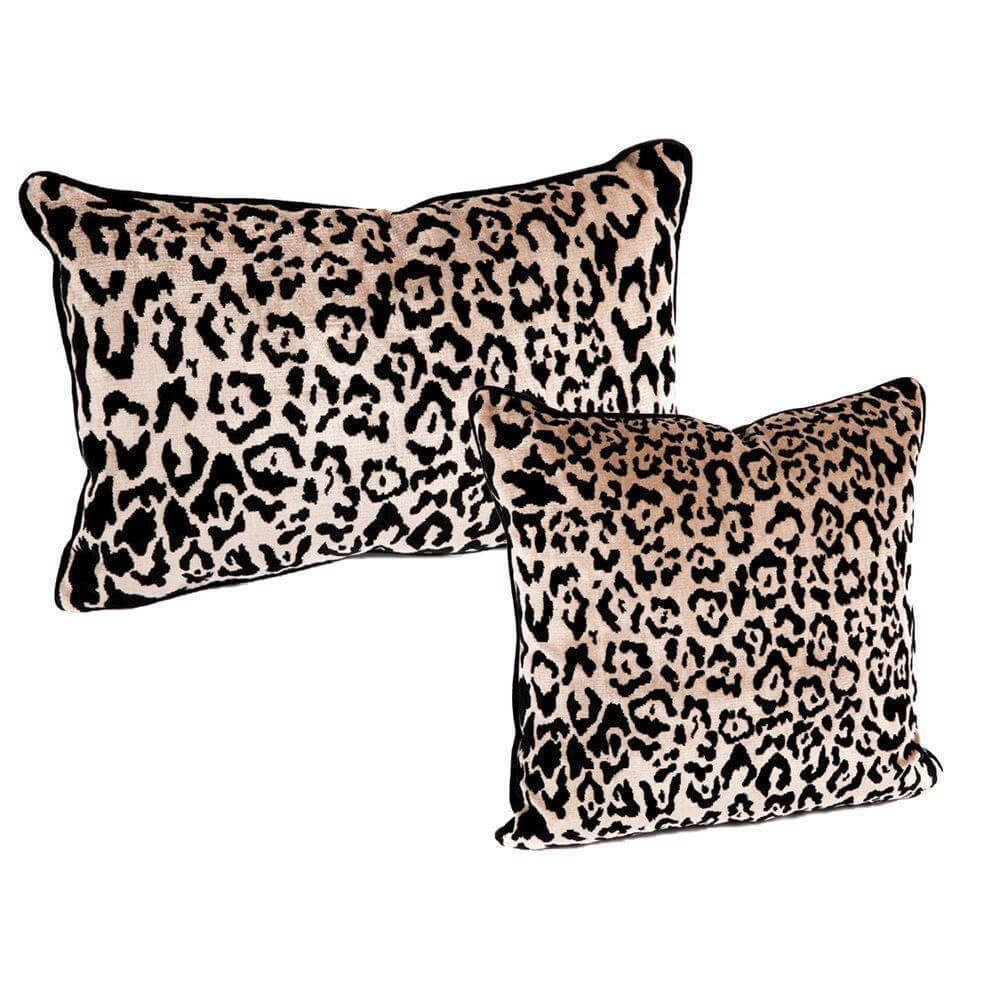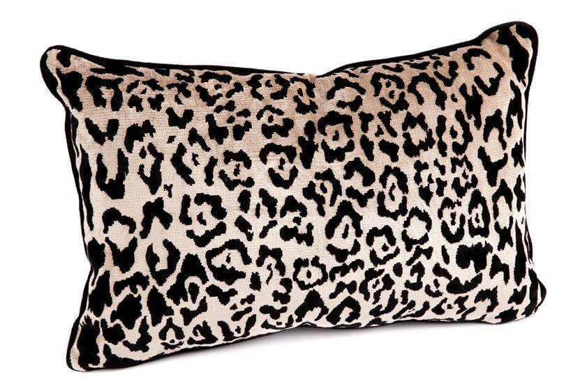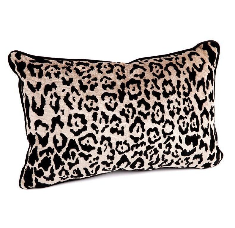 Halston Leopard chenille velvet rectangle cushion with black velvet back and piping.