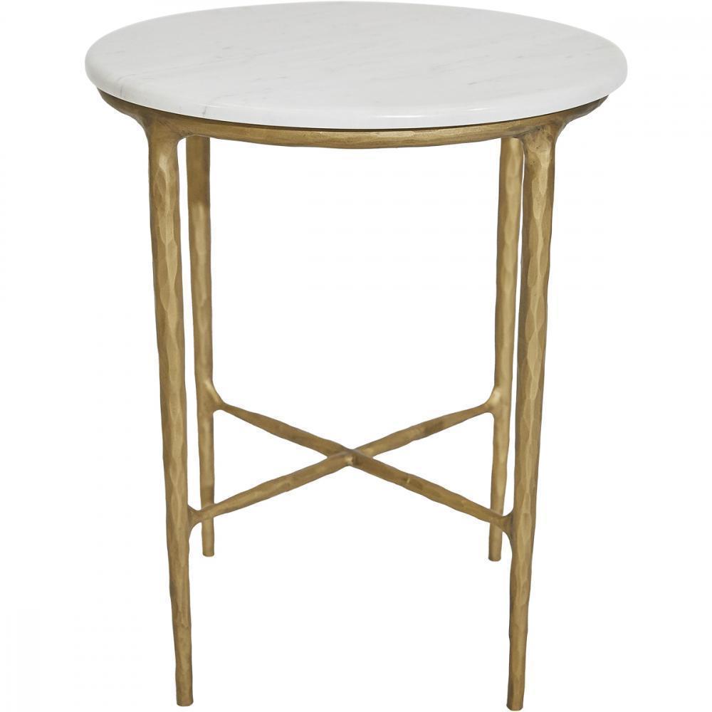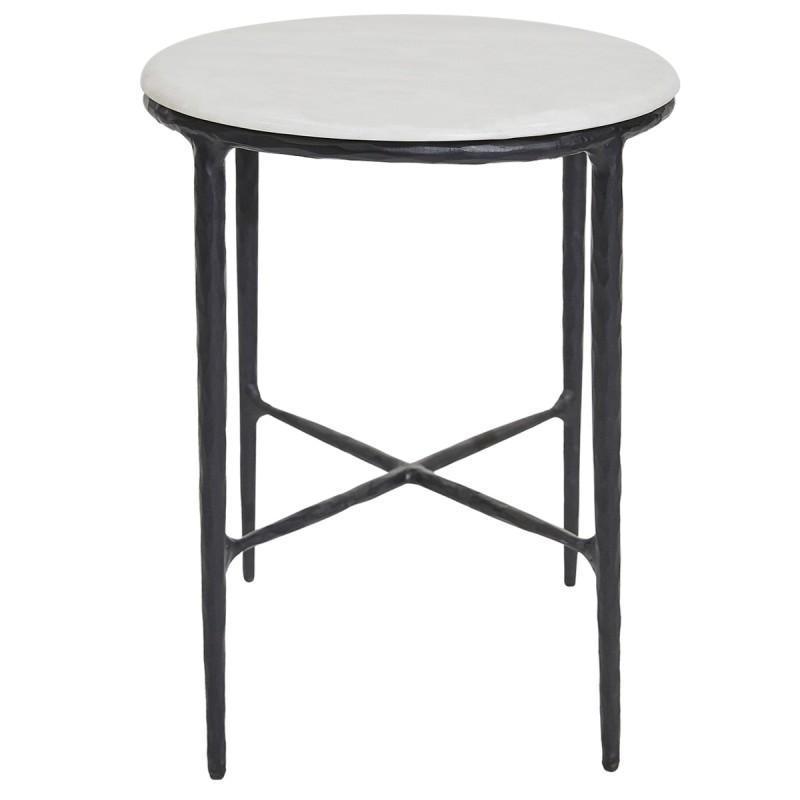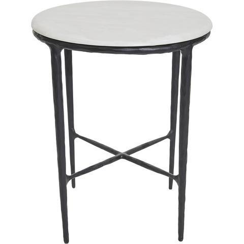The self assured sophistication of hand forged iron and marble occasional furniture captures modern American design. Grounded in mid-century style, lines are soft and simple with an edgy mix of materials. Elegance without cumbersome adornment. Greek marble tabletop with round edge – variations in colour and markings will occur as marble is a natural stone