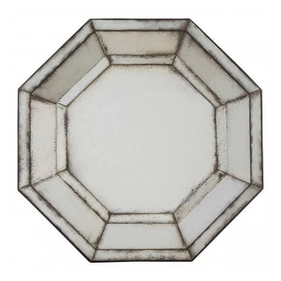 Created from antique finish glass, the wall mirror features a subtly distressed aesthetic with foxed edges creating a dark outline.