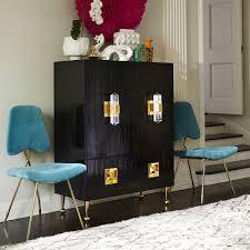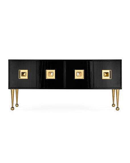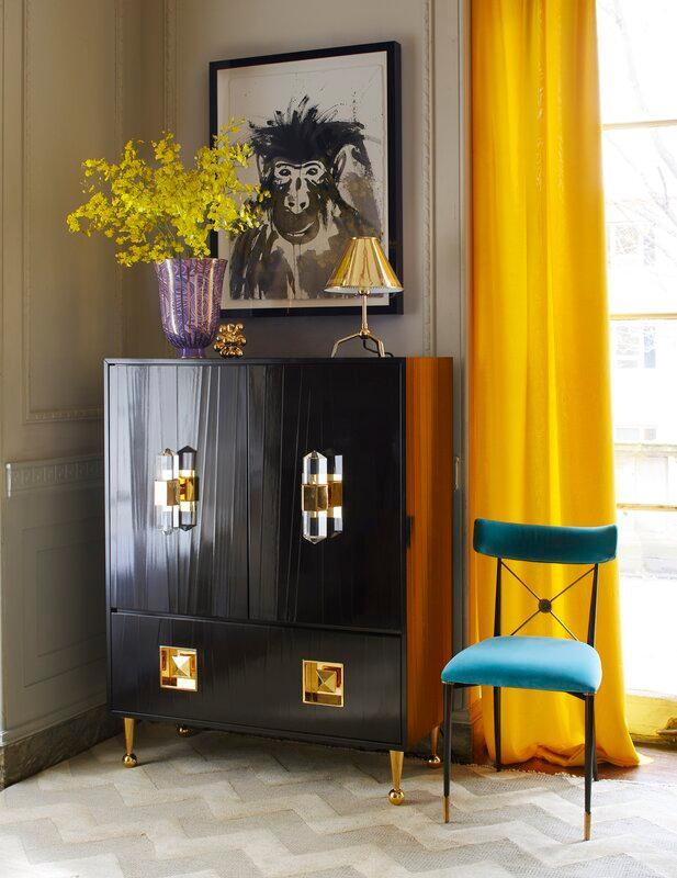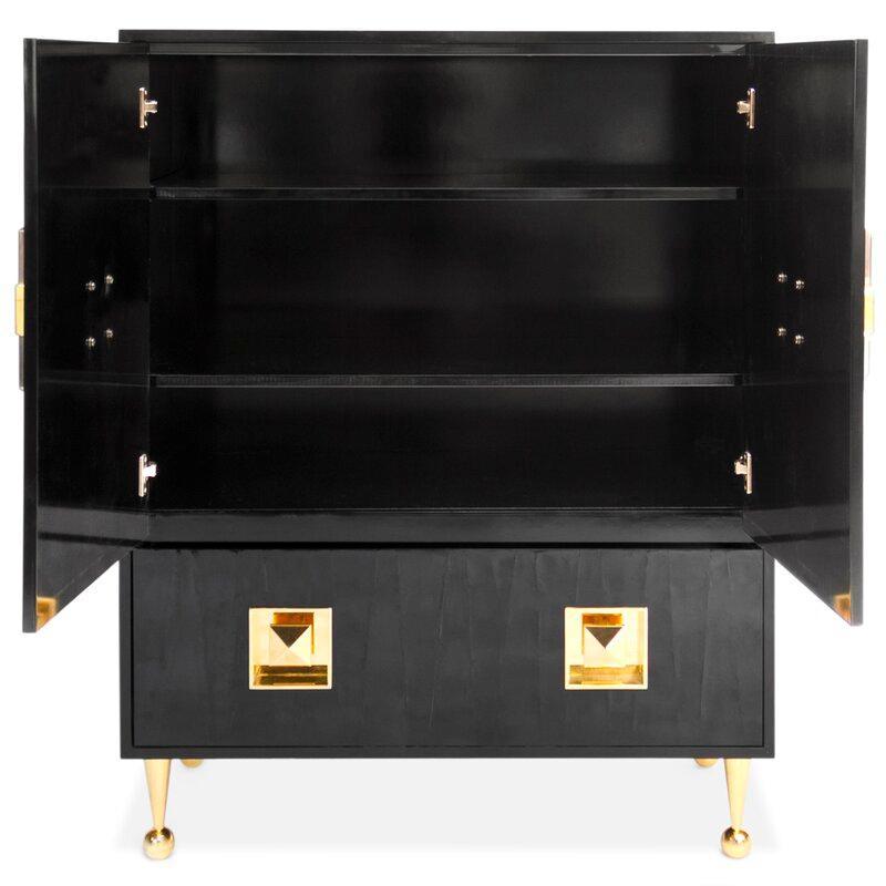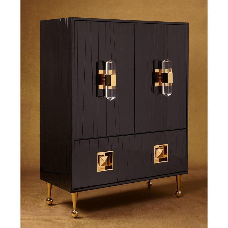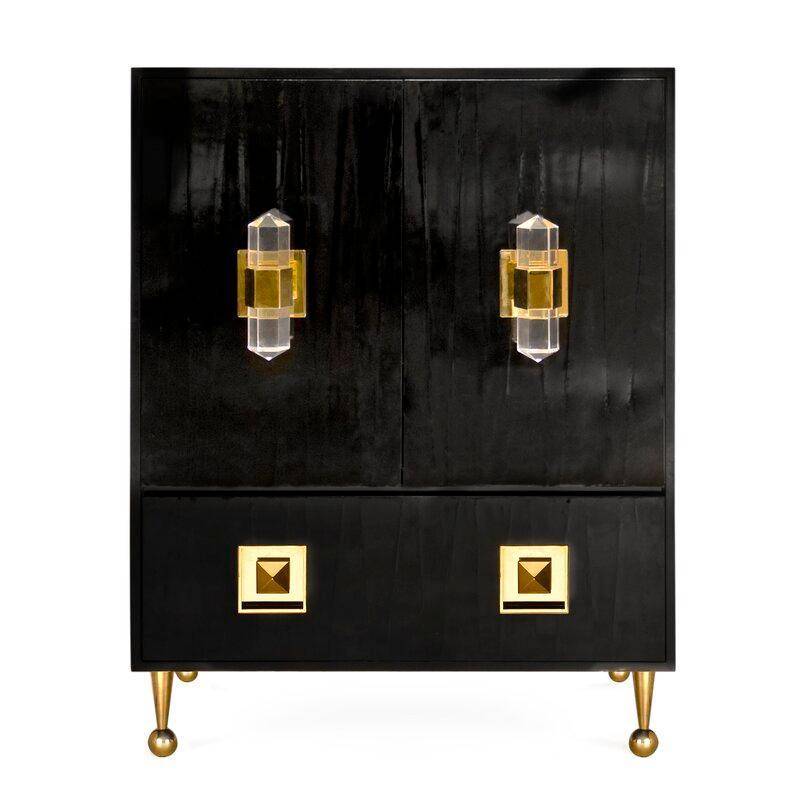 Hollywood glam and Studio 54 collide in our Crawford Cabinet. Glossy black lacquer featuring a subtle ripple texture is perched on our signature ball and cone polished brass legs. The pièce de résistance—faceted acrylic pulls that feel like giant gems. The perfect bar for a bachelor’s lair or a starlet’s penthouse. Hand-applied cracked lacquer finish with Polished brass legs. Top cabinet features two interior shelves. Single bottom drawer with two recessed brass pulls. Matching designs available in this stunning collection.