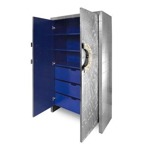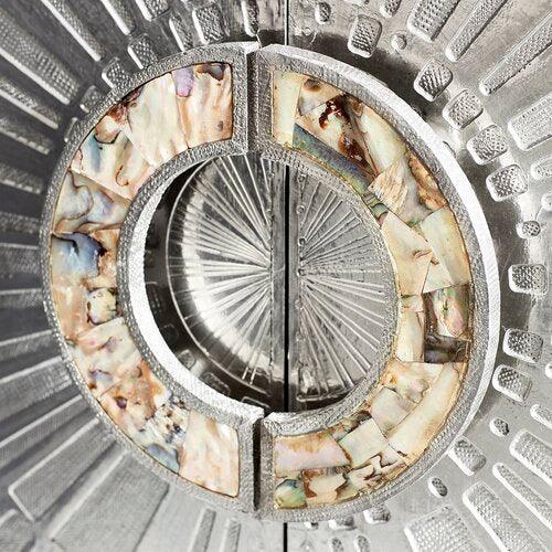 Crafted from nickel-plated metal with hand-stamped patterns applied to minimalist and modernist forms. The surface is reminiscent of silver leaf, it emits that same lustrous glow, but is wonderfully durable. With abalone-encrusted handles and an organic modern starburst pattern on the doors.